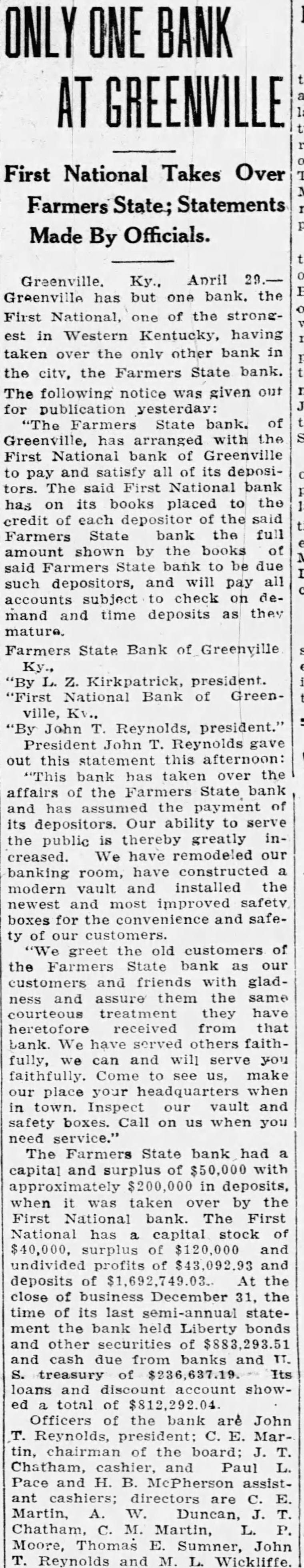 BANK GREENVILLE First National Takes Over Farmers State; Statements Made By Officials. Greenville. Ky., April Greenville has but one bank. the First National, one of the strongest in Western Kentucky, having taken over the only other bank in the city, the Farmers State bank. The following notice was given out for publication yesterday: "The Farmers State bank. of Greenville, arranged with the First National bank of Greenville pay and satisfy all of its depositors. The said First National bank has on its books placed to the credit of each depositor the said Farmers State bank the full amount shown by the books said Farmers State bank to be due such depositors, and will pay accounts subject check on mand and time deposits as they mature. Farmers State Bank of Greenville Kirkpatrick, president. "First Bank of Greenville, "By John Reynolds, president." John gave this this afternoon: bank has taken over the affairs of the Farmers State bank and the its depositors. Our ability to the public thereby greatly increased. We have remodeled banking room, have constructed modern vault and installed the newest and most improved safety boxes convenience and safety of our customers. greet old customers of the Farmers State bank our customers and friends with gladness assure them same courteous treatment they have heretofore received from bank. We have served others faithfully, we and will serve you faithfully. Come make our place your headquarters when in town. Inspect vault and safety boxes. Call on us when you need The Farmers State bank had capital and surplus of with in deposits, when taken over by the First National bank. The First National has capital stock $40,000. surplus and undivided profits and deposits At the close of business December the time of its last semi-annual statement the bank held Liberty bonds and other securities of and cash due from banks and treasury Its loans and account showed total of Officers of the bank are John Reynolds, president: Martin, chairman of the board: Chatham, and Paul Pace H. McPherson assistant cashiers; directors Martin, Chatham, M. Martin, Moore, Thomas Sumner, John Reynolds and M. L. Wickliffe.