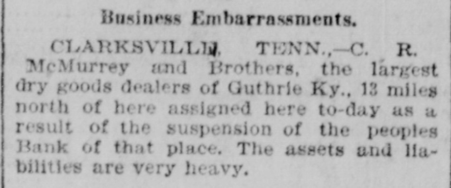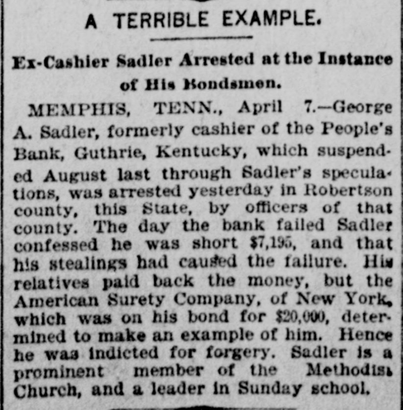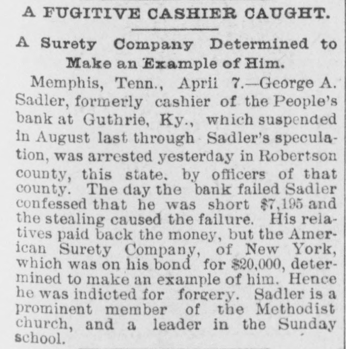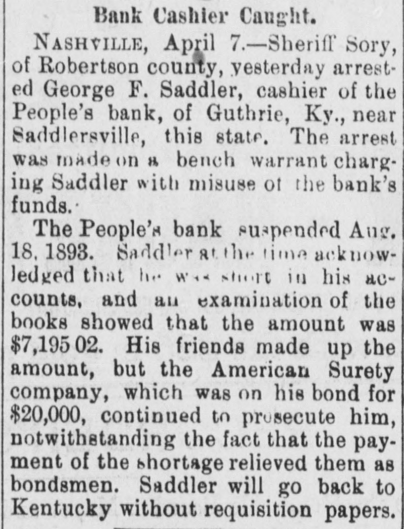 George F. Saddler the defaulting cashier of the People's bank of Guthrie, Ky., which suspended several months ago, has been arrested at the instance of the American Surety company, which was on his bond for $20,000, and which continues to prosecute him although his friends made up his shortage.