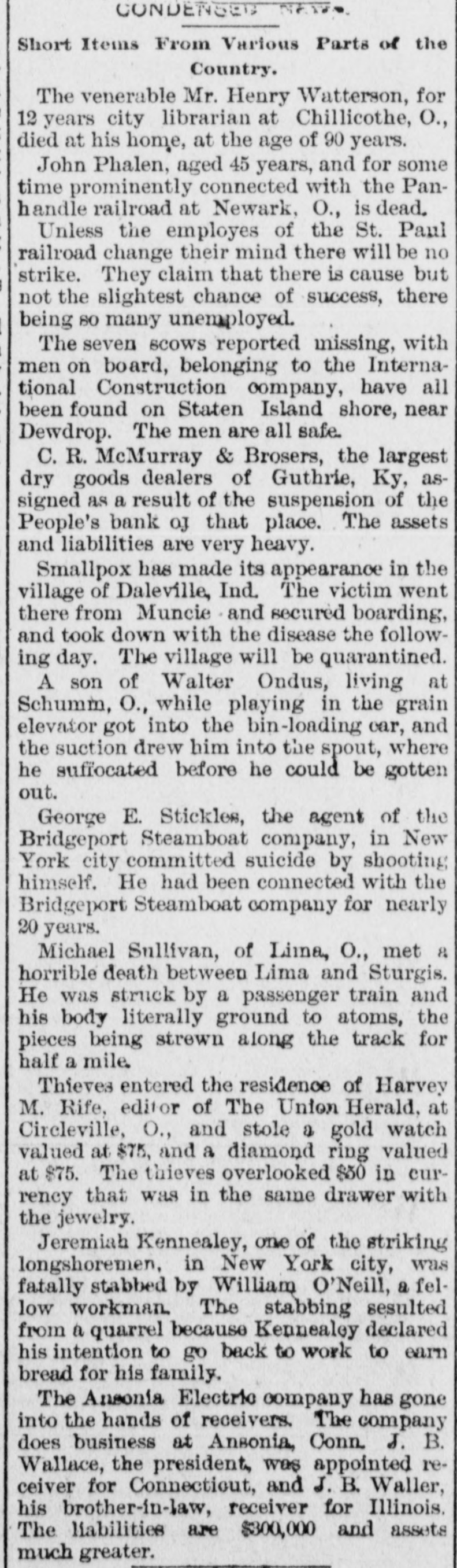 During riots between strikers and workmen in the Pittsburg, Pa., coke region, four men have been killed, among them Joe H. Paddock, chief engineer at Scottsdale. His murder was one of revolting brutality. Coming out the mine with his instruments he was set upon by the mob of Huns and Slavs and bitten, kicked and shot out of all human semblance, in sight of his home, and his body thrown from a window into the burning coke ovens forty feet below. Ninety-two of the rioters are now in jail, charged with murder. Three Hugarians were killed and ten are reported fatally wounded by officers and posse pursuing the