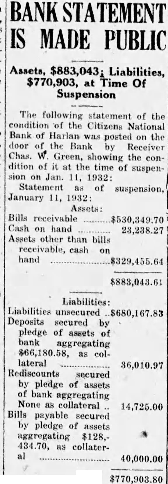 MADE PUBLIC Assets, Liabilities, $770,903, at Time Of Suspension The following statement of the condition of the Citizens National Bank of Harlan was posted on the door of the Bank by Receiver Chas. W. Green, showing the condition of it the time of suspension on Jan. 11, 1932: Statement as of suspension, January 11, 1932: Assets: Bills receivable $530,349.70 Cash on hand 23,238.27 Assets other than bills receivable, cash on hand $883,043.61 Liabilities: Liabilities unsecured Deposits secured by pledge of assets of bank aggregating as collateral 36,010.97 Rediscounts secured by pledge of assets of bank aggregating None as collateral 14,725.00 Bills payable secured by pledge of assets aggregating 434.70, as collateral 40,000.00 $770,903.80