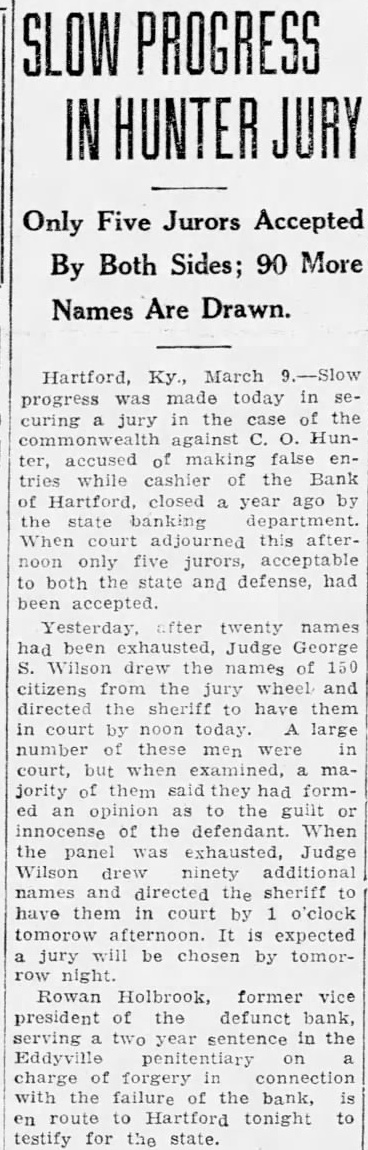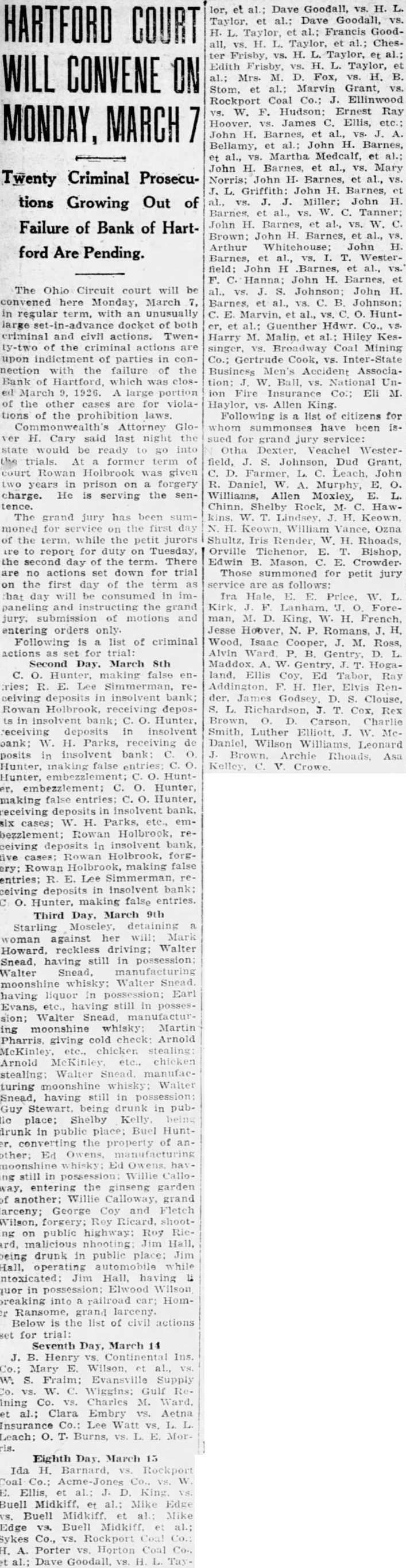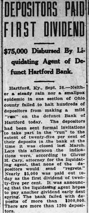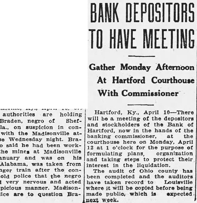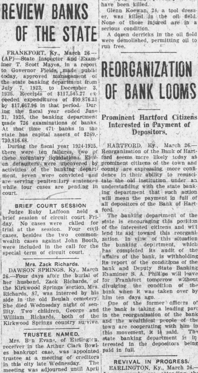 REVIEW BANKS OF THE STATE FRANKFORT. Ky., March 26 (AP) State Inspector and Examiner T. Scott Mayes, in report REORGANIZATION to Governor Fields, made public today, approved management of the state banking department from July 1923. to December 3, OF BANK LOOMS 1925. Receipts of $117,545.27 exceeded expenditures of 876.31 by $17,667.96 in that period. Dur ing the fiscal year ended June 1925, the banking department Prominent Hartford Citizens made 726 examinations of banks. Interested in Payment of At that time 471 banks in the Depositors. state has capital assets of $269, During the fiscal year 1924-1925, there were ten failures, two of Reorganization of the Bank of Hartthese voluntary liquidations. ford seems likely today as silk combina activities of the banking depart county are expressing more confiment, seven were convicted and dence in their ability to resusciare serving penitent sentences tate the old institution under an while four cases are pending in understanding with the state bankcourt. ing department that such action all depositors of the Bank of Hart BRIEF COURT SESSION ford. Judge Ruby Laffoon held a The banking department of the brief of circuit court Frisession day. No cases were called for state is encouraging this position trial at the session. Four civil of the interested and will cases, besides the two common- lend its aid toward this reorganiwealth cases against John Booth, zation. In view of this situation the banking department, which were included in the call for the has completed its audit of the special term of circuit court. affairs of the bank, is withholding its report of the conditions of the Mrs. Zack Richards. March bank and Deputy State Banking DAWSON Ky. Examiner S. A. Phillips will leave -Four days after the burial of 26. her husband, Zack Richards, of for Frankfort tomorrow without the Kirkwood Springs section, Mrs divulging the condition of the Richards, 87, was interred by his bank when it was taken over by side in the old Beulah cemetery. him ten days ago. She died Wednesday night of sen- One of the former officers of flity Two children, George and the bank is taking a leading part William Richards, both of the in the reorganization wealthiest people of the of bank the and the Kirkwood Springs country survive. this movement, it is said. The TRUSTEE NAMED. state banking department is in Mrs. Ben Evans, of Earlington. terested in the depositors being receiver in the Arthur Clark Bowlpaid in full. es bankrupt case, was appointed trustee at a meeting of creditors REVIVAL IN PROGRESS/ in this city late Wednesday. The EARLINGTON, Ky., March 26.meeting was adjourned until April