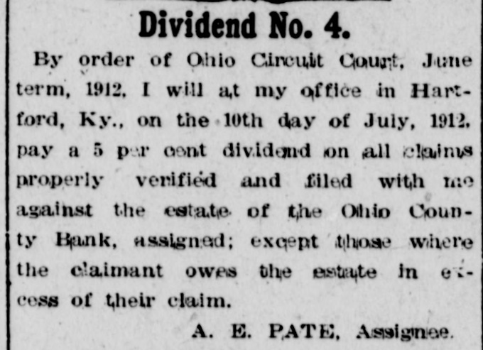 Dividend No. 4. By order of Ohio Circuit Court, June term, 1912, I will at my office in Hartford, Ky., on the 10th day of July, 1912. pay a 5 per cent dividend on all claims properly verified and filed with me against the estate of the Othio County Bank, assigned; except those where the claimant owes the estate in excess of their claim. A. E. PATE, Assignee.
