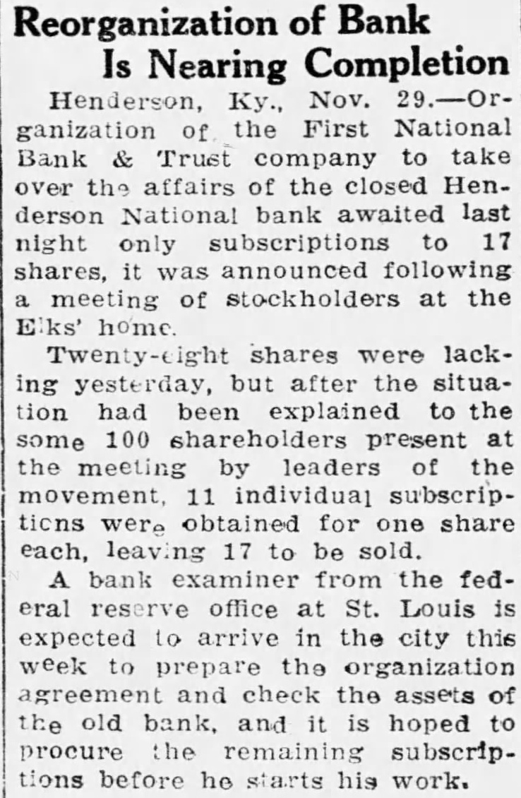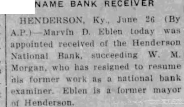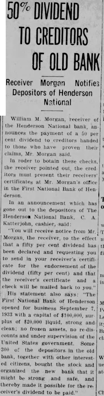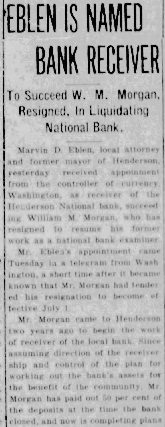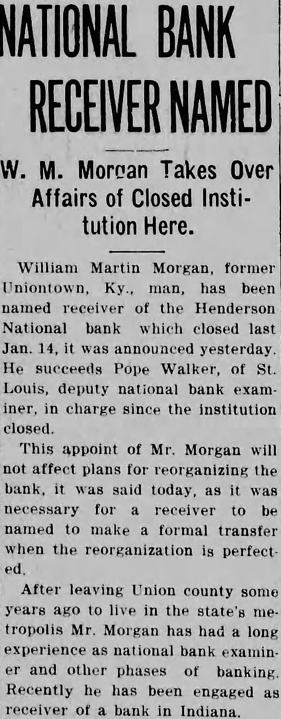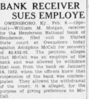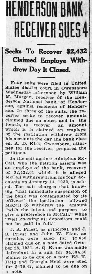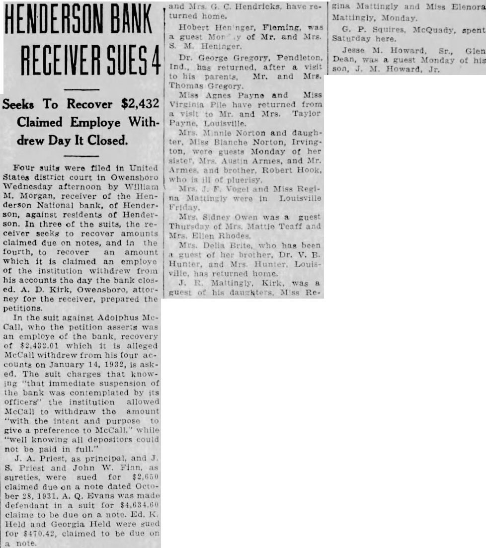 Four suits were filed in United States district court in Owensboro Wednesday afternoon by William M. Morgan, receiver of the Henderson National bank, of Henderson, against residents of Henderson. In three of the suits, the receiver seeks to recover amounts claimed due on notes, and in the fourth, to recover an amount which it is claimed an employe of the institution withdrew from his accounts the day the bank closed. A. D. Kirk, Owensboro, attorney for the receiver, prepared the In the suit against Adolphus McCall, who the petition asserts was an employe of the bank, recovery of $2,432 01 which it is alleged McCall withdrew from his four accounts on January 14, 1932, is asked. The suit charges that knowing "that immediate suspension of the bank was contemplated by its officers' the institution allowed McCall to withdraw the amount "with the intent and purpose to give preference to McCall, while "well knowing all depositors could not be paid in full." A. Priest, as principal, and J S. Priest and John W. Finn. as sureties, were sued for $2,650 claimed due on note dated October 28, 1931. A. Q. Evans made defendant in suit for $4,634.60 claime to be due on note. Ed. K. Held and Georgia Held were sued for $470.42, claimed to be due on a note. and Mrs G. C. Hendricks, have returned home. Hobert Heninger, Fleming. was a guest Mon of Mr. and Mrs. S. M. Heninger. Dr. George Gregory, Pendleton. Ind., has returned. after a visit to his parents, Mr. and Mrs. Thomas Gregory Miss Agnes Payne and Miss Virginia Pile have returned from visit Mr. and Mrs. Taylor Payne, Louisville Mrs. Minnie Norton and daughter, Miss Blanche Norton, Irvington, were guests Monday of her sister, Mrs. Austin Armes, and Mr. Armes and brother. Robert Hook, who is of pluerisy Mrs Voget and Miss Regina Mattingly were in Louisville Mrs. Sidney Owen was a guest Thursday of Mrs. Mattie Teaff and Mrs. Ellen Mrs. Delia Brite, who has been guest of her brother. Dr. V. B Hunter, and Mrs Hunter, Louisville, has returned home. J. R. Mattingly Kirk, was a guest of his daughters. SS Re- gina Mattingly and Miss Elenora Mattingly, Monday. G. P. Squires, McQuady, spent Saturday here. Jesse M. Howard, Sr., Glen Dean, was guest Monday of his son, J. M. Howard, Jr.