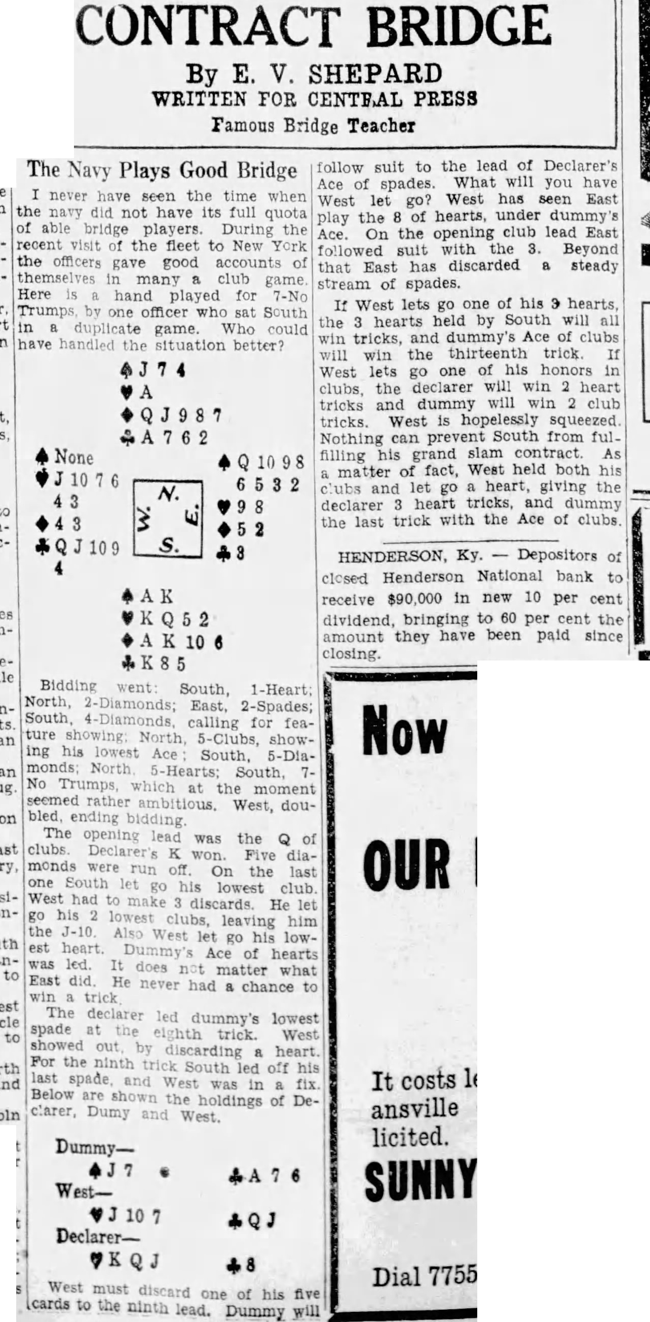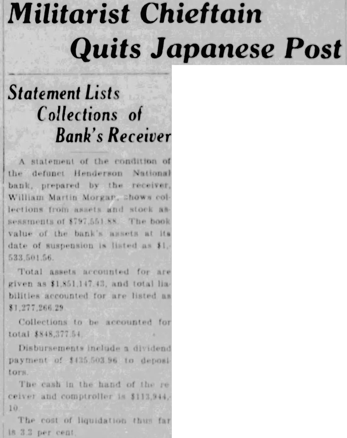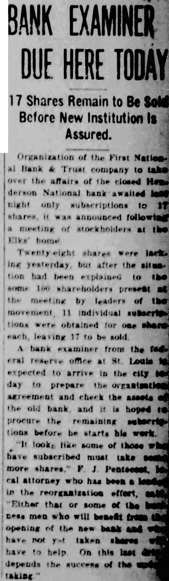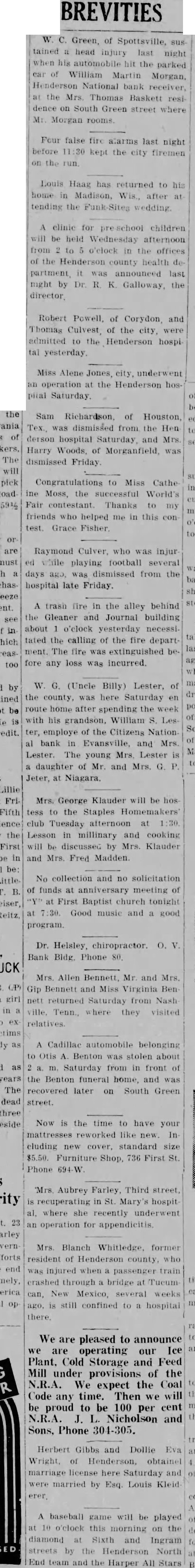 Four suits were filed in United States district court in Owensboro Wednesday afternoon by William M. Morgan, receiver of the Henderson National bank, of Henderson, against residents of Henderson. In three of the suits, the receiver seeks to recover amounts claimed due on notes, and in the fourth, to recover an amount which it is claimed an employe of the institution withdrew from his accounts the day the bank closed. A. D. Kirk, Owensboro, attorney for the receiver, prepared the In the suit against Adolphus McCall, who the petition asserts was an employe of the bank, recovery of $2,432 01 which it is alleged McCall withdrew from his four accounts on January 14, 1932, is asked. The suit charges that knowing "that immediate suspension of the bank was contemplated by its officers' the institution allowed McCall to withdraw the amount "with the intent and purpose to give preference to McCall, while "well knowing all depositors could not be paid in full." A. Priest, as principal, and J S. Priest and John W. Finn. as sureties, were sued for $2,650 claimed due on note dated October 28, 1931. A. Q. Evans made defendant in suit for $4,634.60 claime to be due on note. Ed. K. Held and Georgia Held were sued for $470.42, claimed to be due on a note. and Mrs G. C. Hendricks, have returned home. Hobert Heninger, Fleming. was a guest Mon of Mr. and Mrs. S. M. Heninger. Dr. George Gregory, Pendleton. Ind., has returned. after a visit to his parents, Mr. and Mrs. Thomas Gregory Miss Agnes Payne and Miss Virginia Pile have returned from visit Mr. and Mrs. Taylor Payne, Louisville Mrs. Minnie Norton and daughter, Miss Blanche Norton, Irvington, were guests Monday of her sister, Mrs. Austin Armes, and Mr. Armes and brother. Robert Hook, who is of pluerisy Mrs Voget and Miss Regina Mattingly were in Louisville Mrs. Sidney Owen was a guest Thursday of Mrs. Mattie Teaff and Mrs. Ellen Mrs. Delia Brite, who has been guest of her brother. Dr. V. B Hunter, and Mrs Hunter, Louisville, has returned home. J. R. Mattingly Kirk, was a guest of his daughters. SS Re- gina Mattingly and Miss Elenora Mattingly, Monday. G. P. Squires, McQuady, spent Saturday here. Jesse M. Howard, Sr., Glen Dean, was guest Monday of his son, J. M. Howard, Jr.