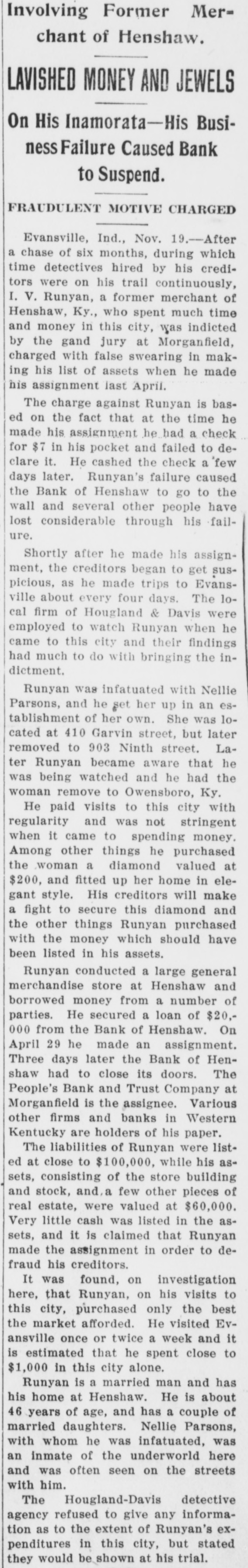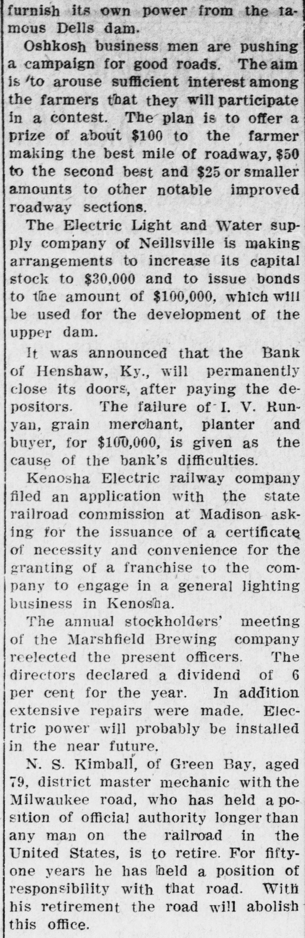 furnish its own power from the tamous Dells dam. Oshkosh business men are pushing a campaign for good roads. The aim is to arouse sufficient interest among the farmers that they will participate in a contest. The plan is to offer a prize of about $100 to the farmer making the best mile of roadway, $50 to the second best and $25 or smaller amounts to other notable improved roadway sections. The Electric Light and Water supply company of Neillsville is making arrangements to increase its capital stock to $30,000 and to issue bonds to the amount of $100,000, which will be used for the development of the upper dam. It was announced that the Bank of Henshaw, Ky., will permanently close its doors, after paying the depositors. The failure of I. V. Runyan, grain merchant, planter and buyer, for $100,000, is given as the cause of the bank's difficulties. Kenosha Electric railway company filed an application with the state railroad commission at Madison asking for the issuance of a certificate of necessity and convenience for the granting of a franchise to the company to engage in a general lighting business in Kenosha. The annual stockholders' meeting of the Marshfield Brewing company reelected the present officers. The directors declared a dividend of 6 per cent for the year. In addition extensive repairs were made. Electric power will probably be installed in the near future. N. S. Kimball, of Green Bay, aged 79, district master mechanic with the Milwaukee road, who has held a position of official authority longer than any man on the railroad in the United States, is to retire. For fiftyone years he has held a position of responsibility with that road. With his retirement the road will abolish this office.