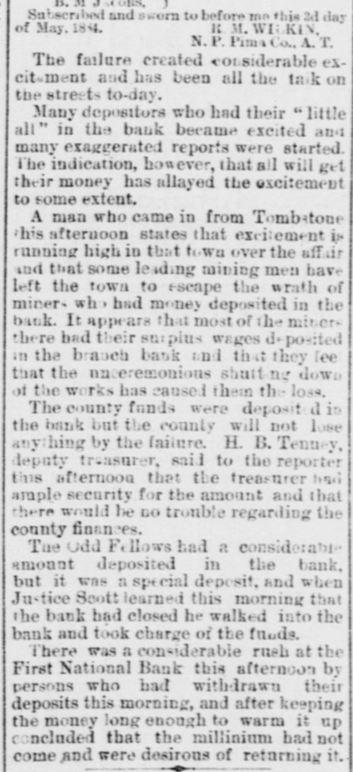 D. M Subscribed and sworn to before me this 3d day of May, 1834. It M. WICKIN N. P. Pima Co., A. T. The failure created considerable excitement and has been all the talk on the streets to-day. Many depositors who had their little all" in the bank became excited and many exaggerated reports were started The indication, however, that all will get their money has allayed the excitement to some extent. A man who came in from Tombstone his afternoon states that excitement is running high in that town over the affair and that some leading mining men have left the town to escape the wrath of miner who had money deposited in the bank. It appears that most of the miners there had their surplus wages d+ posited in the branch bank and th it they fee that the nnceremonious shutt ng down of the works has caused them the loss. The county funds were deposit a in the bank but the county will not lose anything by the failure. H. B. Tenney, deputy treasurer, said to the reporter this afternood that the treasurer had ample security for the amount and that there would be GO trouble regarding the county finances. Tue Odd Fellows had a considerable amount deposited in the bank, but it was a special deposit. and when Justice Scott learned this morning that the bank had closed he walked into the bank and took charge of the fueds. There was a considerable rueh at the First National Bank this afternoon by persons who had withdrawn their deposits this morning, and after keeping the money long enough to warm it up concluded that the millinium had not come ,and were desirous of returning it.
