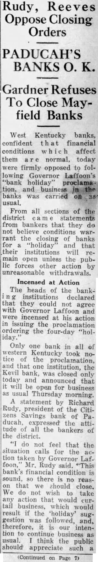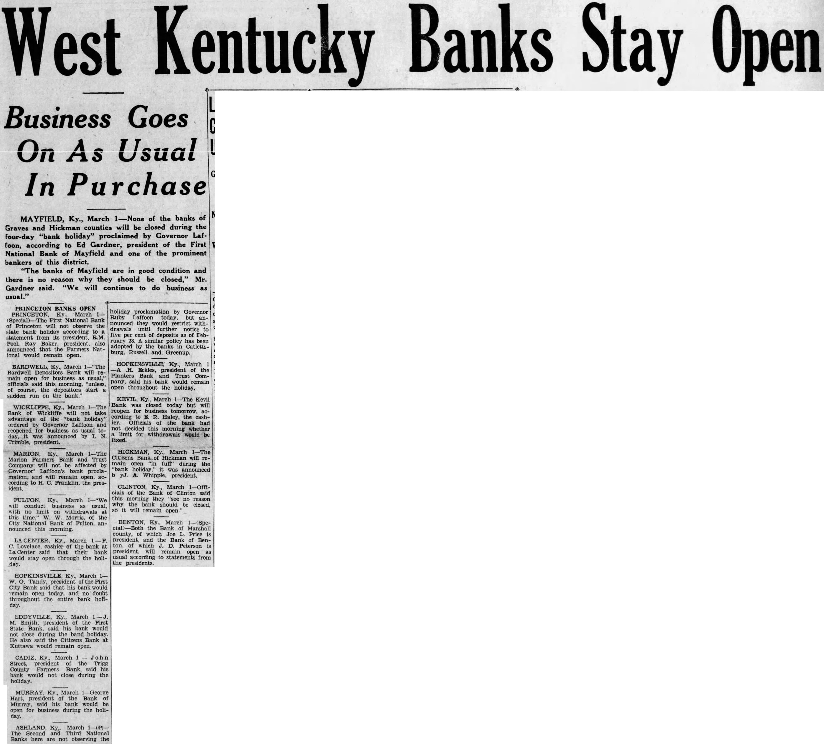 March of the banks of MAYFIELD, Ky., Graves and Hickman counties will be closed during the four-day "bank holiday" proclaimed by Governor Laffoon, according to Ed Gardner, president of the First National Bank of Mayfield and one of the prominent bankers of this district. "The banks of Mayfield are in good condition and there is no reason why they should be closed," Mr. Gardner said. "We will continue to do business as usual."