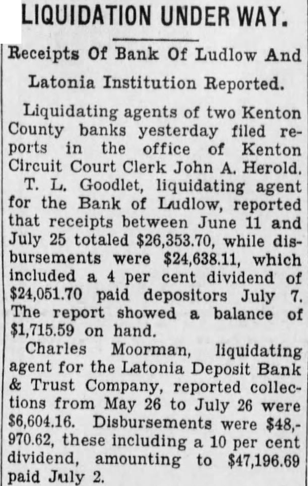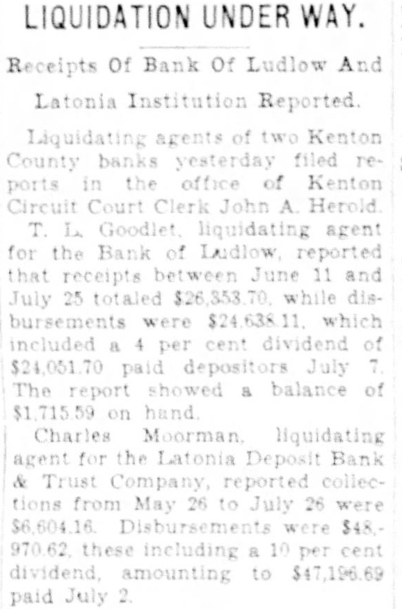 Liquidating agents of two Kenton County banks yesterday filed reports in the office of Kenton Circuit Court Clerk John Herold. Goodlet, liquidating agent for the Bank Ludlow, reported that receipts June 11 and July 25 totaled $26,353.70, while disbursements were $24,638.11, which included cent of $24,051.70 paid depositors July showed balance of $1,715.59 hand. Charles Moorman, liquidating agent for the Latonia Deposit Bank Trust Company, reported collections from May 26 to July 26 were $6,604.16. Disbursements were $48,970.62, these including 10 per cent dividend, amounting to $47,196.69 paid July