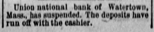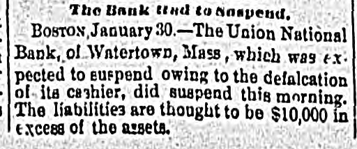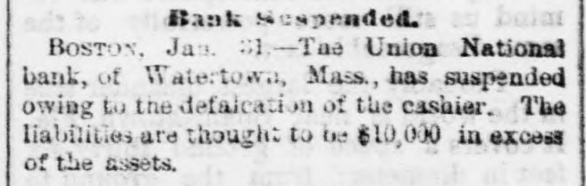 Professor Lenz, of Nuremberg, Germany, has received an order to cast a bronze statue of the late President Garfield, which is to be erected In San Francisco. Prof. Klinkerfues, the German astronomer, shot himself in the observatory at Gottingen, Germany, yesterday. The trial of George Alfred Townsend for libel of Joseph Hart, with damages set at $20,000, began in New York yesterday. The will of Dr. John R. Lee, of Hartford, Conn., among other bequests leaves $2,000 to the Hampton (Va.) Normal and Agricultural school. An unknown Hungarian, out of work and starving, committed suicide at West Newton, Pa, Sunday, by jumping in an air-hole in the ice. A man named Webb became involved in a dimculty in Jackson county, Ala., yesterday, with three brothers named Milburn, and he killed two of them and fatally wounded the third. All the compositorsemployed in the Evening News office, Philadelphia, were notified Saturday that their services were no longer required, and their places were soon afterwards supplied by non-union men. The amount of subscriptions received by the Boston Post to be given Lieut. Rhodes. of the cutter Dexter, for gallant conduct in connection with the City of Columbus disaster, is $1,180. Agnes Murphy, of Raymertown, N. Y., died Sunterday morning from poisoning. There are circumstances in the case which point to its being a life insurance murder. Wing Lee, a well-known Louisville Chinaman, was married in that city Monday to Miss Neille Burton, a prepossessing white girl. A MYSTERIOUS MURDER-The mutilated remains of Harvey Slacker, a prominent young man of Elizabeth, Pa., were found yesterday morning near Peter's creek trestle, two miles from Elizabeth. Blood was scattered over the snow for a distance of 100 yards, and there was evidence of a hard struggle. There is no clue to his murderer. ... THE OLD, OLD STORY.-Tilden G. Abbott, for ten years cashier of the Union Market National bank of Watertown, Mass., has absconded, taking funds of the bank aggregating as far as known $31,160. The bank will not open its doors to-day, and should there be a run it may close permanently. Abbott was of pleasing address, a member of the Baptist church, and until within six months ago was treasurer of the Watertown Savings bank. He is about forty years old, and has a wife and four children. It is believed that a woman is with him. A YOUNG WOMAN'S DEATH FROM MALPRACTICEMargaret Sauer, aged 21, died Sunday at the restdence of her married sister, Bertha Hauft, in New York, from the effects of malpractice. Dr. Wm. P; Merxes, who attended her; Mary Bachert, allas Preston, and Jacob Bachert, the brother of the preceding and the alleged lover of the victim, were arrested and held for examination. TWIN BABIES FROZEN TO DEATH.-A dispatch from Liberty Mills, Ind., says: "The twin babies or Isaac and Rebecca Martin were frozen to death Thursday night in their crib, which had been placed in a fireless room. They werethree months old. Martin visited the crib during the night and found one babe dead. The other was suffering severely, and soon died. The clothing was trozen to the bodies of the infants. PART OF THE BUZZARD BAND ARRESTED-Mrs. Abc Buzzard, wife of the notorious outlaw. and three members of the gang, named Hainey, Hornberger and Breneiser, were arrested on Ephrata mountain near Lancaster, Pa., Friday, the men being charged with felonious entry and larceny, and Mrs. Buzzard with receiving stolen goods. The arrest was effected on the information of a Philadelphia detective, who joined the band January 1 and has been traveling with it since. SAD EFFECT OF THE EMMA BOND TRIAL-There is a queer climax to the Emma Bond case. One of the jurors weeps constantly at home, and refuses to be comforted. Another one starts and runs whenever he hears any unusual noise, and another, Boone Isaacs, who was engaged to a young lady, has been jilted, and is now overcome with grief. SOME MODEST REFORMERS.-The second day's session of the New England Free-Thinkers' convention opened at Boston yesterday. A tree-thinkers' association was formed, with by-laws, demanding that churches should not be exempt from taxation; that the jndicial oath should be abolished; that all laws enforcing the observance of the Sabbath and Christian morality should be repealed; that the Bible should be removed from the puolic schools, and that governmental aid should be refused to sectarian schools. WHOLE FAVILY PATIONED wife of