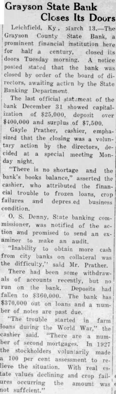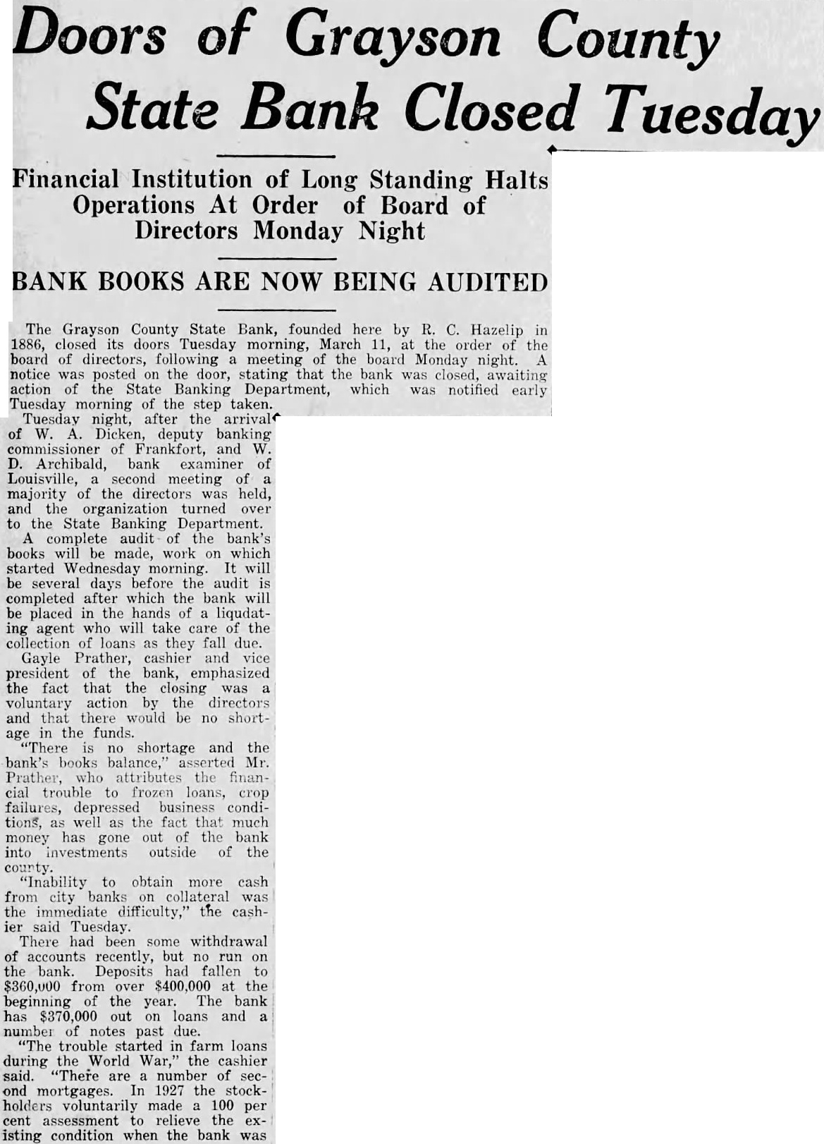 Doors of Grayson County State Bank Closed Tuesday Financial Institution of Long Standing Halts Operations At Order of Board of Directors Monday Night BANK BOOKS ARE NOW BEING AUDITED The Grayson County State Bank, founded here by R. C. Hazelip in 1886, closed its doors Tuesday morning, March 11, at the order of the board of directors, following meeting of the board Monday night. A notice posted on the door, stating that the bank was closed, awaiting action of the State Banking Department, which was notified early Tuesday morning of the step taken. Tuesday night, after the arrival of W. A. Dicken, deputy banking commissioner of Frankfort, and D. Archibald, bank examiner of Louisville, second meeting of majority of the directors was held, and the organization turned over to the State Banking Department. complete audit of the bank's books be made, work on which started Wednesday morning. It will be several days before the audit completed after which the bank will be placed in the hands of a liqudatagent who will take care of the collection of loans as they fall due. Gayle Prather, cashier and vice president of the bank, emphasized the fact that the closing was voluntary action by the directors and that there would be no shortin the funds. "There is no shortage and the bank's books balance,' asserted Mr. Prather, who attributes the finantrouble to frozen loans, crop failures, depressed business conditions, as well as the fact that much has out of the bank money gone into investments outside of the county "Inability to obtain more cash from city banks collateral was the immediate difficulty," the cashier said Tuesday. There had been some withdrawal of accounts recently, but no run on the bank. Deposits had fallen to $360,000 from over $400,000 at the beginning of the year. The bank has $370,000 out on loans and a number of notes past due. trouble started in farm loans during the World War," the cashier said. "There number of second mortgages. In 1927 the stockholders voluntarily made 100 per cent assessment to relieve the isting condition when the bank was