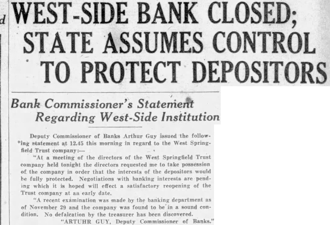 Having decided to and upon the the real the as the directors obtained the help outside chase the that the will be reliev. ed this burden. The plan has the support the and The latter ing splendidly with the the program, which the bank will not have to wait months deposits forced to for they will continue to advantages banking facilities in Went Springfield. The bank suspended and passed the custody of the state authorities Dec. follow. run by the suicide denials by officers bank that the had any the hundred smaller positors became panicky manded accounts Because the withdrawals decided the to this action with the