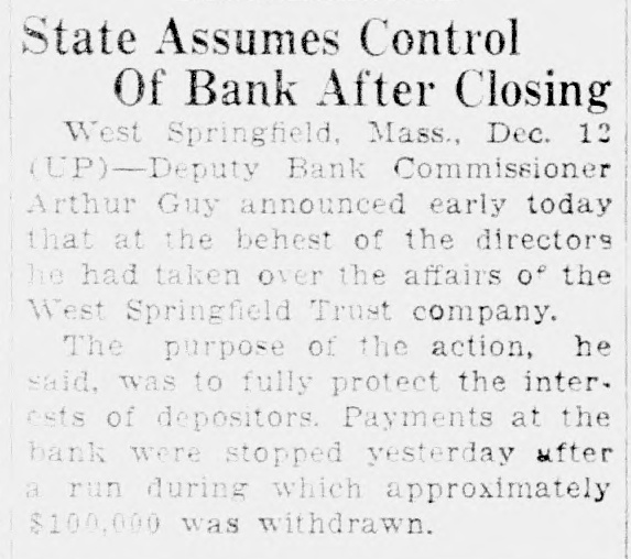 The bank voted to suspend payments this afternoon. ... The state formally took over the affairs of the West Springfield Trust company last night and the bank will not open its doors this morning.