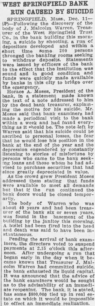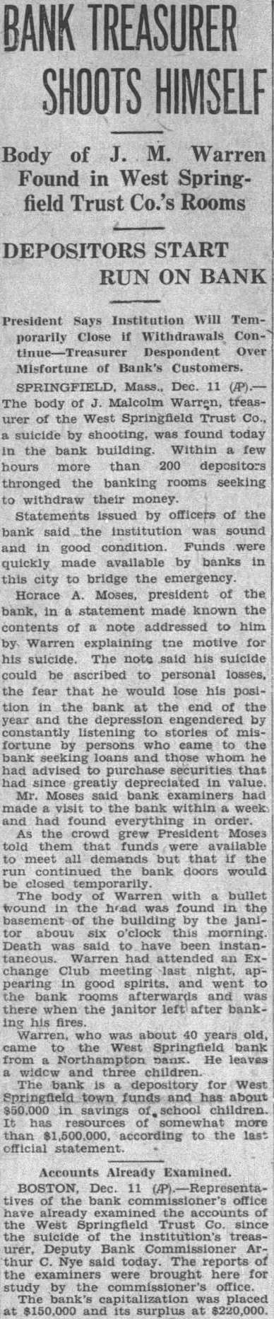 Dec. the discovery the of Malcolm Warren, Treasbody the West Springfield Trust in the mornwithin short some persons the seeking deposits. issued officers the bank were to effect that the institution sound and good funds banks this city to bridge over Moses, President of the Horace bank, made known the text note addressed to him the dead bank treasurer, for his suicide. Mr. had made visit the within week had found everything should Warren said that suicide ascribed personal losses, the fear that he his position in the bank of year listening stories persons came the bank ing loans those whom had vised securities had since greatly depreciated in value. grew Moses them that funds meet all the the bank doors would closed temporThe body of Warren who was and had been treasthe seven years, the the byNlet had fired into the death said to have been inPending the arrival of bank examiners, directors voted suspend 2.15 o'clock this afternoon. After that began early day came known that Warren suicide. the bank its liquid that the advice the bank examiners be sought to the advisability of an immediThe has tied in real to effect an immediate realization.
