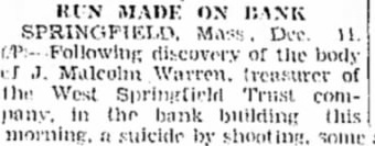 RUN FOR DEPOSITS FOLLOWS SUICIDE 200 Persons Throng West Springfield Bank This Morning TREASURER SHOOTS SELF J. Malcolm Warren Ends Life During Night-Widely Known in Musical Circles - President Says Money Safe. Springfield, Mass., Dec. 11 (AP) Following the discovery of the body of J. Malcolm Warren, treasurer of the West Springfield Trust company. in the bank building this morning, a suicide, a run of depositors developed and within a short time some 200 persons thronged the banking rooms seeking to get their deposits. Statements were issued by officers of the bank to the effect that the institution was sound and in good condition and funds were quickly made available by banks in tihs city to tide over the emergency. Moses Discloses Note Horace A. Moses, president of the bank, in a statement, made known the text of a note addressed to him by the dead bank treasurer explaining the motive for his suicide. Mr. Moses said that bank examiners had made a periodical visit to the bank within a week and had found everything as it should be. The note left by Warren said that his suicide could be ascribed to personal losses, the fear that he would lose his position in the bank at the end of the year and a feeling of depression engendered by constantly listening to (Continued on Page Two)