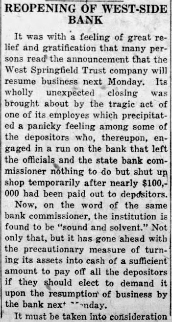 It was with feeling of great lief and gratification that many sons the announcement that the West Springfield Trust company will resume business Monday. Its wholly unexpected closing brought about by the tragic act of one its employes which precipitated panicky feeling among some of the depositors who, thereupon, gaged in on the bank that the officials and the state bank commissioner nothing to do but shut shop temporarily after nearly $100,had been paid out to depositors. Now, the word of the same bank commissioner, the institution found to be "sound and solvent." Not only that, but has ahead with the precautionary measure of turning its of sufficient amount to pay off all the depositors they should elect to demand upon the resumption business by the bank nex+ must taken into consideration