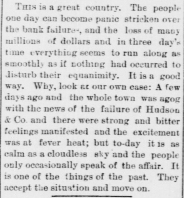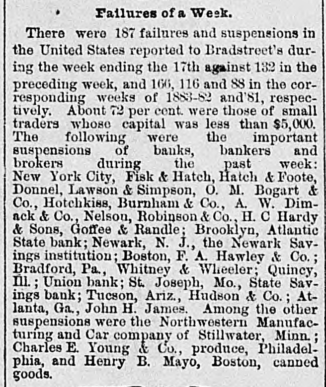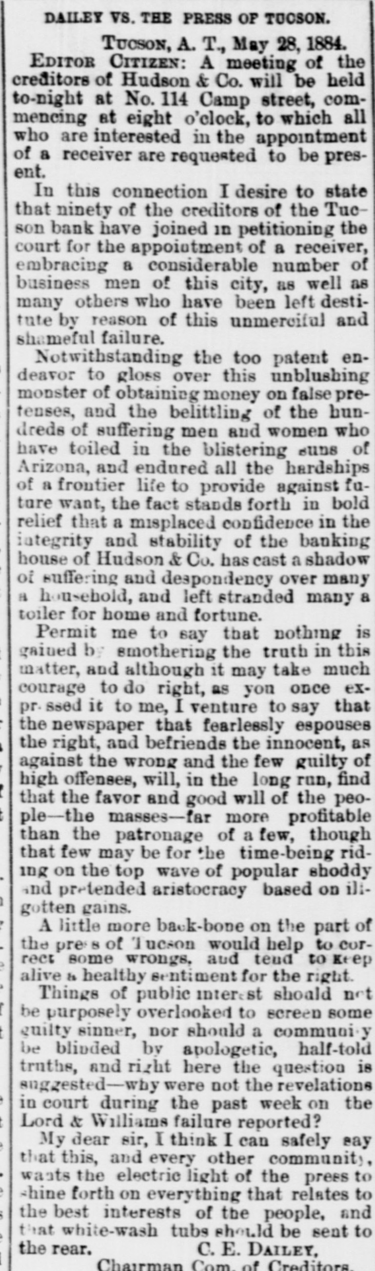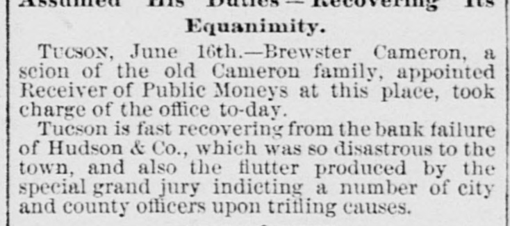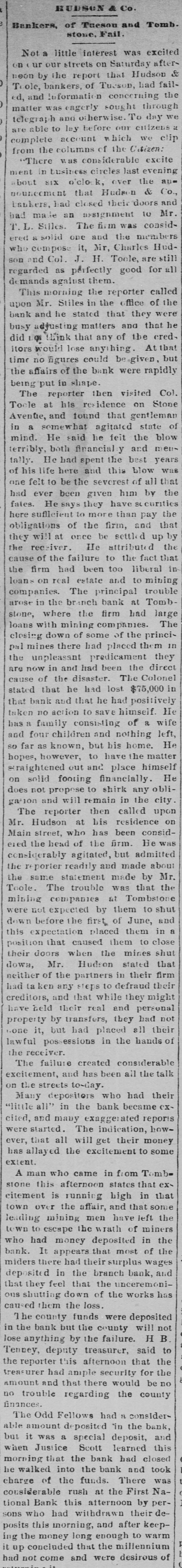 on TO NOSTAH kers, of Tueson and Tomb. stone, Fail. of a little interest was excited ur our streets on Saturday aftern by the report that Hudson & le, bankers, of Tueson, had failand information concerning the ter was eagerly sought through graph and otherwise. To day we able to lay before our citizens plete account which we clip n the columns of the Citizen: There was considerable excite t in business circles last evening it SIX o'clo k, over the aumeement that Hudson & Co., kers, had closed their doors and made an assignment to Mr. . Stiles. The firm was consida solid one and the members compose it, Mr, Charles Hudnd Col. J. H. Toole, are still rded as perfectly good for all ands against them. HS morning the reporter called 1 Mr. Stiles in the office of the : and he stated that they were T adjusting matters and that he think that any of the cred3 would lose anything. At that no figures could begiven, but affairs of the bank were rapidly shape. a! and 7 e reporter then visited Col. le at his residence on Stone the, and found that gentleman a somewhat agitated state of d. He said he feit the blow bly, both financial y and mens . He had spent the best years is life here and this blow was felt to be the severest of all that ever been given him by the 3. He says they have S0 curities sufficient to more than pay the gations of the firm, and that will at once be settled up by receiver. He attributed the e of the failure to the fact that firm had been too liberal in 8 on real estate and to mining panies. The principal trouble t in the branch bank at Tomb, where the firm had large si with mining companies. The ing down of some of the princimines there had placed them in unpleasant predicament they how in and had been the direct e of the disaster. The Colonel d that he had lost $75,000 in bank and that he had positively ni no action to save himself. He 1 family consisting of a wife four children and nothing left, r as known, but his home. He e, however, to have the matter ghtened out and place himself solid footing financially. He not propose to shirk any oblion and will remain in the city. e reporter then called upon Hudson at his residence on 1 street, who has been considthe head of the firm. He was iderably agitated, but admitted porter readily and made about same statement made by Mr. 9. The trouble was that the ng companies at Tombstone not expected by them to shut r before the first of June, and expectation placed them in a ion that caused them to close doors when the mines shut , Mr. Hudson stated that er of the partners in their firm a ken any steps to defraud their tois, and that while they might held their real and personal erty by transfers, they had not it, but had placed all their the in