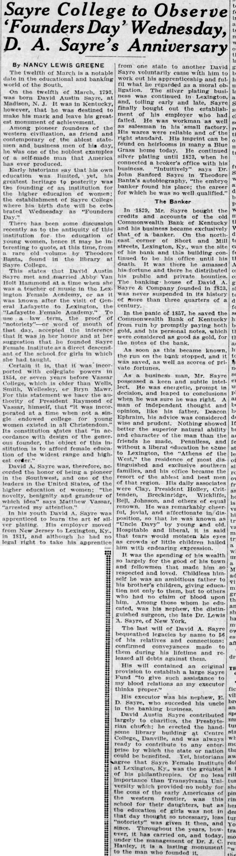 Sayre College to Observe Wednesday, A. Sayre's Anniversary tle By NANCY LEWIS GREENE The twelfth of March notable date the and banking world the South. On twelfth of March, 1793, Madison, was Kentucky, however, that he destined make his mark leave his greatest pioneer founders the civilization, friend contemporary the ablest statemen and men of his day, he was one of the noblest examples that America ever produced. Early that his own education limited, greatest heritage to posterity the founding an institution for the higher education of women; the establishment of College where his birth date will celebrated Wednesday as "Founders There has been some discussion recently the antiquity of this institution the education young hence may interesting quote, at this time, from old by Theodore Banta, found in the library College. This states that David Austin Abby Van Holt was teacher music in the Lex Female the visit of GenLexington, the "Lafayette Academy. law term, the proof word of mouth that accepted the inference that her honor her suggestion that he founded Female direct descendschool girls in which she had taught. Certain that was incorported collegiate powers 1854, or seven Vassar College, which older than Wells, Smith, Wellesley, or Bryn Mawr. For statement haev thority President Raymond Vassar, himself, that porated at time not gle endowed college for young women existed all Christendom. Its constitution that design the ous the of this tion widest range and high Sayre was, therefore, corded honor of the of leaders United States, of higher education of women; novelty benignity and grandeur which Matthew Vassar, his youth David Sayre learn the plating from Jersey Lexington, 1811, and although had legal right to take his apprentice from state to another David voluntarily came him out his and ful. he regarded ligation. The plating Lexington, toiling early and late, Sayre finally bought the ment of his employer who had failed. He was workman well salesman small factory. His wares reliable and right standard. His imprint can of found heirlooms in many Blue Grass home today. continued silver plating until 1823, when connected broker's office with business. "Intuitively" Dr. John Sanford Sayre Theodore Banta's "the embryo banker found his place; the career for which he was well qualified.' The Banker In 1829, Mr. Sayre bought the credits old Bank of Kentucky and his that On the northMill Ky., was the site his and tinued until his death. amassed and distributed his public bounties. banking of in 1823, in its history of than three of In the panic 1857, he saved the Bank of from ruin by promptly both gold, and his notes, good as gold, for the notes of the As soon this known, the on the bank stopped, and well as scores of private fortunes. As man, Mr. Sayre He prompt and to when right. opinion, like his Deacon his prudent showed ability the than friends Lexington, the most tinguished exclusive families, resort ablest and best of that associates President others equal ful, jovial, and affectionate position, that he known "Uncle young and Hospitable and liberal, said tears would moisten his crowds children endearing expression. was the spending of his wealth largely good his town and fellowmen made him respected and loved. Childless self he an ambitious father to his brother's children, giving educathem, to others had claim blood upon him. educated, his nephew, the distinthe Dr. Lewis Sayre, New York. The last will David A. Sayre bequeathed legacies by name and connections: confirmed made them during lifetime released all debts against them. His contained original provision establish large Fund give assistance my blood relations as my executor thinks proper." His executor his nephew, E. Sayre, succeded his uncle the banking David Austin contributed largely charities, the rian church: erected the library building Centre College, Danville, was always ready contribute to any enter. by which nation that benefited. Yet, historians that Female Institute Lexington, the greatest no less than Transylvania versity nobly for the cons of the early Americans the frontier, this school for daughters, but the girls that day was then, and since. the years, has carried on, today, under Dr. Hanley, lasting monument to the man who founded