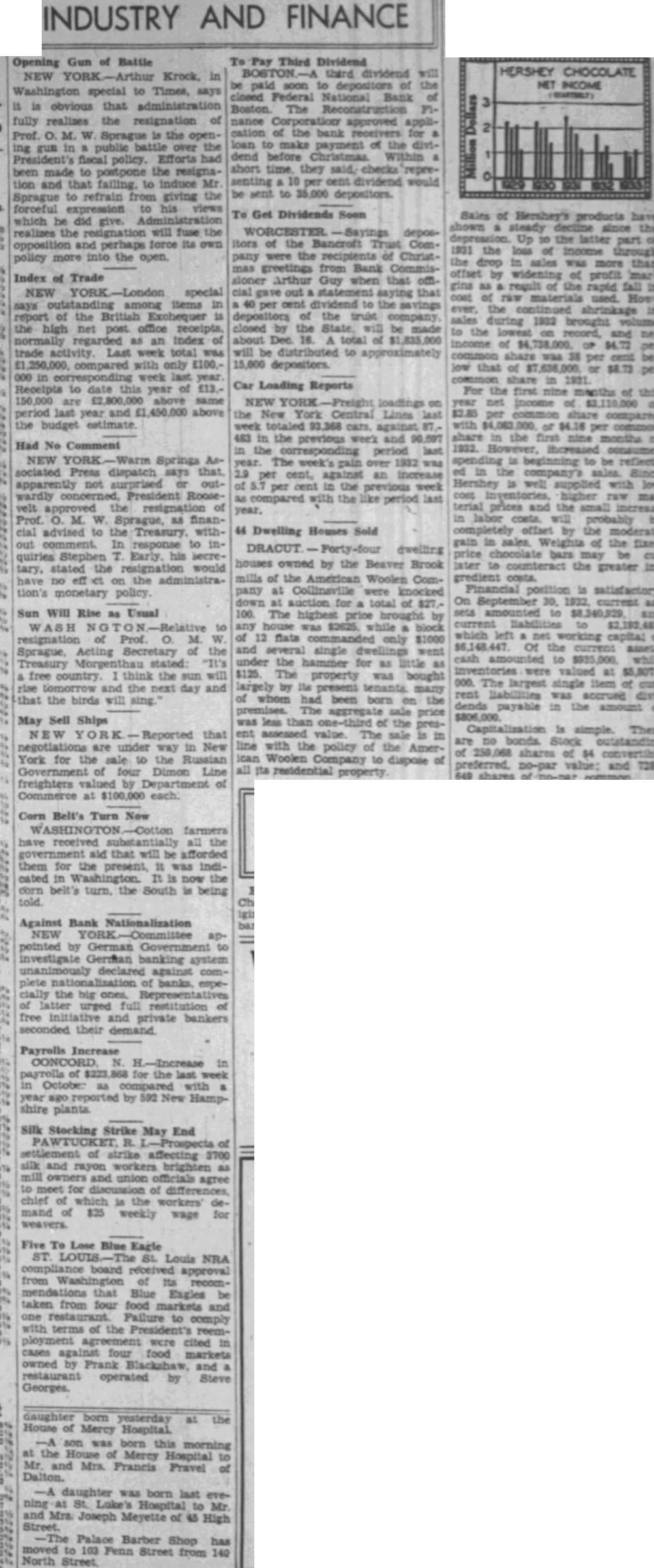 INDUSTRY AND FINANCE Opening Gun Battle NEW Krock, Washington special to Times, says obvious that administration fully realizes the resignation of Prof. Sprague the opengun public battle over the President's fiscal policy. Efforts had been made postpone the resignation and that failing, to induce Mr Sprague to refrain from giving the forceful expression his views which he did realizes the resignation will fuse the opposition and perhaps force its own policy more into the open. Index Trade NEW special says items report of the British Exchequer high office receipts, normally regarded an Index of trade activity Last week total compared with in corresponding week Receipts to date year are £2,800,000 period last year and above the budget estimate. Had No Comment NEW Springs Associated Press dispatch says apparently not surprised outwardly President Roosevelt of Prof. as financial advised to the Treasury. out In response quiries Stephen Early. his secrethe would no administration's monetary policy. Sun Will Rise Usual resignation Prof. Sprague, Acting Secretary Treasury Morgenthau stated: free country. the will rise and the that the birds sing. May Sell Ships that negotiations are under way New York for to the Russian of four Dimon Line freighters valued of Commerce at $100,000 each. Corn Belt's farmers have received government aid that will be afforded them for the present, cated in Washington. belt's turn. the South being told. Against Bank Nationalization NEW pointed by German Government investigate German banking system unanimously declared complete banks, especially big ones, latter urged restitution free initiative and private bankers their demand Payrolls Increase CONCORD, H.-Increase in of for Octobe: as with by New Hampshire plants. Silk Stocking Strike May End strike affecting and union officials agree for chief which the workers' mand $25 weekly wage Five To Lose Blue Eagle Louis NRA compliance board received approval from Washington recomthat Blue Eagles taken from food markets one restaurant. Failure to comply terms of the reemwere cited cases food markets owned by Frank and operated Steve Georges. daughter born yesterday House of Mercy was born this morning the Mercy Hospital Mrs. Francis Fravel Dalton. daughter was born last Luke's Hospital and Joseph Meyette of High Street. Palace Barber Shop has moved Street from 140 North Third Dividend third dividend paid soon depositors closed Federal National Bank Boston. The nance Corporation approved appliof loan make payment dend before Within short they senting per would to 35,000 depositors. To Get Dividends Soon WORCESTER deposBancroft Trust Company were the recipients Christgreetings from Bank Commissioner Arthur Guy when that cial out saying cent dividend depositors the closed will be about total of will to depositors. Car Loading Reports New Lines 93,368 against 483 the previous week and period The over 2.9 per cent, against an increase per cent the previous compared with the last year. 44 Dwelling Houses Sold dwelling price chocolate houses owned by the Beaver Brook later counteract the greater inmills the American Woolen Com- gredient costs. pany at were knocked Financial position satisfactory. On September total 100. The highest amounted brought house current liabilities was while which working capital flats only $1000 Of the assets, and several single dwellings went cash amounted under the hammer for as little as valued The property was bought 000. The single largely by tenants rent liabilities accrued of whom had been born the payable the amount premises. aggregate sale was less than the presThere assessed The sale bonds. Stock line with the policy of the Amershares Woolen Company to of dispose preferred. no-par value: and all residential property. 549 shares of