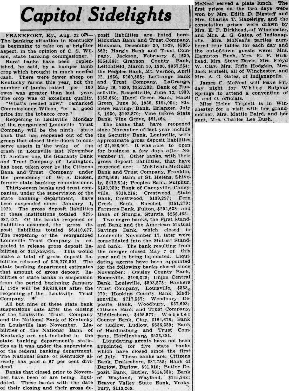 UNDER THE DOME OF THE CAPITOL By DWIGHT L. PITKIN. Associated Press Staff Writer. Frankfort, Ky., Aug. 22 (AP) The banking situation in Kentucky is beginning to take on a brighter aspect, in the opinion of C. S. Wilson, state banking commissioner. Rural banks have been replenished, he said, by a bumper lamb crop which brought in much needed cash. There were fewer sheep on Kentucky farms this year but the number of lambs raised per 100 ewes was greater than last year. The crop was of excellent quality. "What's needed now," remarked Commisioner Wilson, "is a good price for the tobacco crop." Reopening in Louisville tomorrow of the re-organized Louisville Trust Company will be the ninth state bank that has re-opened out of the group that closed their doors to conserve assets in the wake of the crash in Louisville last Nov. 17. Another one, the Guaranty Bank & Trust Company, of Lexington, has been taken over by the Citizens Bank & Trust Company under the presidency of W. A. Dicken, former state banking commissioner. Thirty-seven banks and trust companies, under the supervision of the state banking department, have been suspended since Jan. 1, 1929. The gross deposit liabilities of these institutions totaled $29,087,437. Of the banks re-opened or liabilities assumed, the gross deposit liabilities totaled $6,410,677. The re-opening of the re-organized Louisville Trust Company is expected to release gross deposit liabilities of $13,859,914. This would make a total of gross deposit liabilities released of $20,270,591. The state banking department estimates that amount of gross deposit liabilities of state banks in suspension from the period beginning Jan. 1, 1929, will be $8,816,846 after the re-opening of the Louisville Trust Company. All but nine of these state bank suspensions date after the closing of the Louisville Trust Company and the National Bank of Kentucky in Louisville last November. Liabilities of the National Bank of Kentucky are not included in the state banking departments statisties as it was under the supervision of the federal banking department. The National Bank of Kentucky has already paid a 67 per cent dividend. Banks that closed prior to November have been or are being liguidated. Kentucky's Tourist Trade. Geoffrey Morgan, acting executive secretary of the Kentucky Progress Commission, attributes the increase in gasoline consumption in Kentucky this year to the Progress Commission's efforts in advertising the state's tourist attractions. The first six months of this year showed an increase in gasoline taxes of $180,178.03 over the same period last year. "It certainly pays to advertise," said Mr. Morgan, citing these statistics. "Take the figures for January. The tax commission showed gasoline taxes collected in January of this year totaled $620,88550 as compared with $503,046.73 for January of 1930. That is an enormous difference. The reason for it is this: We had an open winter the first of this year. So the tourists in Florida began flocking home. We had been advertising Kentucky among the tourists and the result was many of these tourists returned northward by way of Kentucky."