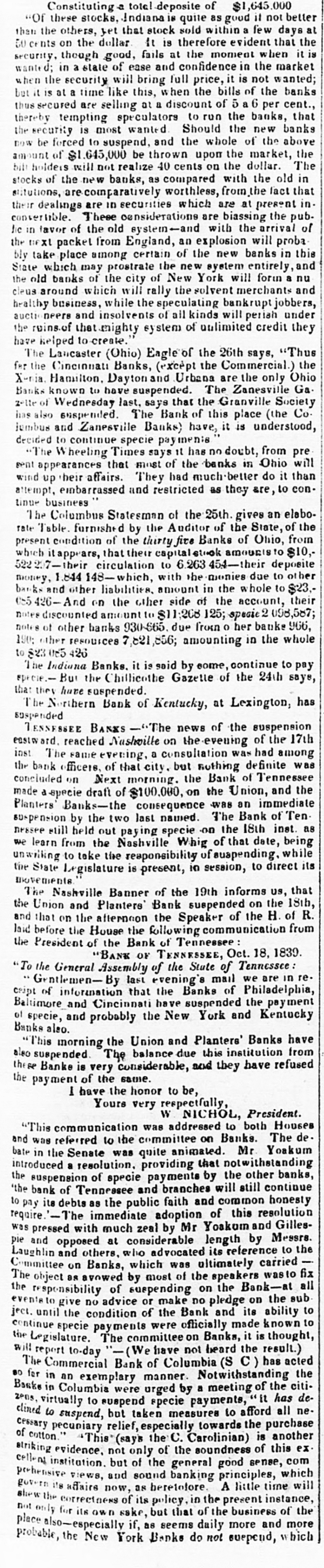 Constituting a total deposite of $1,645.000 Of these stocks, Indiana is quite good it not better than the others, yet that stock sold within a few days a 50 cents on the dollar It is therefore evident that the is security, though good, fails at the moment when it wanted in a state of ease and confidence in the market when the security will bring full price, it is not wanted; but is at a time like this, when the bills of the banks hus secured are selling at a discount of 5 per cent., thereby tempting speculators to run the banks, that the security is most wanted Should the new banks now be forced to suspend, and the whole of the above amount of $1.645,000 be thrown upon the market, The the holders will not realize 40 cents on the dollar. stocks of the new banks, as compared with the old in stitutions, are comparatively worthless, from the fact that in their dealings are ID securities which are at present consertible. These considerations are biassing the pubof the old system- with the arrival of the from England, an lic in next favor packet explosion banks will proba in bly take place among certain of the new this State which may prostrate the new system entirely, and the old banks of the city of New York will form a nu cleus around which will rally the solvent merchants and healthy business, while the speculating bankrupt jobbers, auctic neers and insolvents of all kinds will periah under the ruins.of that mighty system of unlimited credit they have helped to create. The Lancaster (Ohio) Eagle of the 26th says, "Thus for the Cincinnati Banks, (except the Commercial.) the X-nia. Hamilton. Dayton and Urbana are the only Ohio Banks known to have suspended. The Zanesville Ga. zette Wednesday last, says that the Granville Society has also suspended The Bank of this place (the Co. jumbus and Zanesville Banks) have, it 15 understood, decided to continue specie payments "The Wheeling Times says it has no doubt, from pre sent appearances that most of the banks in Ohio will wind up their affairs. They had much-better do it than attempt, embarrassed and restricted as they are, to continue business The Columbus Statesman of the 25th. gives an elaborate Table. fornish by the Auditor of the State, of from the condition of the thirty fire Banks of Ohio, present which it appears, that their amounts to $10, 22297-their circulation to 6.263 454-their deposite other money, 1.844 8-which with the monies due to banks and other liabilities. amount in the whole to $23.055426-And on the other side of the account, their notes discounted amount to $11;208 125; specie 2 098,587; notes of other banks 930-565. due from o her banks 966, 190: other resources 7,821,856; amounting in the whole to $23 065 426 The Indiana Banks. it is said by some, continue to pay specie.- But the Chillieothe Gazette of the 24th saye, that they have suspended. The Northern Bank of Kentucky, at Lexington, has suspended TENNESSEE BANKS "The news of the suspension eastward. reached Nashrille on the evening of the 17th inst The same evening, a consultation was had among the bank officers, of that city. but nothing definite was concluded on Next morning. the Bank of Tennessee the made specie draft of $100,000, on the Union, immediate and Planters Banks-the consequence was an Ten suspension by the two last named. The Bank of nessee still held out paying specie on the 18th inst. as we learn from the Nashville Whig of that date, while being unwilling to take the reaponsibility of suspending. the State Legislature is present, in session, to direct its movements The Nashville Banner of the 19th informs us, that the Union and Planters Bank suspended on the 18th, R. and that on the afternoon the Speaker of the H. of laid before the House the following communication from the President of the Bank of Tennessee "BANK OF TENNESSEE, Oct. 18, 1839. 'To the General Assembly of the State of Tennessee: Gentlemen- last evening's mail we are in recript of information that the Banks of Philadelphia, Baltimore and Cincinnati have suspended the payment of specie, and probably the New York and Kentucky Banks also. "This morning the Union and Planters' Banks have from also suspended The balance due this institution these Banke is very considerable, and they have refused the payment of the same. 1 have the honor to be, Yours very respectfully, W NICHOL, President. "This communication was addressed to both The Houses de. and referred to the committee on Banks. Yoakum bate was in the Senate was quite animated. Mr introduced a resolution. providing that notwithstanding the of payments by the other banks, 'the and branches to debts as the public faith and common pay suspension bank its of Tennessee specie will still resolution continue honesty require.'-1 immediate adoption of this Gilleswas pressed with much zeal by Mr Yoakum and Messrs. pie at considerable length by the who advocated its on which was ultimately fix Committee Laughlin and opposed and others, Banks, reference carried wasto to The object as avowed by most of the speakers all the responsibility of suspending on the Bank-at the sub eventato give no advice or make no pledge on ject. until the condition of the Bank and to to continue were officially specie payments made its it is known ability thought, the Legislature. The committee on Banks, will report to-day not beard the result.) The Commercial Bank of Columbia (S C) has acted the so for in an manner. Notwithstanding Baske in were urged by a deColumbia exemplary meeting of it the has citizens, to suspend specie payments, clined to but taken measures to virtually suspend, afford the purchase all necessary pecupiary relief, especially towards 'This' the C. Carolinian) striking not only of the soundness of cotton." evidence. (says of is this another com ex cellent institution. but of the general good sense, which perhensive views, and sound banking principles, will govern its affairs now, as heretofore. A little time shew the correctness of its policy. in th