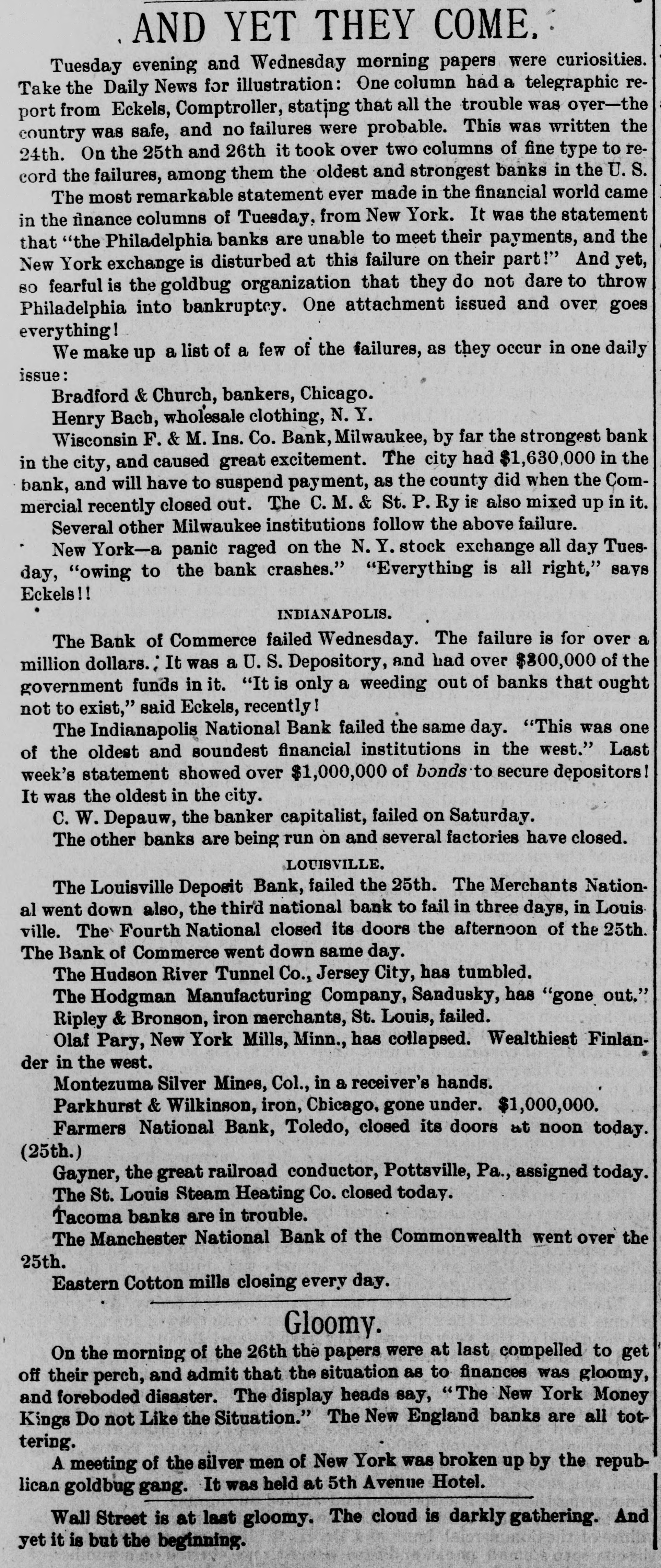 AND YET THEY COME. Tuesday evening and Wednesday morning papers were curiosities. Take the Daily News for illustration: One column had a telegraphic report from Eckels, Comptroller, stating that all the trouble was over-the country was safe, and no failures were probable. This was written the 24th. On the 25th and 26th it took over two columns of fine type to record the failures, among them the oldest and strongest banks in the U.S. The most remarkable statement ever made in the financial world came in the finance columns of Tuesday, from New York. It was the statement that "the Philadelphia banks are unable to meet their payments, and the New York exchange is disturbed at this failure on their part!" And yet, so fearful is the goldbug organization that they do not dare to throw Philadelphia into bankruptcy. One attachment issued and over goes everything! We make up a list of a few of the failures, as they occur in one daily issue: Bradford & Church, bankers, Chicago. Henry Bach, wholesale clothing, N. Y. Wisconsin F. & M. Ins. Co. Bank, Milwaukee, by far the strongest bank in the city, and caused great excitement. The city had $1,630,000 in the bank, and will have to suspend payment, as the county did when the Commercial recently closed out. The C. M. & St. P. Ry is also mixed up in it. Several other Milwaukee institutions follow the above failure. New York-a panic raged on the N.Y. stock exchange all day Tuesday, "owing to the bank crashes." "Everything is all right," says Eckels!! INDIANAPOLIS. The Bank of Commerce failed Wednesday. The failure is for over a million dollars.; It was a U.S. Depository, and had over $800,000 of the government funds in it. "It is only a weeding out of banks that ought not to exist," said Eckels, recently! The Indianapolis National Bank failed the same day. "This was one of the oldest and soundest financial institutions in the west." Last week's statement showed over $1,000,000 of bonds to secure depositors! It was the oldest in the city. C. W. Depauw, the banker capitalist, failed on Saturday. The other banks are being run on and several factories have closed. LOUISVILLE. The Louisville Deposit Bank, failed the 25th. The Merchants National went down also, the third national bank to fail in three days, in Louis ville. The Fourth National closed its doors the afternoon of the 25th. The Bank of Commerce went down same day. The Hudson River Tunnel Co., Jersey City, has tumbled. The Hodgman Manufacturing Company, Sandusky, has "gone out." Ripley & Bronson, iron merchants, St. Louis, failed. Olaf Pary, New York Mills, Minn., has collapsed. Wealthiest Finlander in the west. Montezuma Silver Mines, Col., in a receiver's hands. Parkhurst & Wilkinson, iron, Chicago, gone under. $1,000,000. Farmers National Bank, Toledo, closed its doors at noon today. (25th.) Gayner, the great railroad conductor, Pottsville, Pa., assigned today. The St. Louis Steam Heating Co. closed today. Tacoma banks are in trouble. The Manchester National Bank of the Commonwealth went over the 25th. Eastern Cotton mills closing every day. Gloomy. On the morning of the 26th the papers were at last compelled to get off their perch, and admit that the situation as to finances was gloomy, and foreboded disaster. The display heads say, "The New York Money Kings Do not Like the Situation." The New England banks are all tottering. A. meeting of the silver men of New York was broken up by the republican goldbug gang. It was held at 5th Avenue Hotel. Wall Street is at last gloomy. The cloud is darkly gathering. And yet it is but the beginning.