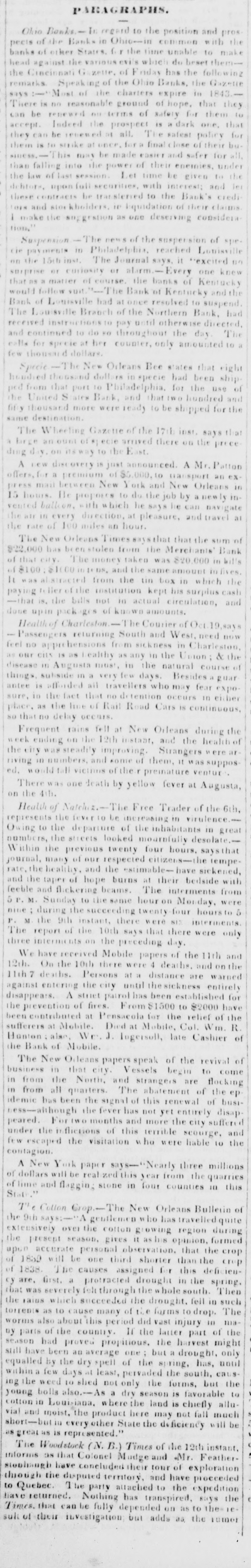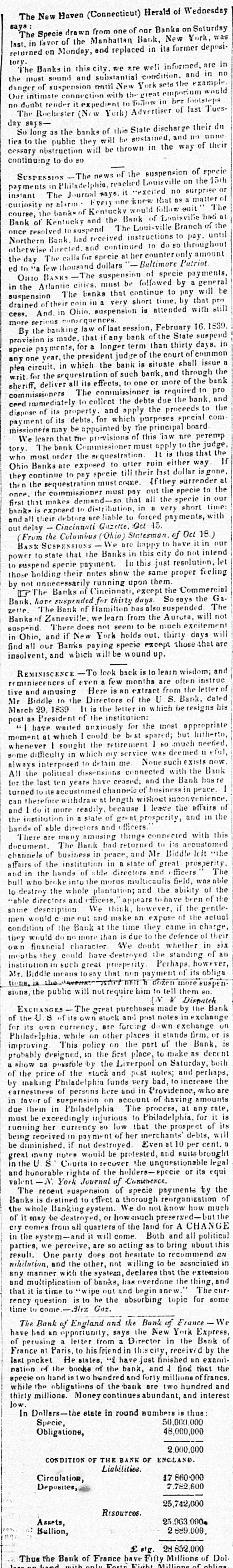 The New Haven (Connecticut) Herald of Wednesday says The Specie draw from one of nor Banks on Saturday was in favor of the Manhattan Bank, New York, returned last, on Monday, and replaced in its former depository The Banks in this city we are well informed, are in no in the most sound and substantial condition and danger of suspension until New York the example would Our intimate connection with the great emporium foolsteps no doubt tender it expedient to follow in her The Rochester (No York) Advertiser of last Tues day So says- long as the banks of this State discharge their unne dn ties to the public they will be sustained. and no of their cessary obstruction will be thrown in the way continuing to do so SUSPENSION The news of the suspension of the specie 15th in Philadelphia, reached Louisville on payments The Journal saye it excited no surprise matter instant or alarm. Every one *new that as The curiosity bank of Kentucky would follow euit had course, the Kentucky and the Bank of Louisville the at once to Bank resolved of to suspend he Loui-ville Branch of until pay. instructions received had otherwise Northern Bank. directed. and continued to do so throughout amount The calls for specie at her counter ed to 'a the day few thousand dollars Bultimore Patriot BANKS The suspension of specie payments. OHIO the Atlantic cities. must be followed by a general will be in The banks that continue to pay that suspension drained of their coin in very short time. by with pro still cess. And. in Ohio suspension is attended consequences. more serieus the banking law of last session. February 16.1839 By made. that if any bank of the State suspend in provision payments, is for longer term than thirty common days. is the bank which anyone specie year, the president judge of situate the court shall of issue plea circuit. the sequestration in of such bank and through bank the writ for deliver all its effects, to one or more of the to pro sheriff, The commissioner is required commissioners immediately to collect the debts due the bank, and the ceed of its property and apply the proceeds to com dispose its debts. for which purposes special board missionersmany payment of be appointed by the principal We learn that the previsions of this law are peremp tory. The bank Commissioner must It apply is thus to the that judge the the who arquestration must order If either way ruin ulter Ohio Banks are to exposed specie to till their last dollar is gone, they continue sequestration pay must come. If they surrender the at then the the commissioner must pay out the specie in to our once. that makes demand that all the specie time: banks first exposed to distribution in very short with and all is their debtors are liable to forced pay ments, out delay Cincinnati Gazette Oct 15. From the Columbus Ohio) Statesman, of Oct 18.) BASK SUSPENSIONS We are happy have in our to state that the Banks in this city do not intend power suspend specie payment. In this just resolution. let those to holding their notes show the same proper feeling not unnecessarily running upon them by Banks of Cincinnati, except the Commercial Bank. The have 'I he suspended Bank of Hamilton for thirty has days. also suspended So eays the The Ga. zelle. Banks of Zanesville, relearn from the Autora, will not excitement There does not seem to be much will suspend Ohio, and if New York holds out. thirty days are find in all our Barrks paying specie except those that insolvent, and which will be 11 ound up. REMINISCENCE -To look back is to learn wisdom; instruc and reminiscences of even few months are often letter live and amusing Here is an extract from the dated Biddle to the Directors of the U S. Bank, his March Mr 29. 1839 It is the letter in shich be resigns postas President of anxiously the institution: for the most appropriate "I have at which waited could be best spared; but hitherto, needed, moment I sought the retirement I 80 deemed much u eful, whenever difficulty in which my service was such now some interposed to detain me None exists the Bank always All the political dissensions connected with Bank has re ten have ceased and the for the last accustomed years channele of business in peace. turned therefore to ite withdraw at length without inconvenience afTairs can do more readily. because leave the and in the and the institution in state of great prosperity, hands of able directors and officers There many amusing things conne with this in business peace, document. are The Bank had returned and Mr to Biddle its accustomed left "the channels of the of institution in state of great prosperity. The affairs and the hands of able directors and fficers able who in broke into the morus multicaulis field, was of flicers. appears bull to destroy the whole plantation; and to the have ability been of the ..able directors description and We think, however if of the the actual gentle. same would me out and make an expose in condition men of the Bank at the time they came charge. their would de no more than is due to the defence of six they financial character We doubt whether in of own months they could have destroyed the standing however, institution in such great prosperity Perhaps. of its obliga Biddle means to say that non payment Mr. the whit mail dozen more suspen sions, tions. is the public will not require him [N ¥ to tell them Dispatch EXCHANGES - The great purchases made by exchange the Bank are forcing of the S of its own stock and post down notes exchange on for its own currency. while on other places it stands firm, or Philadelphia. This policy on the part of the as Bank, decer probably improving designed, in the first place, to make both and post notes; stock show as posstole by the Liverpool on Saturday. and perhaps, of the price Philade of the Iphia funds very bad, to increase the are by making of persons here and in Providence, amounts earnestness of suspension on account of having rate, in favor their in Philadelphia The process, at any