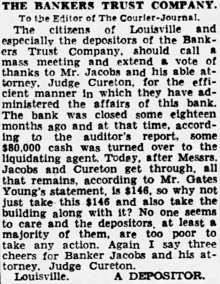 Louisville, Ky., December 11-The Bankers' Trust Company, which closed for the purpose of conserving its resources, is solvent, according to information filed in Circuit Court to day. Walter F. Jacob, realtor, appointed yesterday as Special Deputy In Commissioner ot liquidate the affairs of the Bankers' Trust Company by W. A. Dicken, State Banking Commissioner, filed the information, which lists assets of the institution at $3,411,545.4 and liabilities at the same figure.