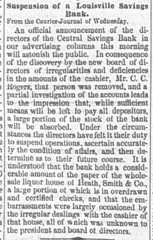 Suspension of a Louisville Savings Bank. From the Courier-Journal of Wednesday. An official announcement of the directors of the Central Savings Bank in our advertising columns this morning will astonish the public. In consequence of the discovery by the new board of directors of irregularities and deficiencies in the amounts of the cashier, Mr. C. C. Rogers, that person was removed, and a partial investigation of the accounts leads to the impression that, while sufficient means will be left fo pay all depositors, a large portion of the stock of the bank will be absorbed. Under the circumstances the directors have felt it their duty to suspend operations. ascertain accurately the condition of affairs, and then determine as to their future course. It is understood that the bank holds a considerable amount of the paper of the wholesale liquor house of Heath, Smith & Co., a large portion of which is in overdrawn and certified checks, and that the embarrassments were largely occasioned by the irregular dealings with the cashier of that house, all of which was unknown to the president and board of directors.