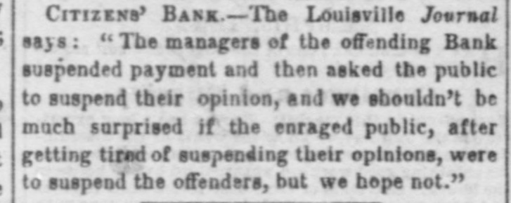 CITIZENS' BANK. - The Louisville Journal says: "The managers of the offending Bank suspended payment and then asked the public to suspend their opinion, and we shouldn't be much surprised if the enraged public, after getting tired of suspending their opinions, were to suspend the offenders, but we hope not."