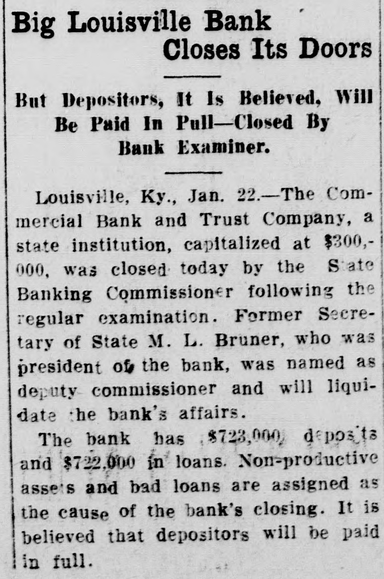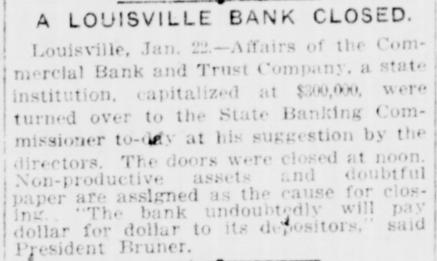 A LOUISVILLE bank CLOSED. Louisville, Jan. 22.-Affairs of the Commercial Bank and Trust Company. a state institution, capitalized at $300,000, were turned over to the State Banking Commissioner to-day at his suggestion by the directors. The doors were closed at noon. Non-productive assets and doubtful paper are assigned as the cause for closing. "The bank undoubtedly will pay dollar for dollar to its depositors," said President Bruner.