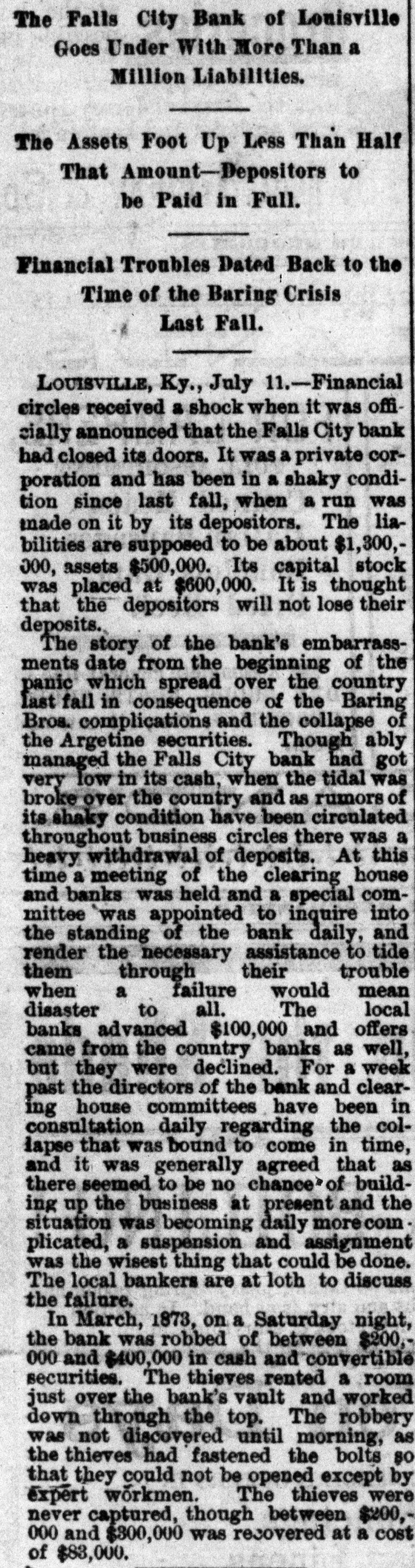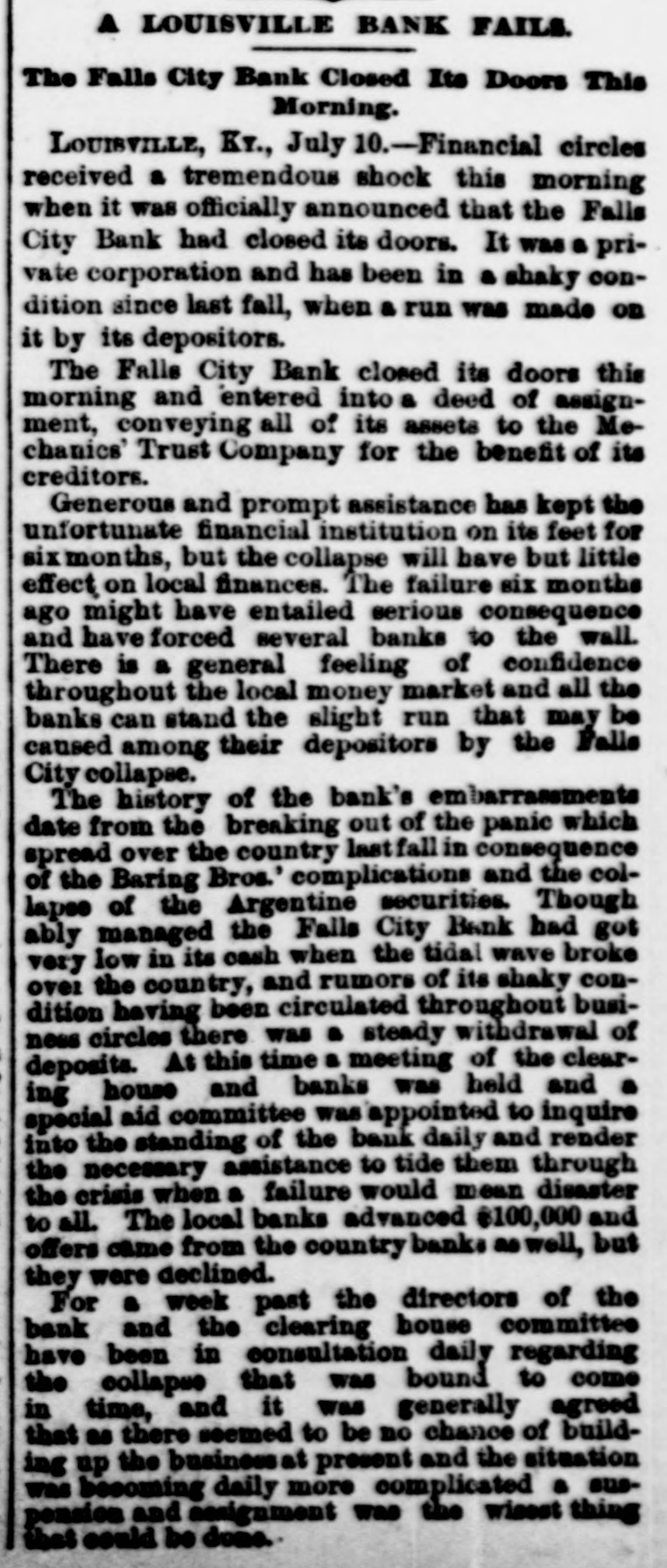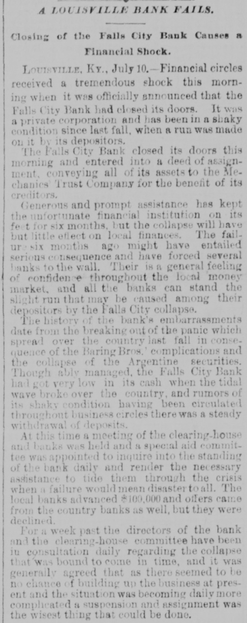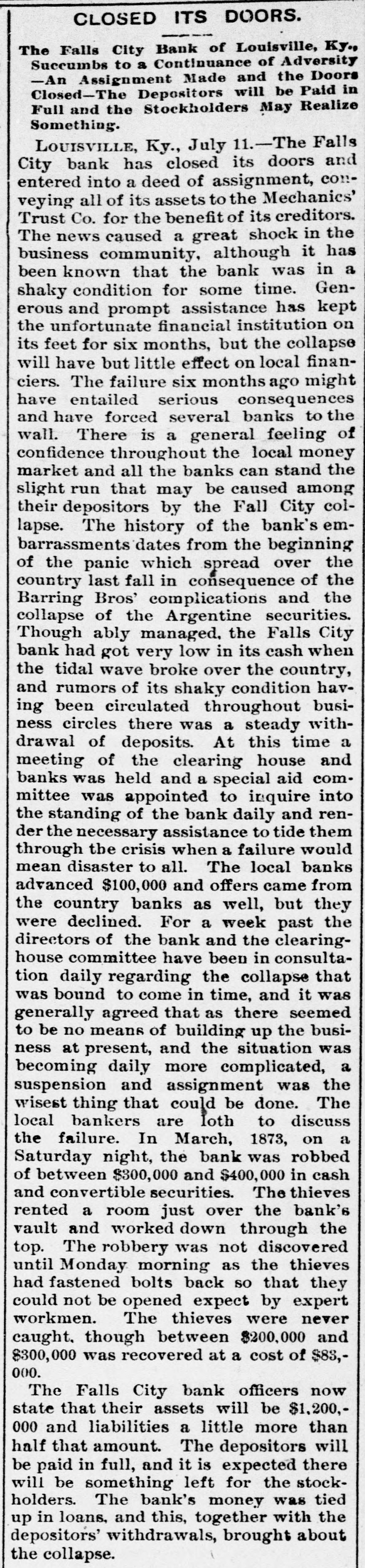 A LOUISVILLE BANK FAILS. The Falls City Bank Closed Its Doors This Morning. LOUISVILLE, Kr., July 1-Financial circles received a tremendous shock this morning when it was officially announced that the Falls City Bank had closed its doors. It was a private corporation and has been in a shaky condition since last fall, when a run was made on it by its depositors. The Falls City Bank closed its doors this morning and entered into a deed of assignment, conveying all of its assets to the Mechanics' Trust Company for the benefit of its creditors. Generous and prompt assistance has kept the unfortunate financial institution on its feet for six months, but the collapse will have but little effect on local finances. The failure six months ago might have entailed serious consequence and have forced several banks to the wall. There is a general feeling of confidence throughout the local money market and all the banks can stand the slight run that may be caused among their depositors by the Falls City collapse. The history of the bank's embarrassments date from the breaking out of the panic which spread over the country last fall in consequence of the Baring Bros.' complications and the collapse of the Argentine securities. Though ably managed the Falls City Bank had got very low in its cash when the tidal wave broke over the country, and rumors of its shaky condition having been circulated throughout business circles there was a steady withdrawal of deposits. At this time a meeting of the clearing house and banks was held and a special aid committee was appointed to inquire into the standing of the bank daily and render the necessary assistance to tide them through the crisis when a failure would mean disaster to all. The local banks advanced $100,000 and offers came from the country banks as well, but they were declined. For a week past the directors of the bank and the clearing house committee have been in consultation daily regarding the collapse that was bound to come in time, and it was generally agreed that as there seemed to be no chance of building up the business at present and the situation was becoming daily more complicated a suspension and assignment was the winest thing that could be done.