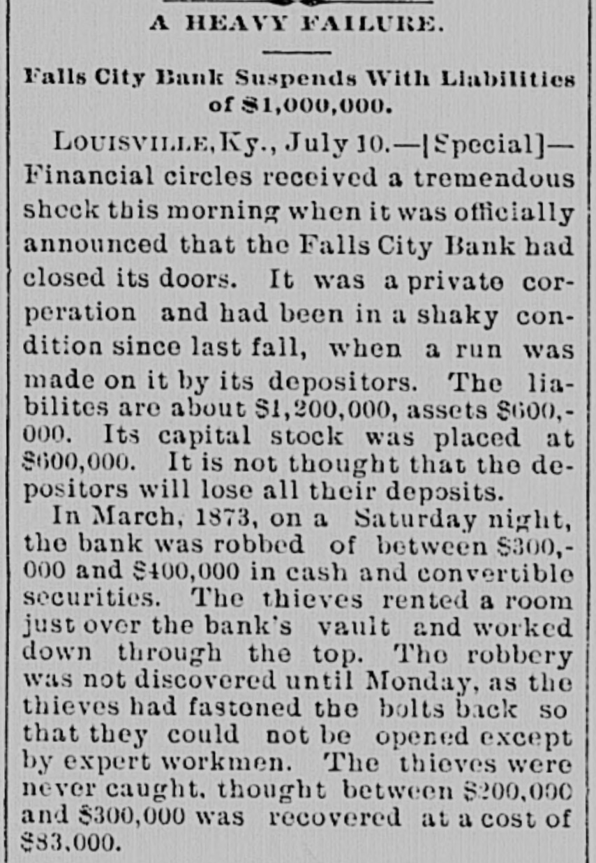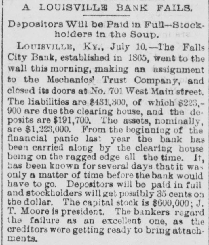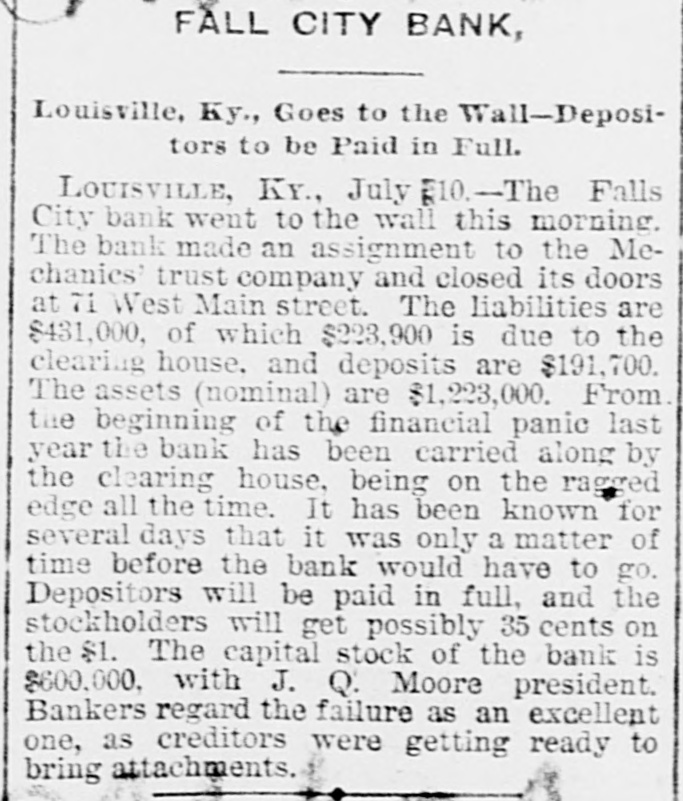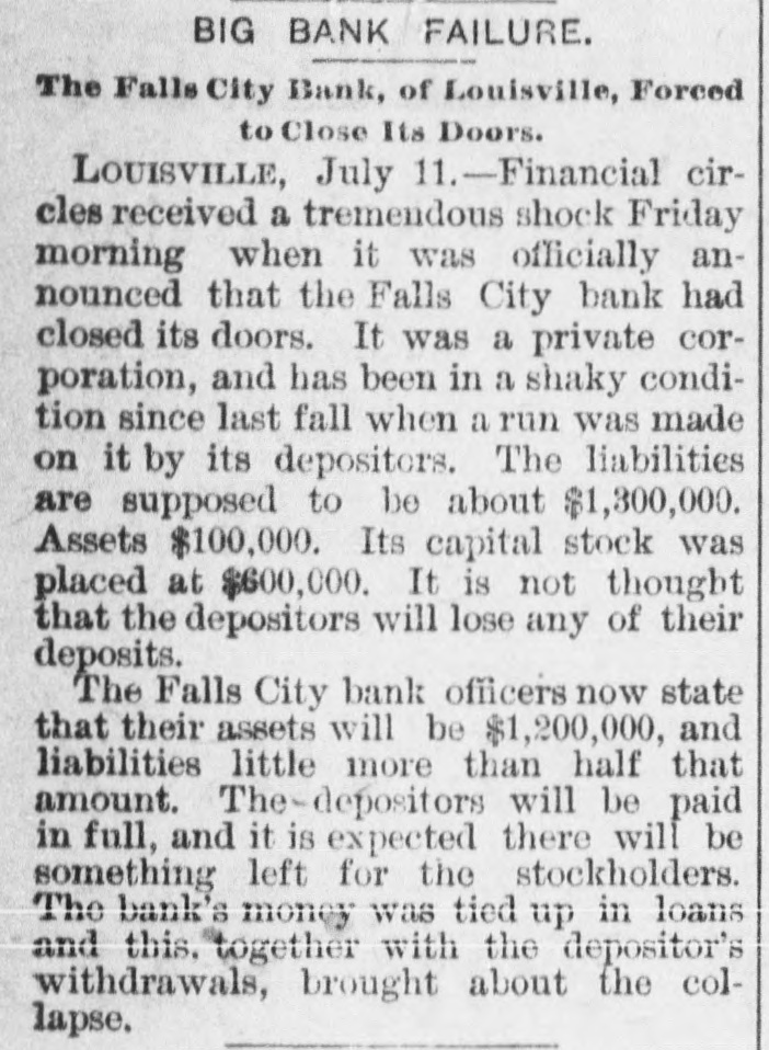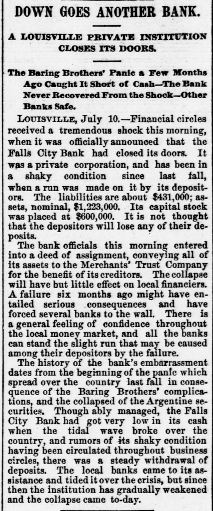 A LOUISVILLE BANK FAILS. The Falls City Bank Closed Its Doors This Morning. LOUISVILLE, Kr., July 1-Financial circles received a tremendous shock this morning when it was officially announced that the Falls City Bank had closed its doors. It was a private corporation and has been in a shaky condition since last fall, when a run was made on it by its depositors. The Falls City Bank closed its doors this morning and entered into a deed of assignment, conveying all of its assets to the Mechanics' Trust Company for the benefit of its creditors. Generous and prompt assistance has kept the unfortunate financial institution on its feet for six months, but the collapse will have but little effect on local finances. The failure six months ago might have entailed serious consequence and have forced several banks to the wall. There is a general feeling of confidence throughout the local money market and all the banks can stand the slight run that may be caused among their depositors by the Falls City collapse. The history of the bank's embarrassments date from the breaking out of the panic which spread over the country last fall in consequence of the Baring Bros.' complications and the collapse of the Argentine securities. Though ably managed the Falls City Bank had got very low in its cash when the tidal wave broke over the country, and rumors of its shaky condition having been circulated throughout business circles there was a steady withdrawal of deposits. At this time a meeting of the clearing house and banks was held and a special aid committee was appointed to inquire into the standing of the bank daily and render the necessary assistance to tide them through the crisis when a failure would mean disaster to all. The local banks advanced $100,000 and offers came from the country banks as well, but they were declined. For a week past the directors of the bank and the clearing house committee have been in consultation daily regarding the collapse that was bound to come in time, and it was generally agreed that as there seemed to be no chance of building up the business at present and the situation was becoming daily more complicated a suspension and assignment was the winest thing that could be done.
