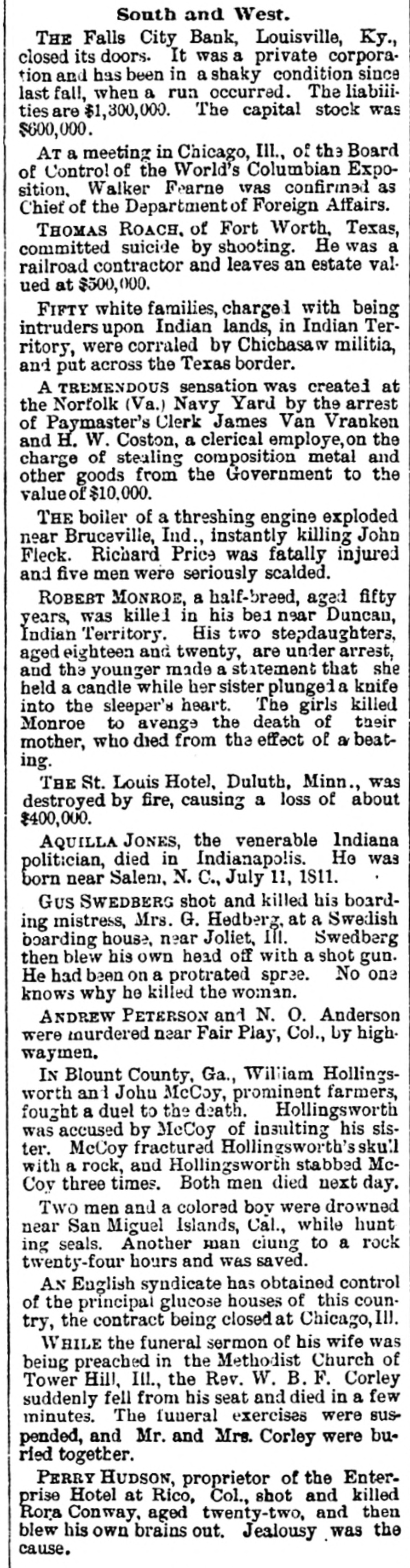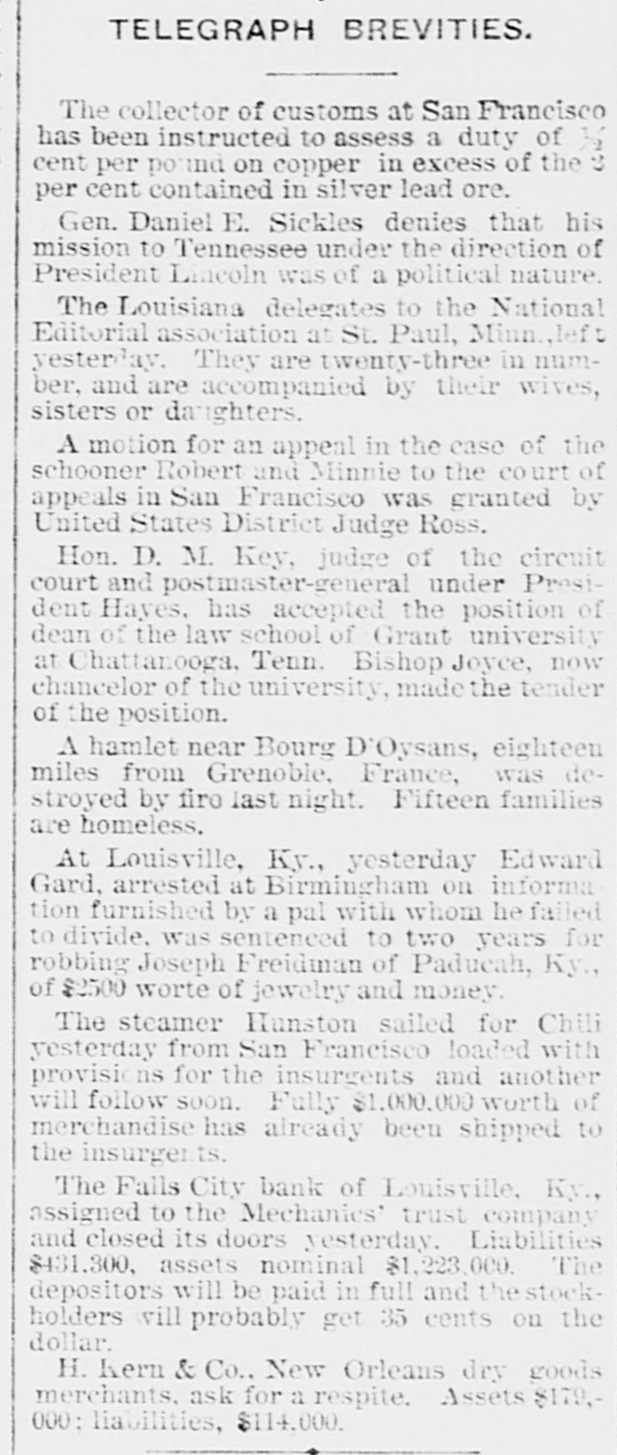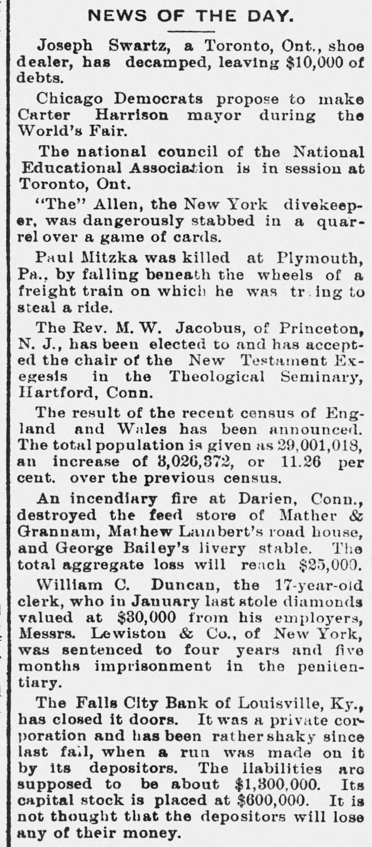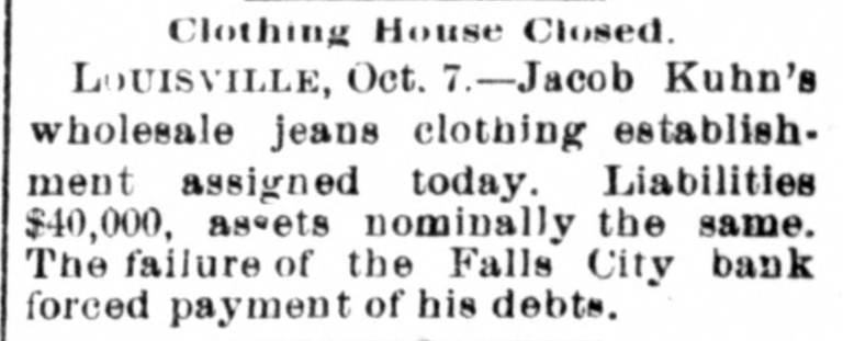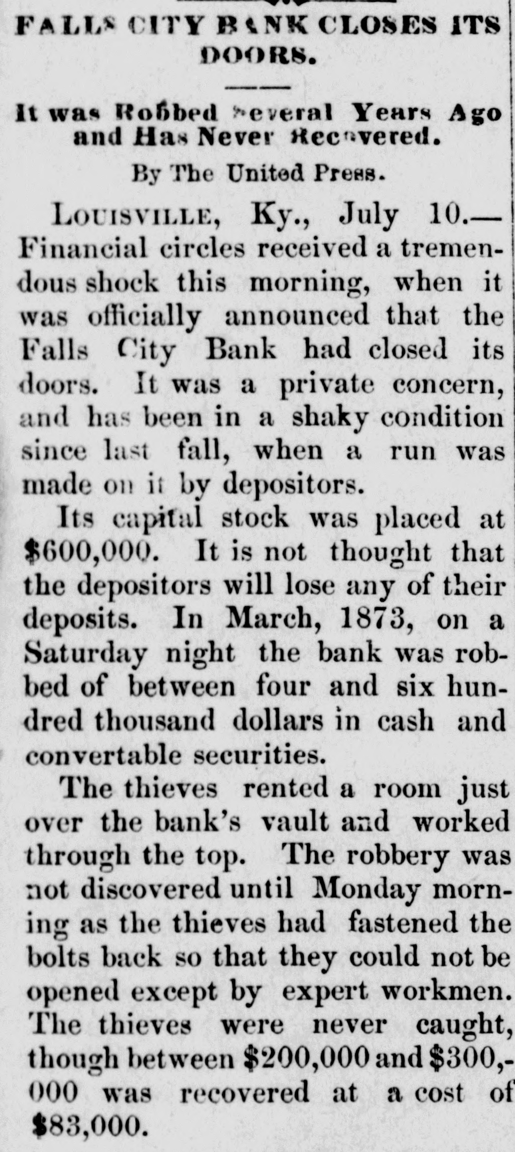 A LOUISVILLE BANK FAILS. The Falls City Bank Closed Its Doors This Morning. LOUISVILLE, Kr., July 1-Financial circles received a tremendous shock this morning when it was officially announced that the Falls City Bank had closed its doors. It was a private corporation and has been in a shaky condition since last fall, when a run was made on it by its depositors. The Falls City Bank closed its doors this morning and entered into a deed of assignment, conveying all of its assets to the Mechanics' Trust Company for the benefit of its creditors. Generous and prompt assistance has kept the unfortunate financial institution on its feet for six months, but the collapse will have but little effect on local finances. The failure six months ago might have entailed serious consequence and have forced several banks to the wall. There is a general feeling of confidence throughout the local money market and all the banks can stand the slight run that may be caused among their depositors by the Falls City collapse. The history of the bank's embarrassments date from the breaking out of the panic which spread over the country last fall in consequence of the Baring Bros.' complications and the collapse of the Argentine securities. Though ably managed the Falls City Bank had got very low in its cash when the tidal wave broke over the country, and rumors of its shaky condition having been circulated throughout business circles there was a steady withdrawal of deposits. At this time a meeting of the clearing house and banks was held and a special aid committee was appointed to inquire into the standing of the bank daily and render the necessary assistance to tide them through the crisis when a failure would mean disaster to all. The local banks advanced $100,000 and offers came from the country banks as well, but they were declined. For a week past the directors of the bank and the clearing house committee have been in consultation daily regarding the collapse that was bound to come in time, and it was generally agreed that as there seemed to be no chance of building up the business at present and the situation was becoming daily more complicated a suspension and assignment was the winest thing that could be done.