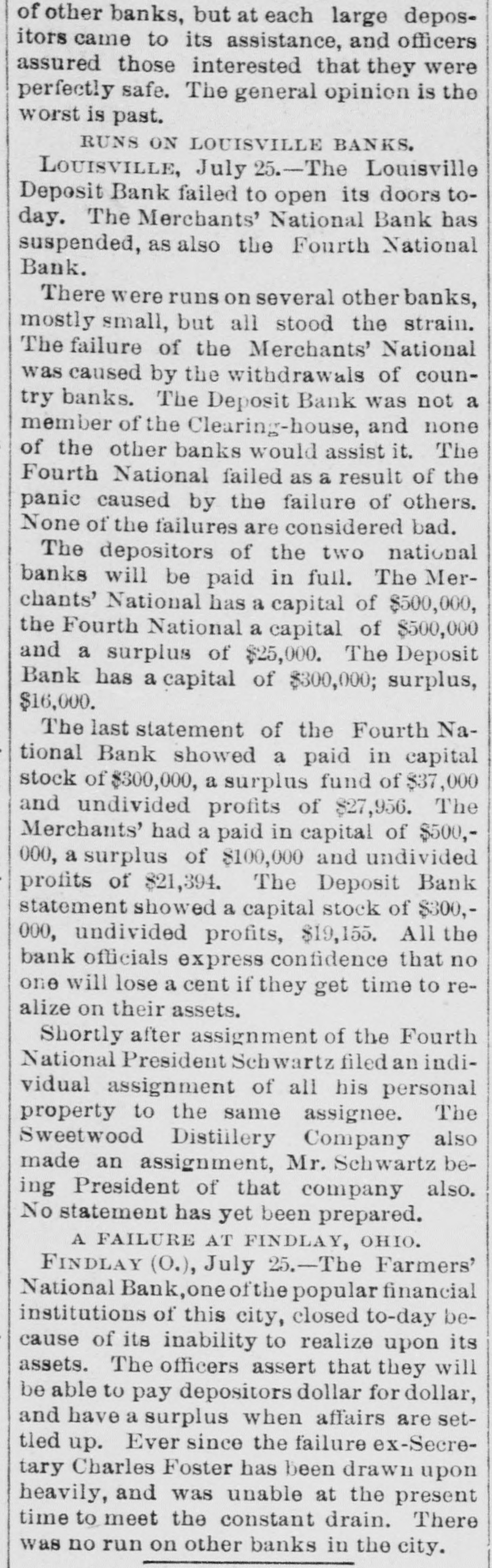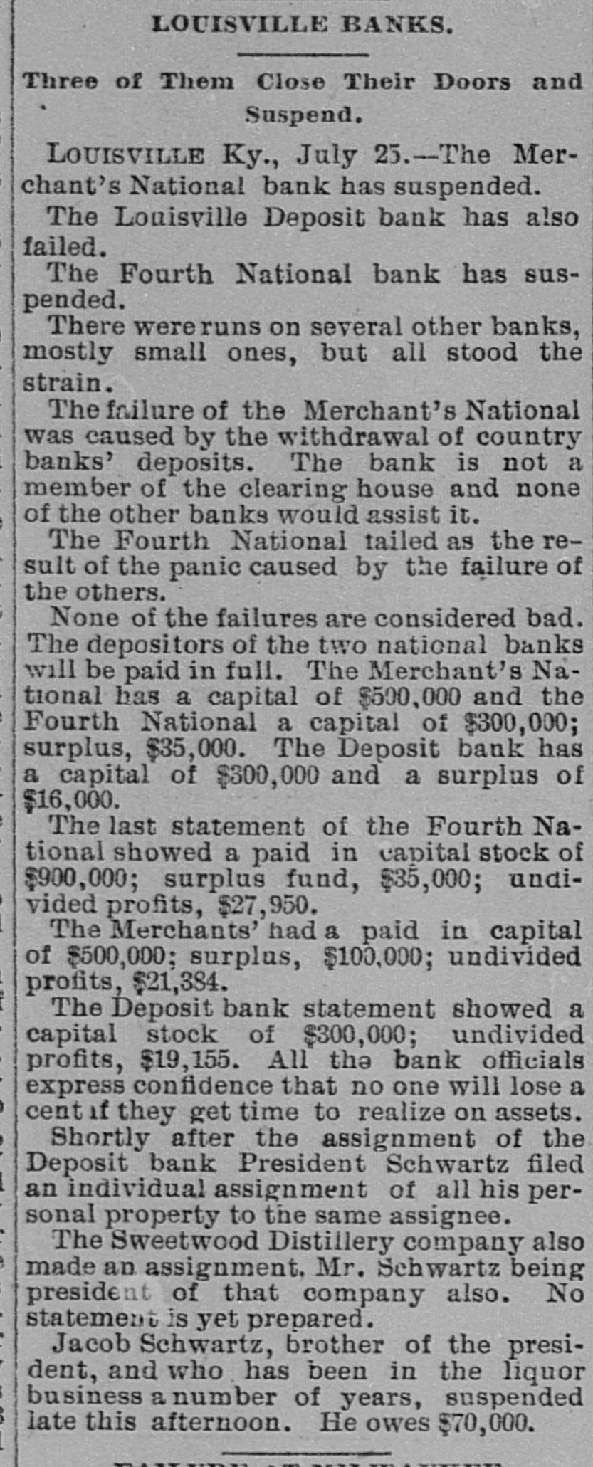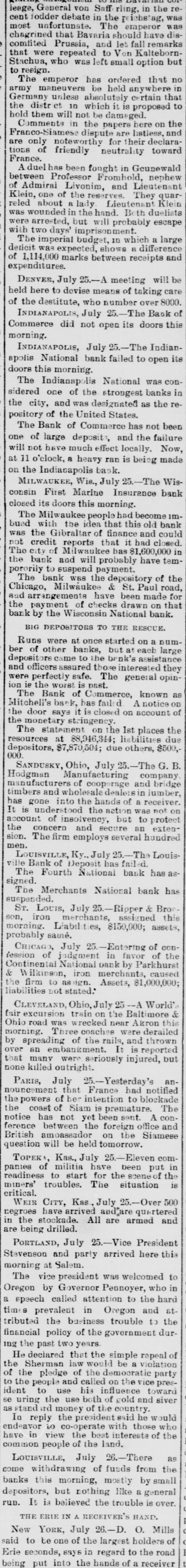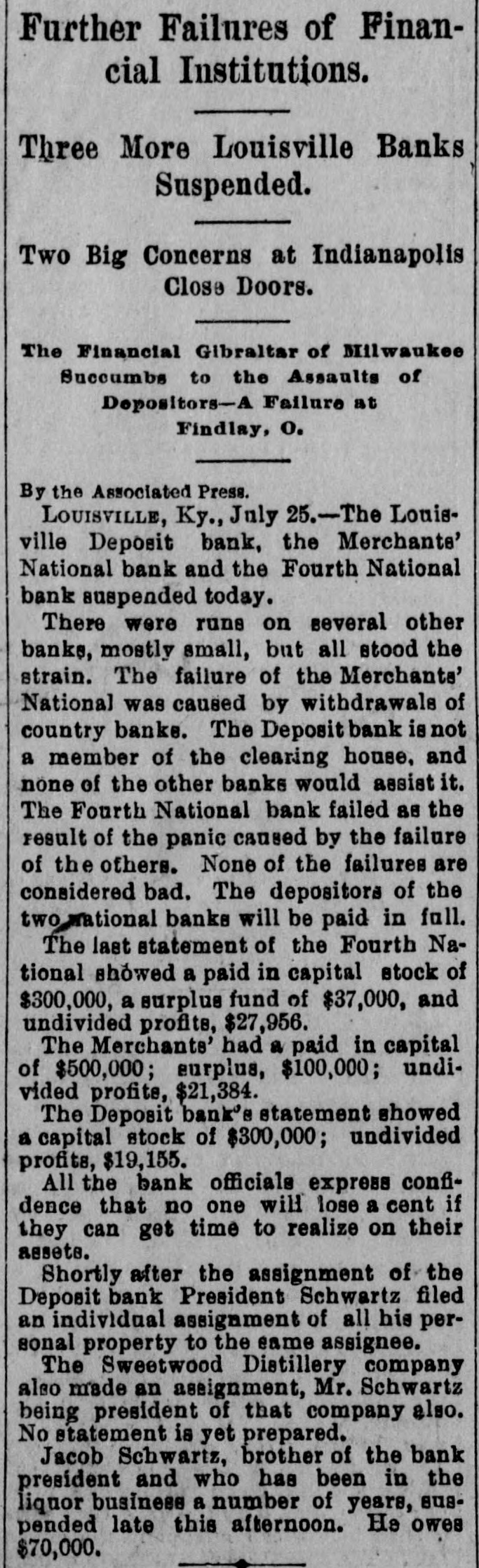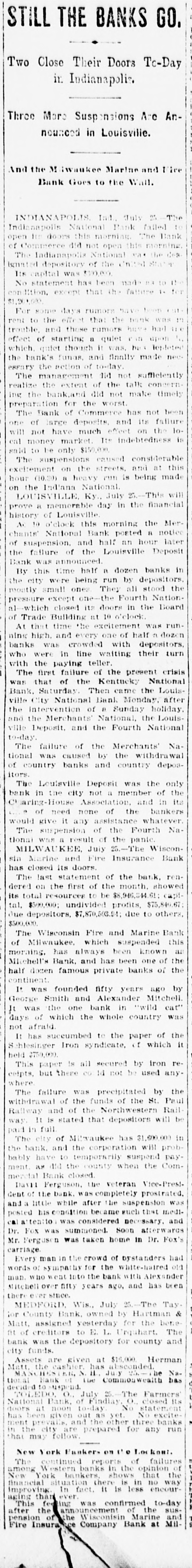 STILL THE BANKS GO. Two Close Their Doors To-Day in Indianapolis. Three More Suspensions Are Announced in Louisville. And the M iwaukee Marine and Fire Bank Goes to the Wall. INDIANAPOLIS. Ind., July 25-The Indianapolis National Bank failed to open Its doors this morning. The Bank of Commerce did not open this morning The Indianapolis National va. the dea ignated depository of the United States Its capital was $300,000. No statement has been made 11.4 to 110 condition. except that the faiture 1. to $1,201,000. For some days rumors have been CUT rent to the effect that the bank was : trouble, and those rumors have had ... . effect of starting a quiet non upon . which. quiet though it was. has tepleted the bank's funds, and finally made nec essary the action of to-day. The management 114 not sufficiently realize the extent of the talk concern ing the bank,and did not make timely preparation for the worst. The Bank of Commerce has not been one of large deposits. and its failure will not have much effect on the local money market. Its indebtedness is said to be only $150,000 The suspensions caused considerable excitement on the streets. and at this hour (10.30) a heavy run is being made on the Indiana National. LOUISVILLE, Ky., July 25.-This will prove a memorable day in the financial history of Louisville. As 10 o'clock this morning the Merchants' National Bank posted H notice of suspension. and half an hour later the failure of the Louisville Deposit Bank was announced. By this time half a dozen banks in the city were being run by depositors mostly small ones They all stood the pressure except one-the Fourth Nation al-which closed its doors in the Board of Trade Building at 10 o'clock. At that time the excitement was run ning high, and every one of half n dozer banks was crowded with depositors who were in line waiting their turr with the paying teller. The first failure of the present crisis was that of the Kentucky Nationa Bank, Saturday. Then came the Louis ville City National Bank Monday, after the intervention of P Sunday holiday