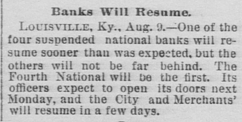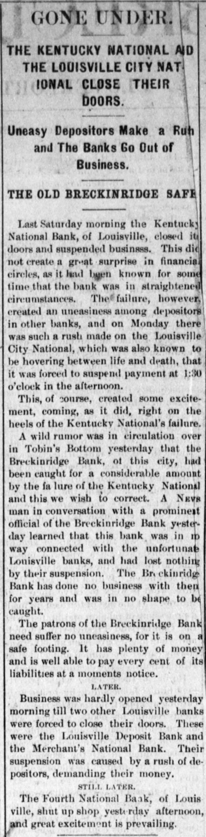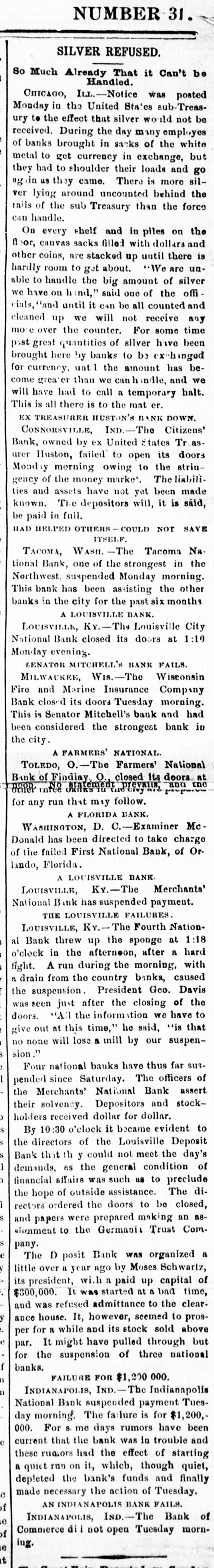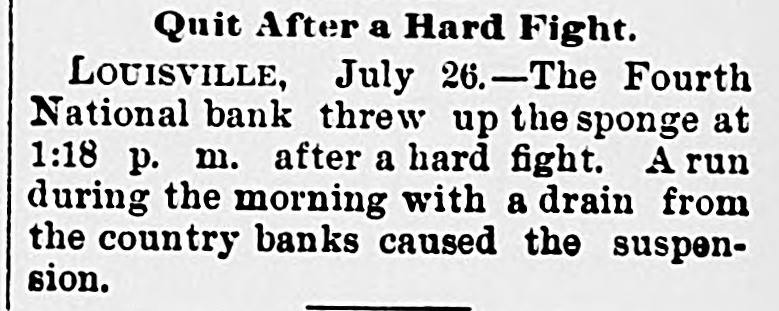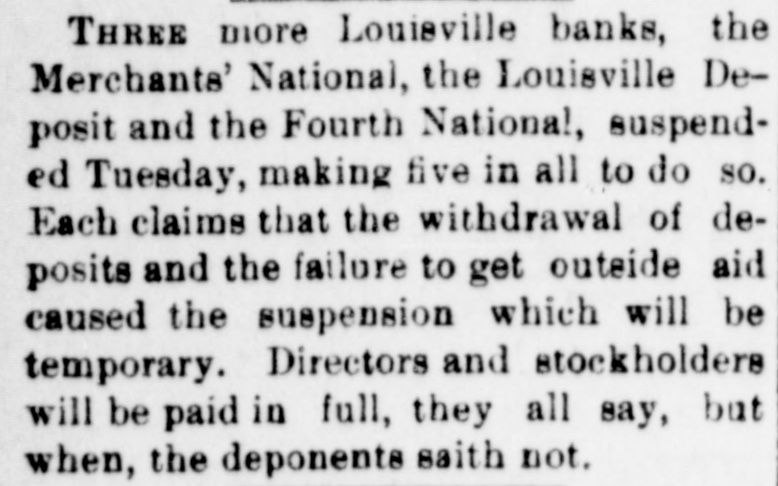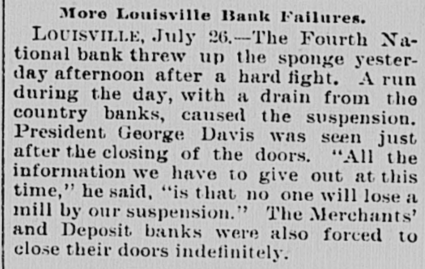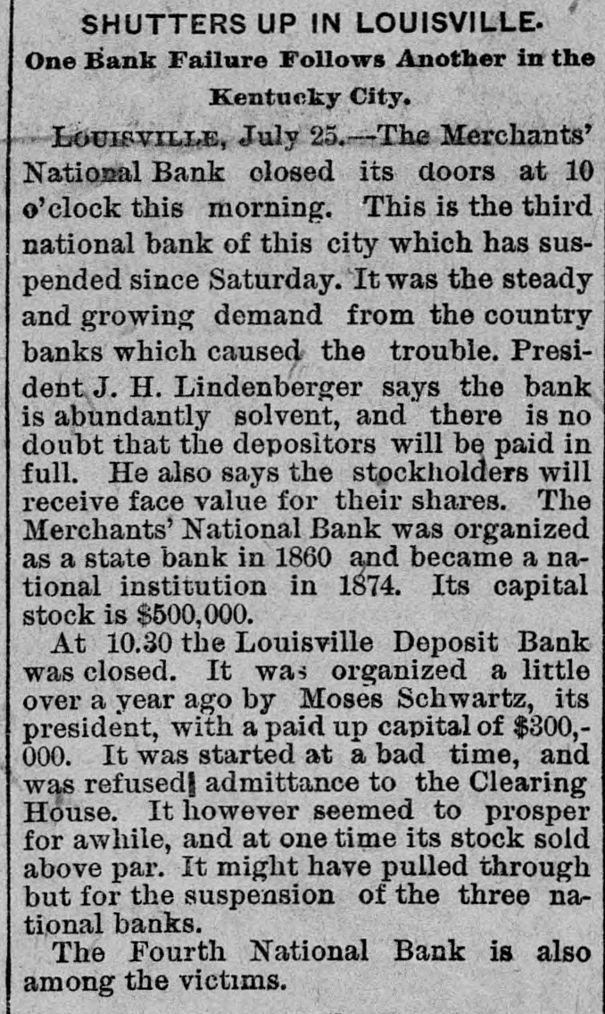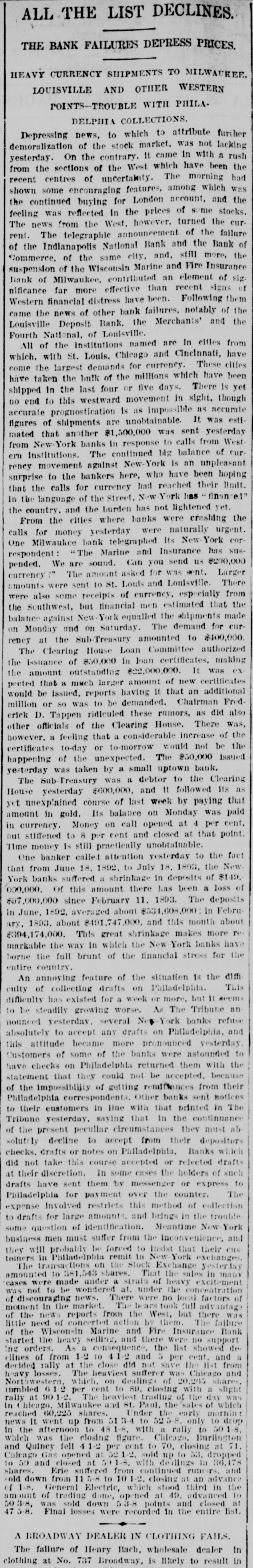 STILL THE BANKS GO. Two Close Their Doors To-Day in Indianapolis. Three More Suspensions Are Announced in Louisville. And the M iwaukee Marine and Fire Bank Goes to the Wall. INDIANAPOLIS. Ind., July 25-The Indianapolis National Bank failed to open Its doors this morning. The Bank of Commerce did not open this morning The Indianapolis National va. the dea ignated depository of the United States Its capital was $300,000. No statement has been made 11.4 to 110 condition. except that the faiture 1. to $1,201,000. For some days rumors have been CUT rent to the effect that the bank was : trouble, and those rumors have had ... . effect of starting a quiet non upon . which. quiet though it was. has tepleted the bank's funds, and finally made nec essary the action of to-day. The management 114 not sufficiently realize the extent of the talk concern ing the bank,and did not make timely preparation for the worst. The Bank of Commerce has not been one of large deposits. and its failure will not have much effect on the local money market. Its indebtedness is said to be only $150,000 The suspensions caused considerable excitement on the streets. and at this hour (10.30) a heavy run is being made on the Indiana National. LOUISVILLE, Ky., July 25.-This will prove a memorable day in the financial history of Louisville. As 10 o'clock this morning the Merchants' National Bank posted H notice of suspension. and half an hour later the failure of the Louisville Deposit Bank was announced. By this time half a dozen banks in the city were being run by depositors mostly small ones They all stood the pressure except one-the Fourth Nation al-which closed its doors in the Board of Trade Building at 10 o'clock. At that time the excitement was run ning high, and every one of half n dozer banks was crowded with depositors who were in line waiting their turr with the paying teller. The first failure of the present crisis was that of the Kentucky Nationa Bank, Saturday. Then came the Louis ville City National Bank Monday, after the intervention of P Sunday holiday