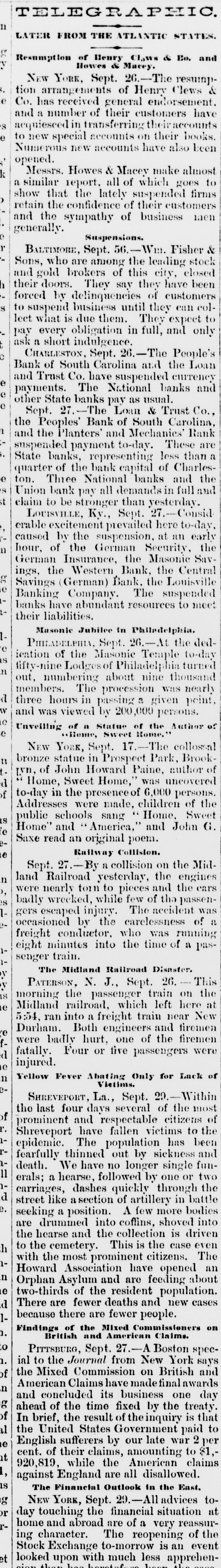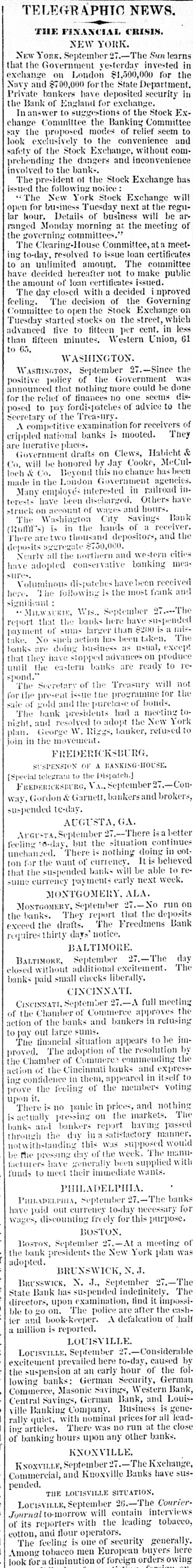 TELEGRAPHIC NEWS. THE FINANCIAL CRISIS. NEW YORK. NEW YORK, September 27.-The Sun learns that the Government vesterday invested in exchange on London $1,500,000 for the Navy and 8700,000 for the State Department. Private bankers have deposited security in the Bank of England for exchange. In answer to suggestions of the Stock Exchange Committee the Banking Committee say the proposed modes of relief seem to look exclusively to the convenience and safety of the Stock Exchange, without comprehending the dangers and inconvenience involved to the bankThe president of the Stock Exchange has issued the following notice "The New York Stock Exchange will open for business Tuesday next at the regular hour. Details of business will be arranged Monday morning at the meeting of the governing committees." The Clearing-House Committee, at meeting to-day, resolved to issue loan certificates to an unlimited amount. The committee have decided hereafter not to make public the amount of loan certificates issued. The day closed with a decided improved feeling. The decision of the Governing Committee to open th Stock Exchange on Tuesday started stocks on the street, which advanced five to fifteen per cent. in less than tifteen minutes. Western Union, 61 65, WASHINGTON. WASHINGTON September 27.-Since the positive policy of the Government was announced that nothing more could be done for the relief of finances no one seems disposed to pay fordispatches of advice to the Secretary of the Treasury. A competitive examination for receivers of crippled national banks is mooted. They are luerativeplaces. Government drafts on Clews, Habieht & Co. will be honored by Jay Cooke, McCulloch Co. Beyond this no change has been made in the London Government agencies. Many employés interested in railroad in. terests have been discharged. Others have struck on account of wages and hours. The Washington City Savings Bank (Rumns) is in the hands of a receiver. There aretwo thousand depositors, and the deposits aggregate 8750,000. Nearly all the northern and western cities have adopted conservative banking measures. Voluminous dispatches have been received here. The following is the most frank and significant MILWAURIE, Wis. September 27.---The report that the banks here have suspended payment of sums larger than 8200 a mistake. No such action has been taken. The banks are doing business as usual, except that they have stopped advances on produce until the eastern banks are ready to respond. The Secretary of the Treasury will not for the present issue the programme for the sale of gold and the purchase of bonds. The bank presidents had a meeting tonight, and resolved to adopt the New York plan. George W. Rizgs, banker, refused to join in the movement. PREDERICKSBURG. si SPENSION OF A BANKING-HOUSE [Special telegram to the Dispatch.] FREDERICKSBURG, V.I. September 27. way, Gordon Garnett. bankers: and brokers, suspended tc-day. AUGUSTA, GA. AUGUSTA September 27.--There sabetter feeling 16-day but the situation continues unchanged. There is nothing doing in cot. (on for the want of currency. It s believed that the suspended banks will be able to resame currency pay ments early next week, MONTGOMERY, ALA. MONTGOMERY September 27.-No run on the banks. They report that the deposits exceed the drafts. The Freedmens Bank requires thirty days notice. BALTIMORE. BALTIMORE, September 27.-The day closed without additional excitement The banks paid small checks liberally. CINCINNATI. CINCINNATI. September 27.-A full meeting of the Chamber of Commerce approves the action of the banks and bankers in refusing to pay out large sums. The financial situation appears to be improved. The adoption of the resolution by the Chamber of Commerce commending the action of the Cincinnati banks and expressing confidence in them, appeared in itself to prove the feeling of the members voting upon There is no panie in prices, and nothing is actually pressing on the markets. The banks and bankers report having passed through the day in it satisfactory manner, notwithstanding this was supposed would be the pressing day of the week. The manufacturers have generally been supplied with funds to meet their immediate wants. PHILADELPHIA. PHILADELPHIA, September 27.-The banks have paid out currency to-day necessary for wages, discounting freely for this purpose. BOSTON. BOSTON, September 27.-At a meeting of the bank presidents the New York plan was adopted. BRUNSWICK, N.J. BRUSSWICK. N. J., September 27.-The State Bank has suspended indefinitely, The directors, upon examination, find it impossible to o on. The police are after the cashier and book-keeper. A defalcation of half a million is reported. LOUISVILLE LOUISVILLE, September 27.-Considerable excitement prevailed here to-day, caused by the suspension at an early hour of the following banks: German Security, German Commerce, Masonic Savings, Western Bank Central Savings, German Bank, and Louisville Banking Company. Business is generally quiet, with nominal prices for all leading articles. There was no run at the close of banking hours upon any other banks, KNOXVILLE. KNOXVILLE, September -The Kxchange Commercial, and Knoxville Banks have suspended. THE LOUISVILLE SITUATION, LOUISVILLE, September 26.-The CourierJournal to-morrow will contain interviews of its reporters with the leading tobacco, one of security men cotton, look Among The for a feeling and tobacco diminution flour is operators. European buyers generally. here of foreign orders owing