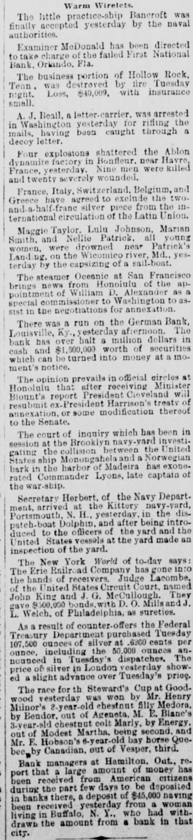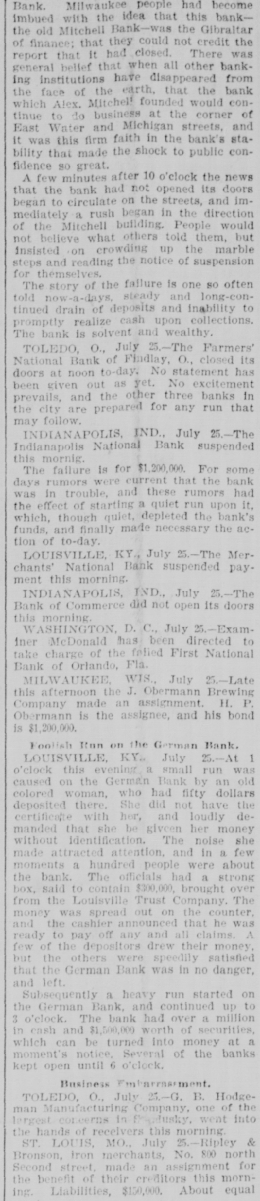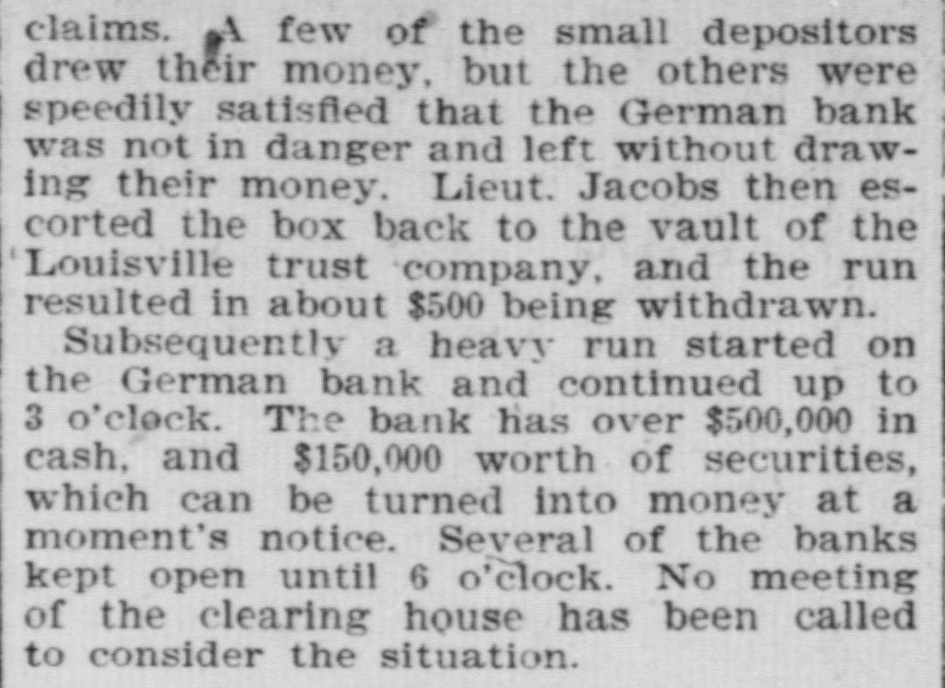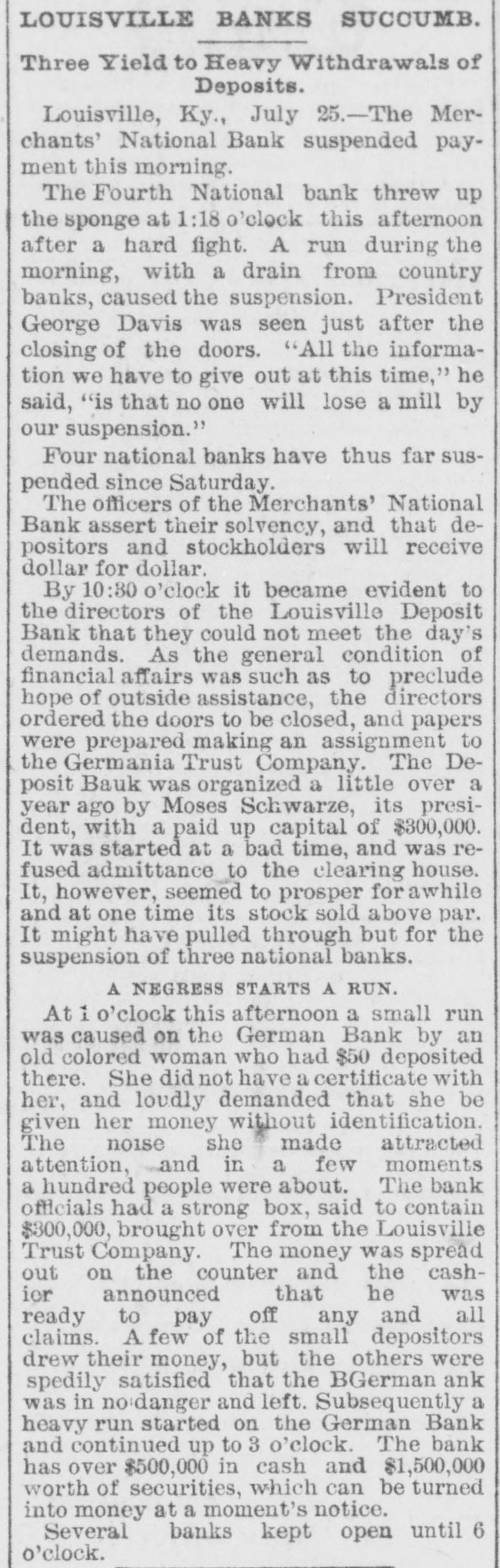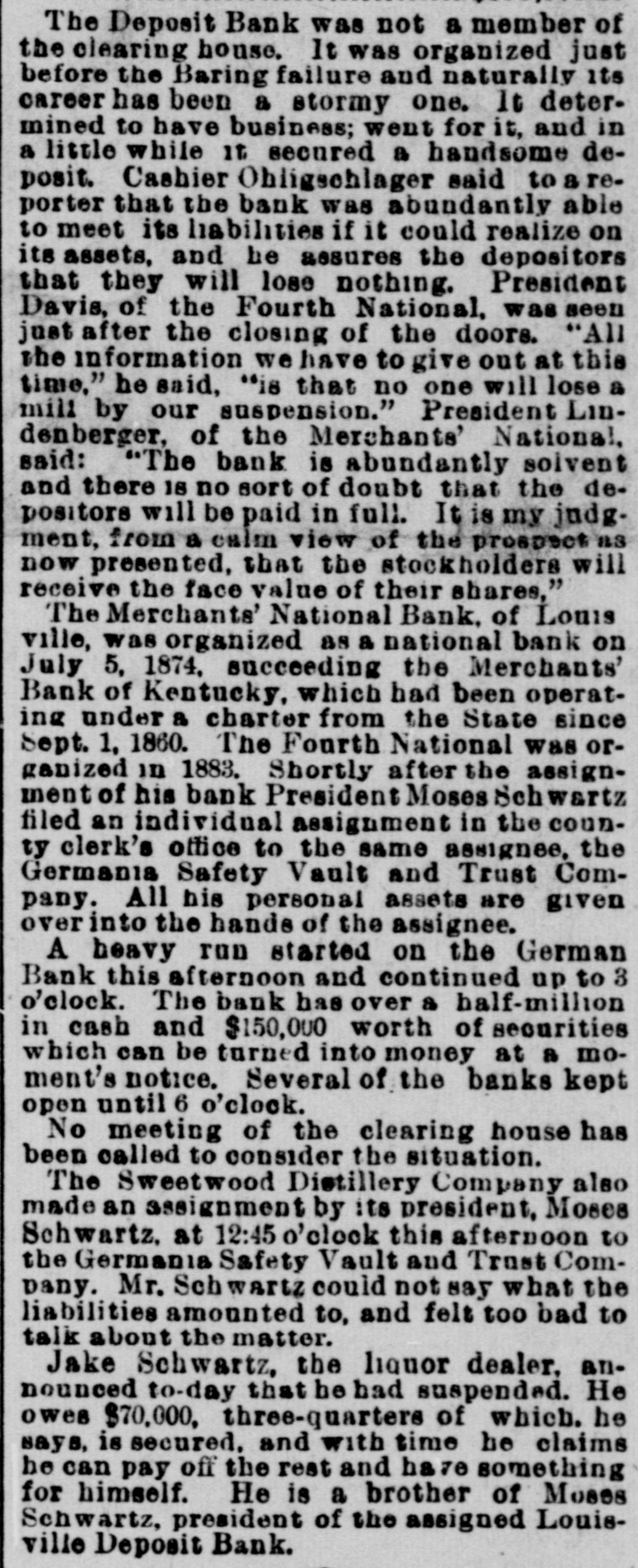 The Deposit Bank was not a member of the clearing house. It was organized just before the Baring failure and naturally its career has been a stormy one. It determined to have business; went for it, and in a little while it secured a handsome deposit. Cashier Obligschlager said to a reporter that the bank was abundantly able to meet its liabilities if it could realize on its assets, and he assures the depositors that they will lose nothing. President Davis, of the Fourth National, was seen just after the closing of the doors. "All the information we have to give out at this time," he said, "is that no one will lose a mili by our suspension." President Lindenberger, of the Merchants' National, said: "The bank is abundantly solvent and there 18 no sort of doubt that the depositors will be paid in full. It is my judg. ment, from a calm view of the prospect as now presented, that the stockholders will receive the face value of their shares," The Merchants' National Bank, of Louis ville, was organized as a national bank on July 5, 1874, succeeding the Merchants' Bank of Kentucky, which had been operating under a charter from the State since Sept. 1, 1860. The Fourth National was organized in 1883. Shortly after the assign. ment of his bank President Moses Sch wartz filed an individual assignment in the county clerk's office to the same assignee, the Germania Safety Vault and Trust Company. All his personal assets are given over into the hands of the assignee. A heavy run started on the German Bank this afternoon and continued up to 3 o'clock. The bank has over a half-million in cash and $150,000 worth of securities which can be turned into money at a moment's notice. Several of the banks kept open until 6 o'clock. No meeting of the clearing house has been called to consider the situation. The Sweetwood Distillery Company also made an assignment by its president, Moses Schwartz. at 12:45 o'clock this afternoon to the Germania Safety Vault and Trust ComDany. Mr. Sch wartz could not say what the liabilities amounted to, and felt too bad to talk about the matter. Jake Schwartz, the liquor dealer. announced to-day that he had suspended. He owes $70,000. three-quartere of which. he says, is secured. and with time he claims he can pay off the rest and ha 70 something for himself. He is a brother of Moses Schwartz, president of the assigned Louisville Deposit Bank.
