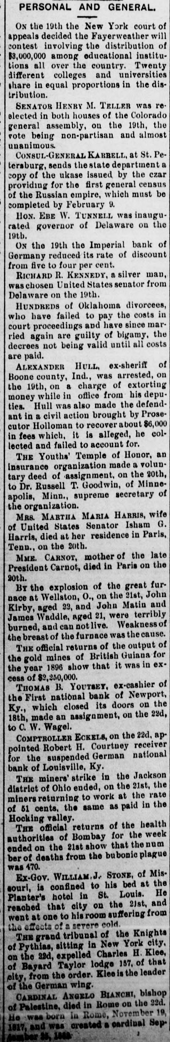 PERSONAL AND GENERAL. ON the 19th the New York court of appeals decided the Fayerweather will contest involving the distribution of over tions $3,000,000 all among the educational country. Twenty institudifferent colleges and universities share in equal proportions in the distribution. SENATOR HENRY M. TELLER was reelected in both houses of the Colorado general assembly, on the 19th, the vote being non-partisan and almost unanimous. CONSUL-GENERAL KARRELL, at St. Petersburg, sends the state department copy of the ukase issued by the czar census of be providing the Russian for the empire, first which general must completed by February 9. HON. EBE W. TUNNELL was inaugurated governor of Delaware on the 19th. ON the 19th the Imperial bank of Germany reduced its rate of discount from five to four per cent. RICHARD R. KENNEDY, a silver man, was chosen United States senator from Delaware on the 19th. HUNDREDS of Oklahoma divorcees, who have failed to pay the costs in court married are the again proceedings guilty and have of bigamy. since decrees not being valid until all costs are paid. ALEXANDER HULL, ex-sheriff of Boone county, Ind., was arrested, on the 19th, on a charge of extorting money while in office from his deputies. Hull was also made the defendant in a civil action brought by Prosecutor Holloman to recover about $6,000 in fees which, it is alleged, he collected and failed to account for. THE Youths' Temple of Honor, an insurance organization made a voluntary deed of assignment, on the 20th, to Dr. Russell T. Goodwin, of Minneapolis, Minn., supreme secretary of the organization. MRS. MARTHA MARIA HARRIS, wife of United States Senator Isham G. Harris, died at her residence in Paris, Tenn., on the 20th. MME. CARNOT, mother of the late President Carnot, died in Paris on the 20th. BY the explosion of the great furon John and nace Kirby, at aged Wellston, 22, O., John the Matin 21st, and James were terribly and can not live. burned, Waddle, aged 21, Weakness of the breast of the furnace was the cause. THE official returns of the output of the gold mines of British Guiana for the year 1896 show that it was in excess of $2,250,000. THOMAS B. YOUTSEY. ex-cashier of the First national bank of Newport, closed on Ky., which its doors the 22d, the 18th, made an assignment, on to C. W. Wagel. COMPTROLLER ECKELS, on the 22d, ap Robert H. pointed Courtney national receiver for the suspended German bank of Louisville, Ky. THE miners' strike in the Jackson on to work district miners returning of Ohio ended, the at the 21st, rate the of 51 cents. the same as paid in the Hocking valley. THE official returns of the health of authorities Bombay for the week ended on the 21st show that the num ber of deaths from the bubonic plague was 470. Ex-Gov. WILLIAM.J. STONE, of Missouri, is confined to his bed at the Planter's hotel in St. Louis. He that on the 21st, and to hisroom reached went at one city suffering from the effects of a severe cold. tribunal of in THE Pythias, grand sitting of New the York Knights city, on of the Bayard 22d, expelled Taylor lodge Charles 157, H. of Klee, that city, from the order. Klee is the leader of the German wing. BIANCHI, bishop of died in on CARDINAL Palestine, ANGELO Rome the 22d. in 19, was created a Sep 1817, He was and born Rome, cardinal November number 35, 1000
