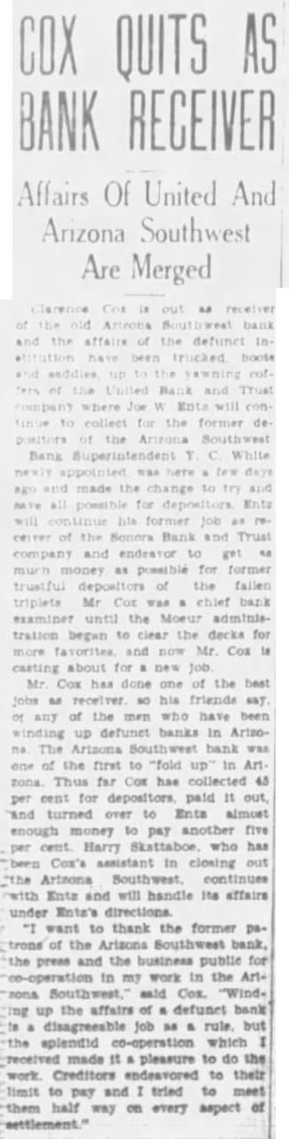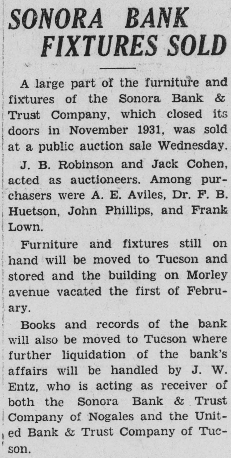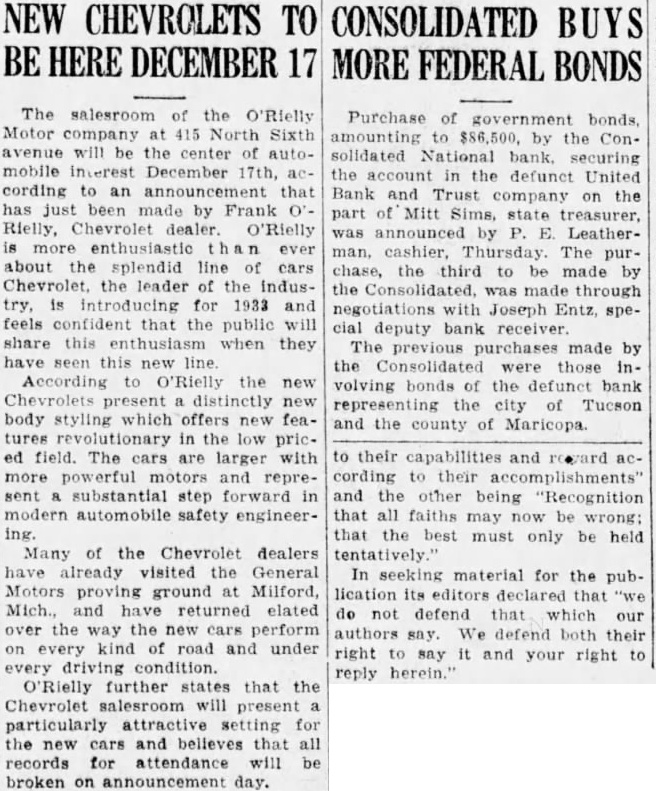 NEW CHEVROLETS TO CONSOLIDATED BUYS BE HERE DECEMBER 17 MORE FEDERAL BONDS The salesroom of the O'Rielly Motor company at 415 North Sixth avenue will be the center of automobile December 17th, cording to an that has just been made by Frank Rielly, Chevrolet dealer O'Rielly more enthusiastic ever about the splendid line of cars Chevrolet. the leader of the Industry, is introducing for 1933 and feels confident that the public will share this enthusiasm when they have seen this new line. According to O'Rielly the new Chevrolets present distinctly new body styling which offers new features revolutionary in the low priced field. The are larger with more powerful motors and represent substantial step forward in modern automobile safety engineering. Many of the Chevrolet dealers have already visited the General Motors proving ground at Milford, Mich., and have returned elated over the way the new cars perform on every kind of road and under every driving condition. O'Rielly further states that the Chevrolet salesroom will present particularly attractive setting for the new cars and believes that all records for attendance will be broken on announcement day. Purchase of government bonds, amounting to $86,500, by the Consolidated National bank. securing the in defunct United Bank and Trust company on the part of Mitt Sims, state treasurer, was announced by P. E. Leatherman, cashier, Thursday. The purchase, the third to be made by the Consolidated, was made through negotiations with Joseph Entz special deputy bank receiver The previous purchases made by the Consolidated were those involving bonds of the defunct bank representing the city of Tucson and the county of Maricopa. to their capabilities and according to their accomplishments" and the other being "Recognition that all faiths may now be wrong: that the best must only be held tentatively." In seeking material for the publication its editors declared that do not defend that which our authors say. We defend both their right to say it and your right to reply herein."