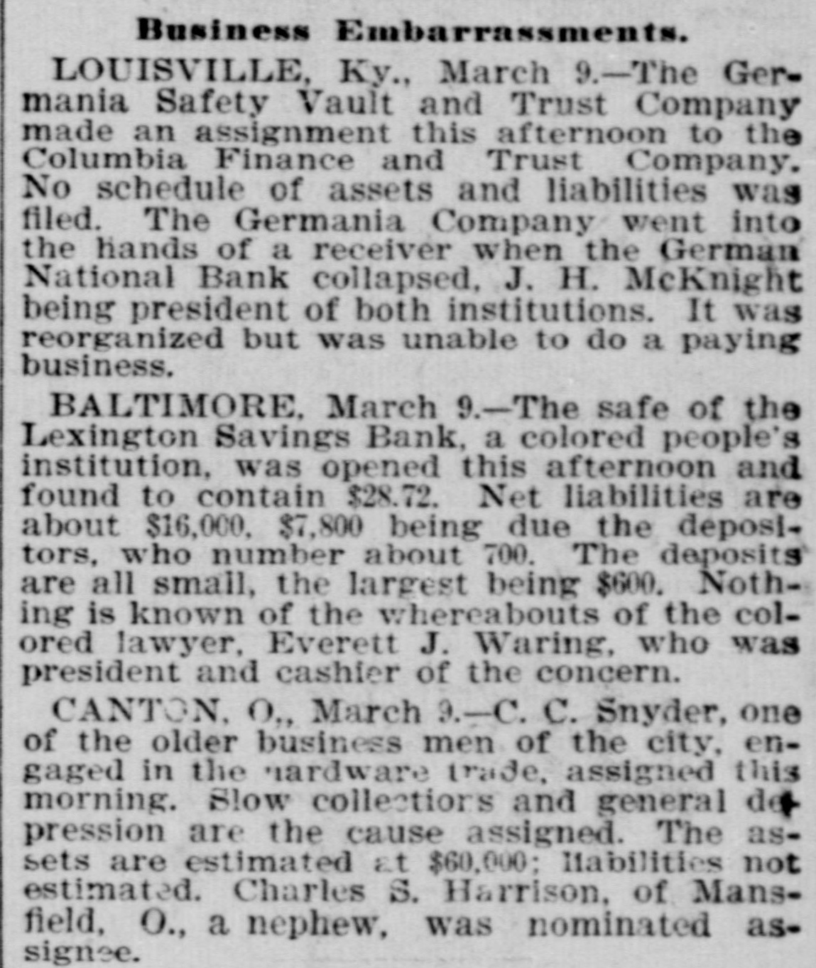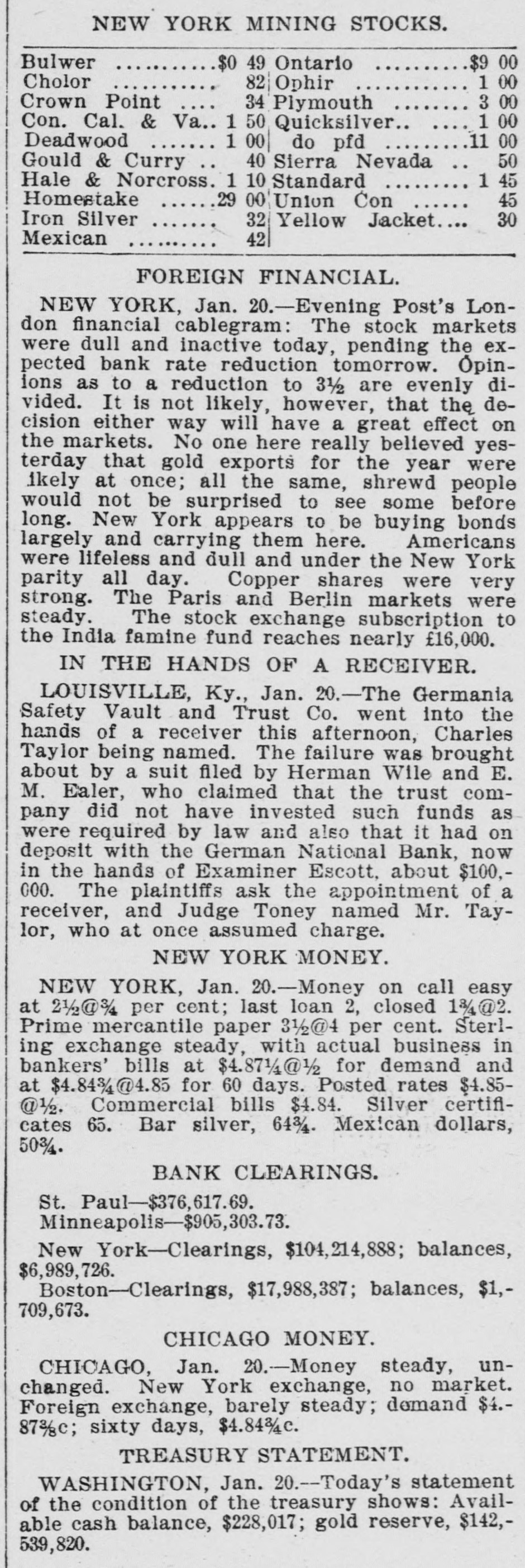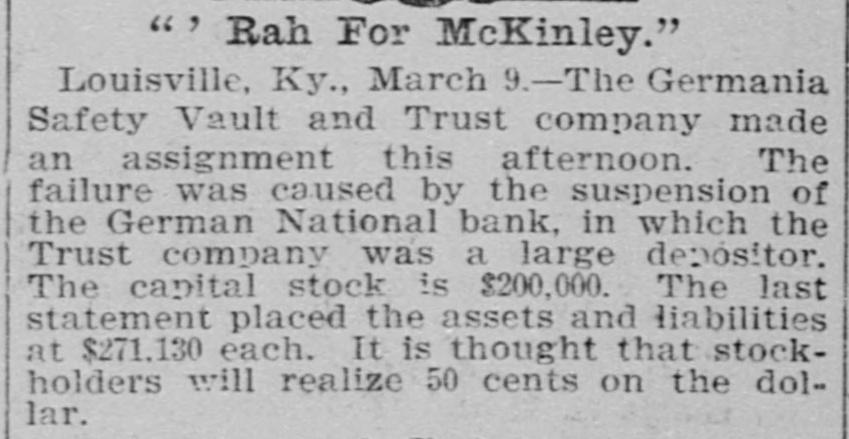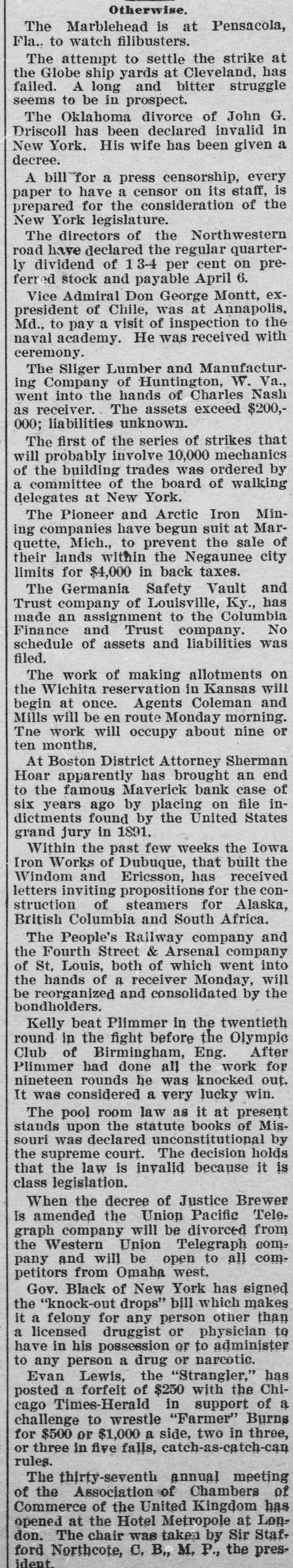 DOMESTIC. The legislature of Indiana adjourned sine die, after having been in session 61 days. Gus Norling, aged 35, a stereotyper at Kansas City, Mo., shot his wife fatally and then killed himself during a quarrel. The Consolidated Building & Saving company in Cincinnati failed for $230,000 Mr. Cannon. of Illinois, chairman of the appropriations committee of the house. soys the appropriations of the Fifty-fourth congress amounted to $1.043.437.018, which is $40,797,812 more than the appropriations for the preceding congress. Jelenke Bros. & Loeb, the largest department store in Charleston, W. Va., failed for $100,000. The German American bank at Tonawanda. N. Y., which suspended about ten days ago, has resumed business. The entire village of West Boylston, Mass., is to be destroyed to make way for new waterworks for Boston. Clara Rawson Jaccard died of starvation in New York. In two months she would have inherited $21,000. In Philadelphia Capt. John D. Hart was sentenced to two years in prison and to pay a fine of $500 for taking part in a filibustering expedition against the Spanish government in Cuba. It is said that the amount of money involved in the inaccuracies of the books of the Brotherhood of Locomotive Firemen while Eugene V. Debs was grand secretary and treasurer is $57,000. The first formal meeting of President McKinley's cabinet was held and affairs of state were considered, including the president's message to congress. Lealie Combs, the most noted moonshiner in Kentucky was found dead near Hazard with his throat cut. He is said to have killed 50 men. A train struck Orlando Howe and two sons on a trestle near Oliphant, Ark., instantly killing Howe and one son and fatally wounding the other boy. A Louisville & Nashville north-bound mail train was held up by six masked men near Calero, Ark., and the express car was robbed of $10,000. Anderson & Co.'s private bank at Pleasant Plains, III., was gutted by burglars. Three persons were killed and one other fatally wounded by a fire in a apartment building in Brooklyn, N. Y. The first official order issued by Secretary Wilson, of the department of agriculture, concerns the exportation of beef to foreign countries and provides for assurance to foreign purchasers that they receive just what they buy. The will of the late Cornelia v. R. Thayer, of Lancaster, Mass., bequeaths $200,000 to charity. The Youngstown (0.) council passed a curfew ordinance, and at nine o'clock nightly fire-alarm whistles will be blown to warn boys and girls 14 years old and less to go home. A family by the name of Wilson was drowned in Richland creek near Washington, Ind., while trying to escape from a flooded house. Damages by a freshet in the vicinity of Bedford, Ind., will reach $2,000,000, all the county roads having been washed out and swept away and farm lands ruined. At Louisville, Ky., the Germania Safety Vault & Trust company made an assignment with liabilities of $271,000. The one hundred and thirteenth session of the "Mother" conference of Methodism in America came to an end in Baltimore. The great strike of the metallic miners of Leadville, Col., which has been in progress since June 19 last, was called off by the miners' union. The California Mortgage, Loan and Trust company at San Diego failed for $200,000. A cyclone a mile wide struck Ralston, O. T., and nearly every house in town and in the path of the storm was blown down. Many persons were wounded. The Western association baseball season will open April 29 and close September 22, making a total of 126 games, The dam in the Genessee river at Mount Morris, N. Y., was washed away by a flood, causing a loss of $100,000.