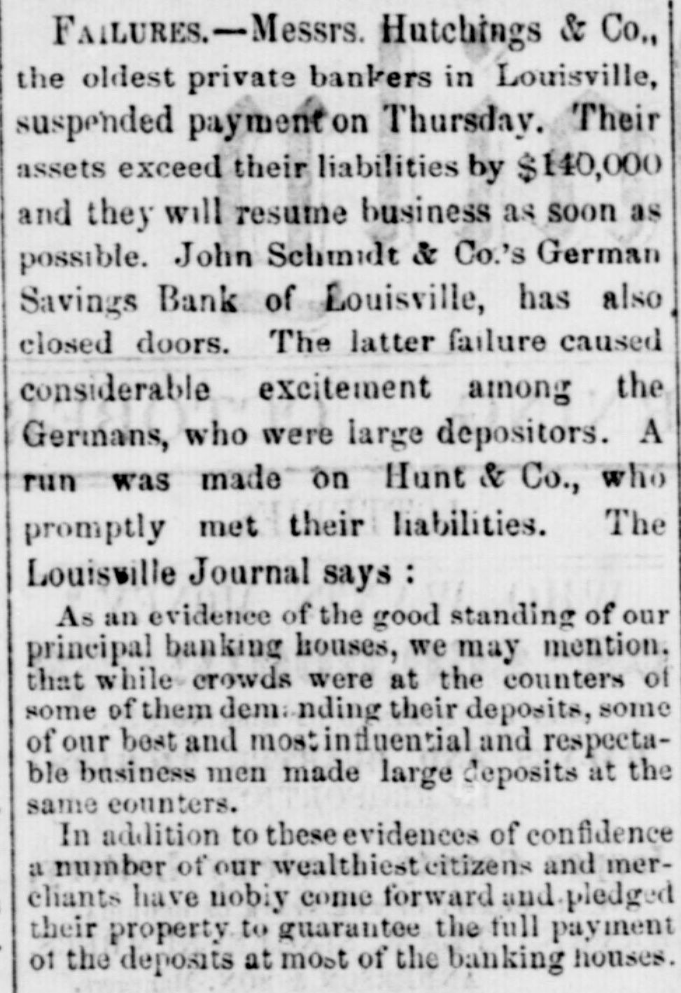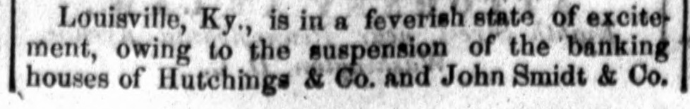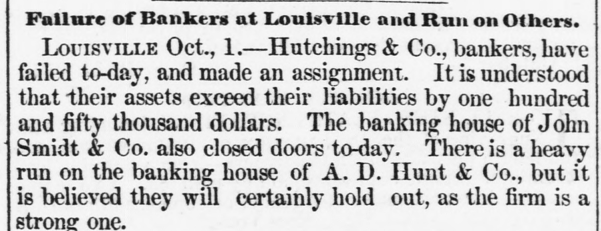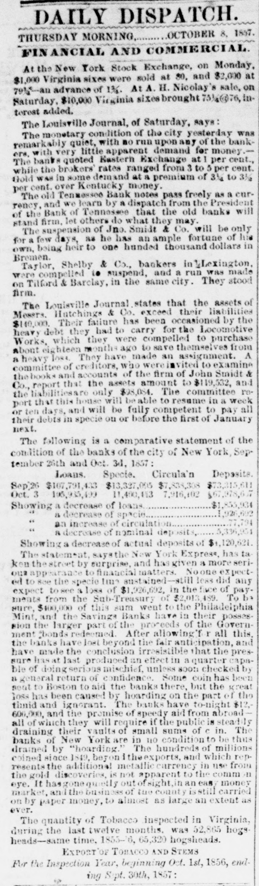Telegraphed to the New Orleans Crescent. b GRATIFYING INTELLIGENCE. 9 I CAPT. HERNDON SAVED. SIXTEEN OTHERS RESCUED. [BY THE NATIONAL AND SOUTHERN LINES.] FIRST DISPATCH. The Agent of the Associated Press is indebted to Mr. G. W. Oliver, of this city, for the following pri vate dispatch : NEW YORK, Oct. 1-Commander Herndon, of the Central America, and sixteen others, have been saved by the Adelaide. SECONDDISPATCH. NEW YORK, Oct. 1st.-It is reported here, on the authority of a private message, that Capt. Herndon, the heroic commander of the ill-fated steamer Central America, and sixteen others of her company aresafe, but we are unfortunately not informed as to the time, place and means of which their rescue was effected. THIRD DISPATCH. WASHINGTON, Oct. 1st.-Rumors are prevailing here that private d'spatches have been received, announcing the safety of Commander Herndon. The most intense excitement is felt as to the truth and details of the saving of the gallant captain of the Central America. d [NOTE.-In consequence of the prevalence of a thunder storm on the National line East of Louisville, we are unable to get any further dispatches.-Rep.] Financial News. d LOUISVILLE, Oct. 1.-Hutchings & Co., and John k Smidt & Co., bankers, have suspended. There is g much excitement in financial circles. it BOSTON, Oct. 1.-Owing to the depressed state of trade, several Lowell companies have chartered a y y ship to carry 5000 bales of cotton to Liverpool. CHARLESTON, Oct. 1.-The banks have resolved h not to suspend specie payments. on PHILADELPHIA, Oct. 1..-Money is somewhat easier and trade is more active. in LOUISVILLE, Oct. 1.-A dispatch to the Evening ed e. Bulletin says that the Exchange, Shelbyville, Lawd, renceburg and Trenton Banks of Tennessee have is suspended. 00 The run on Hunt & Co., of this city, ceased before ore the close of business. They are considered strong. as Sr. Louis, Oct. 1.-The Bank of Belleville, Illinois, ay has failed. las Moore, Hollowbush & Co., bankers, Quincy, Ill., all ar have suspended. xLOUISVILLE, Oct. 1.-All the bankers here except Hutchings & Co. and Smidt & Co., have met all their for liabilities to-day. ch rWASHINGTON, Oct. 1.-Two banks in Williamsth burg have failed. The Philadelphia banks are harmonions and are hg discounting liberally. et. Explosion. he ce PHILADELPHIA, Oct. 1.-A steam-boiler in the Ice Knickerbocker Plaster Works, in West street, exth ploded yesterday evening, injuring the adjoining Icbuildings, killing one young woman and badly inn. juring seventeen other persons. lia Charleston Banks. m CHARLESTON, Oct. 1.-The Presidents of our banks, at a meeting this morning, agreed not to susepend specie payments. Death of a Ship Captain. c., ost CHARLESTON, Oct. 1.--Thomas Dewin, late Caprs tain of the steamer Nashville, died last night of cony, sumption. eThe Fraser Forgeries. to CHARLESTON, Oct. 1.-The reported forgeries on nd John Fraser & Co., are destitute of foundation. as River Intelligence. tly ciVICKSBURG, Oct. 1.-The Edward Walsh passed irl down at P. M.