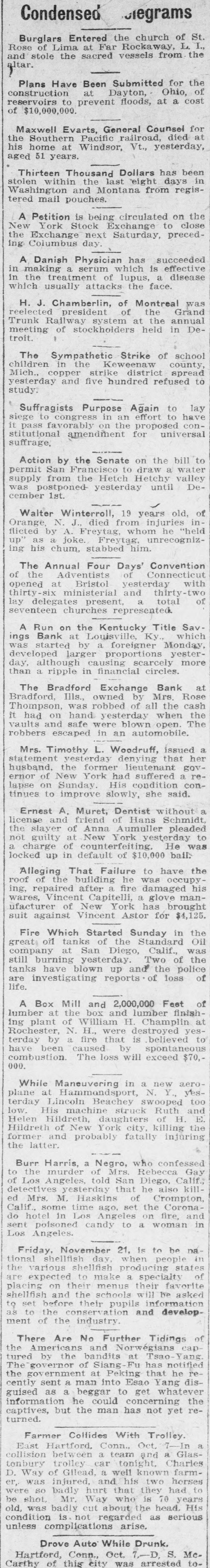 Condensed degrams Burglars Entered the church of St. Rose of Lima at Far Rockaway, L. and stole the sacred vessels from the altar. Plans Have Been Submitted for the construction at Dayton, Ohio, of reservoirs to prevent floods, at a cost of $10,000,000. Maxwell Evarts, General Counsel for the Southern Pacific railroad, died at his home at Windsor, Vt., yesterday, aged 51 years. Thirteen Thousand Dollars has been stolen within the last "eight days in Washington and Montana from registered mail pouches. A Petition is being circulated on the New York Stock Exchange to close the Exchange next Saturday, preceding Columbus day A Danish Physician has succeeded in making a serum which is effective in the treatment of lupus, a disease which usually attacks the face. H. J. Chamberlin, of Montreal was reelected president of the Grand Trunk Railway system at the annual meeting of stockholders held in Detroit. The Sympathetic Strike of school children in the Keweenaw county Mich., copper strike district spread yesterday and five hundred refused to study. Suffragists Purpose Again to lay siege to congress in an effort to have it pass favorably on the proposed constitutional amendment for universal suffrage, Action by the Senate on the bill to permit San Francisco to draw a water supply from the Hetch Hetchy valley was postponed yesterday until December 1st. Walter Winterroll, 19 years old, of Orange, N. J died from injuries inflicted by A. Freytag, whom he "held up' as a joke. Freytag, unrecognizing his chum. stabbed him. The Annual Four Days' Convention of the Adventists of Connecticut opened at Bristol yesterday with thirty-six ministerial and thirty-two of lay delegates present, total seventeen churches represented A Run on the Kentucky Title Sav ings Bank at Louisville, Kv. which was started by a foreigner Monday developed larger proportions yesterday. although causing scarcely more than a ripple in financial circles. The Bradford Exchange Bank at Bradford, Ills., owned by Mrs. Rose Thompson, was robbed of all the cash it had on hand yesterday when the vaults and safe were blown open. The robbers escaped in an automobile. Mrs. Timothy L. Woodruff, issued a statement vesterday denving that her husband, the former lieutenant governor of New York had suffered a relapse on Sunday. His condition continues to improve slowly, she said. Ernest A. Muret, Dentist without a license and friend of Hans Schmidt the slayer of Anna Aumuller pleaded not guilty at New York yesterday to a charge of counterfeiting. He was locked up in default of $10,000 bail. Alleging That Failure to have the roof of the building he was occupying. repaired after fire damaged his wares, Vincent Capitelli, a glove manufacturer of New York has brought suit against Vincent Astor for $4,125. Fire Which Started Sunday in the great oil tanks of the Standard Oil company at San Diego, Calif., was still burning yesterday Two of the tanks have blown up and the police are investigating reports of loss of life. A Box Mill and 2,000,000 Feet of lumber at the box and lumber finishing plant of William H. Champlin at Rochester, N. H., were destroyed yesterday by a fire that is believed to have been caused by spontaneous combustion. The loss will exceed $70,000. While Maneuvering in a new aeroplane at Hammondsport, N. Y., yesterday Lincoln Beachey swooped too low. His machine struck Ruth and Helen Hildreth, daughters of H. E Hildreth of New York city, killing the former and probably fatally injuring the latter. Burr Harris, a Negro, who confessed to the murder of Mrs. Rebecca Gay of Los Angeles, told San Diego, Calif. detectives yesterday that he also kill ed Mrs. M. Haskins of Crompton, Calif.. some time ago, set the Coronado hotel in Los Angeles on fire, and sent poisoned candy to a woman in Los Angeles. Friday, November 21, is to be na tional shellfish day. when people in the various shellfish producing states are expected to make a specialty of placing on their menus their favorite shellfish and the schools will he asked to set before their pupils information as to the conservation and development of the industry. There Are No Further Tidings of the Americans and Norwégians cap tured by the bandits at Tsao Yang The governor of Siang-Fu has notified the government at Peking that he recently sent a man into Esao Yang disguised as a beggar to get whatever information he could concerning the captives, but the man has not yet returned. Farmer Collides With Trolley. East Hartford. Conn. Oct. 7-In a collision between a team and a Glastonbury trolley car tonight, Charles D. Way of Gllead, a well known farmer. was injured, and his two horses were so badly hurt that they had to be shot, Mr. Way who is 70 years old. was badly cut about the head His condition is not regarded as serious unless complications arise. Drove Auto While Drunk. Hartford, Conn., Oct. 7-D S. McCarthy of this city was arrested to-