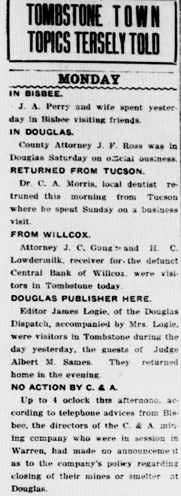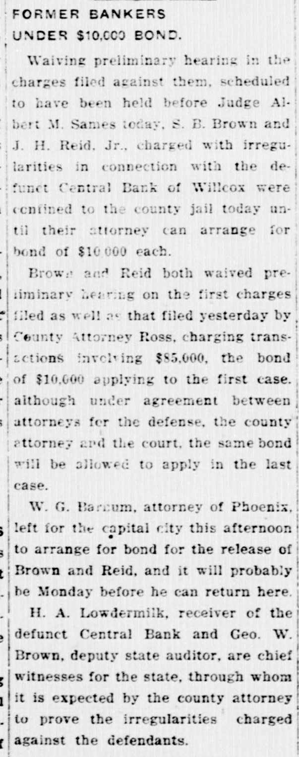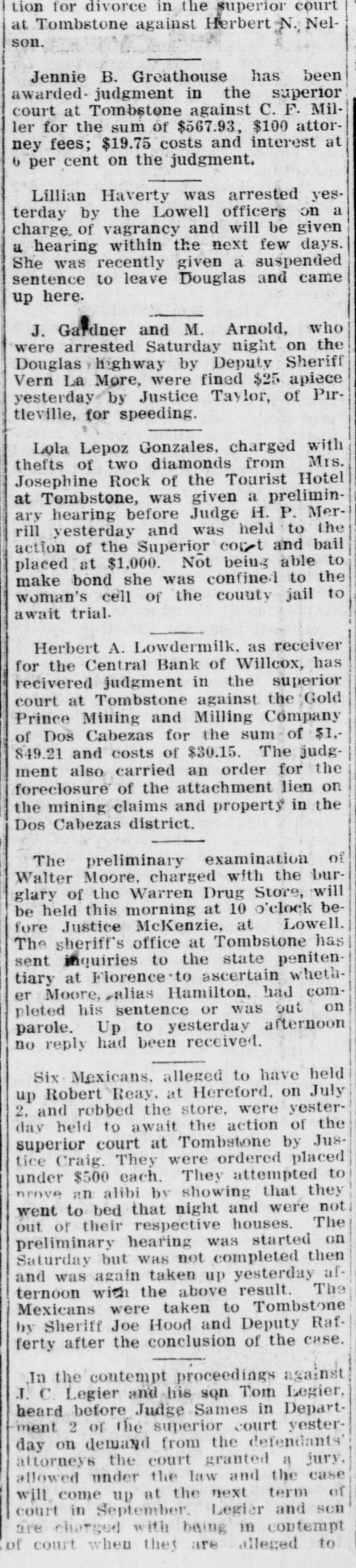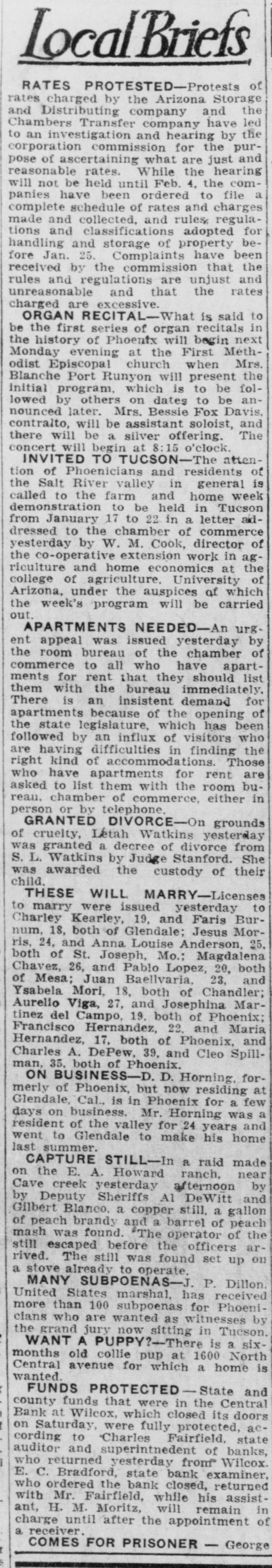 LocalBriefs RATES PROTESTED-Protests of rates charged by the Arizona Storage and company and the Chambers Transfer company Distributing have by the led to an investigation and hearing commission corporation for the just pur- and pose of ascertaining what are reasonable rates. While the hearing will not be held until Feb. 4. the companies have been ordered to file a schedule of rates made and complete and collected, rules and charges regulations and classifications adopted for handling and storage of property before Jan. 25. Complaints have been received by the commission that the rules and regulations are unjust and unreasonable and that the rates charged are excessive. ORGAN RECITAL-What is said to be the first series of organ recitals in the history of Phoenix will begin next Monday evening at the First Methodist church when Mrs. Port Runyon will Blanche Episcopal present fol- the initial program, which is to be lowed by others on dates to be announced later. Mrs. Bessie Fox Davis, contraito, will be assistant soloist, The and there will be a silver offering. concert will begin at 8:15 o'clock. INVITED TO TUCSON-The attention of Phoenicians and residents of is the Salt River valley in general called to the farm and home week demonstration to be held in Tucson from January 17 to 22 in a letter aiddressed to the chamber of commerce yesterday by W. M. Cook, director of the co-operative extension work in agriculture and home economics at the college of agriculture, University of Arizona, under the auspices of which the week's program will be carried out. APARTMENTS NEEDED-An urg. ent appeal was issued yesterday by the room bureau of the chamber of commerce to all who have apartments for rent that they should list them with the bureau immediately. There is an insistent demand for apartments because of the opening of the state legislature, which has been followed by an influx of visitors who are having difficulties in finding the right kind of accommodations. Those who have apartments for rent are asked to list them with the room buin reau, chamber of commerce, either person or by telephone GRANTED DIVORCE-On grounds of cruelty, Letah Watkins yesterday was granted a decree of divorce from S. L. Watkins by Judge Stanford. She was awarded the custody of their child. THESE WILL MARRY-Licenses to marry were issued yesterday to Charley Kearley, 19, and Faris Burnum, 18, both of Glendale; Jesus Morris. 24, and Anna Louise Anderson, 25, both of St. Joseph, Mo.; Magdalena Chavez, 26, and Pablo Lopez, 20, both of Mesa; Juan Baellvaria, 23, and Ysabela Mori, 18, both of Chandler; Aurello Viga, 27, and Josephina Martinez del Campo, 19. both of Phoenix; Francisco Hernandez, 22. and Maria Hernandez, 17. both of Phoenix, and Charles A. DePew, 39, and Cleo Spillman, 35. both of Phoenix. ON BUSINESS-D.1 D. Horning, formerly of Phoenix, but now residing at Glendale, Cal., is in Phoenix for a few days on business. Mr. Horning was resident of the valley for 24 years and went to Glendale to make his home last summer. CAPTURE STILL-In a raid made on the E. A. Howard ranch, near Cave creek yesterday afternoon by by Deputy Sheriffs A1 DeWitt and Gilbert Blanco. a copper still, a gallon of peach brandy and a barrel of peach mash was found. The operator of the still escaped before the officers arrived. The still was found set up on a stove already to operate. MANY SUBPOENAS-J P. Dillon United States marshal, has received more than 100 subpoenas for Phoenicians who are wanted as witnesses by the grand jury now sitting in Tucson. WANT A PUPPY?--There is a sixmonths old collie pup at 1600 North Central avenue for which a home is wanted. FUNDS PROTECTED - State and county funds that were in the Central Bank at Wilcox, which closed its doors on Saturday, were fully protected, according to Charles Fairfield, state auditor and superintnedent of banks, who returned yesterday from Wilcox. E. C. Bradford, state bank examiner, who ordered the bank closed, returned with Mr. Fairfield, while his assistin H. M. Moritz, will remain ant, of charge until after the appointment a receiver COMES FOR PRISONER - George