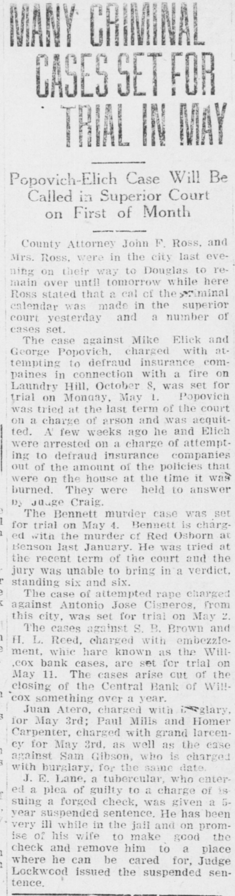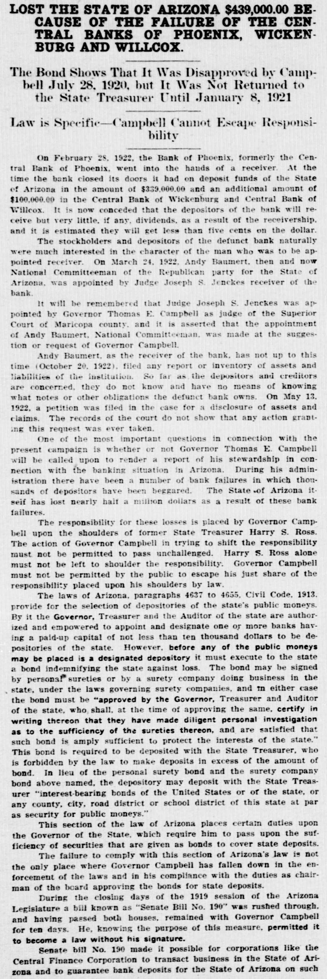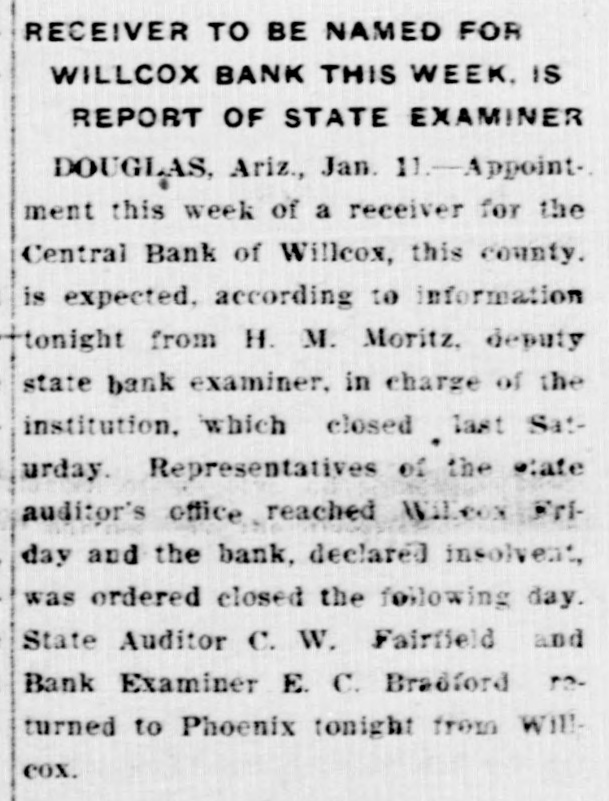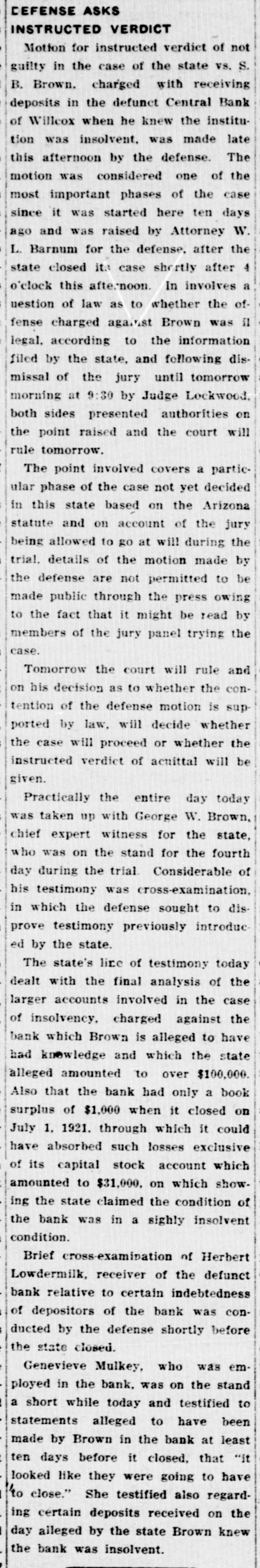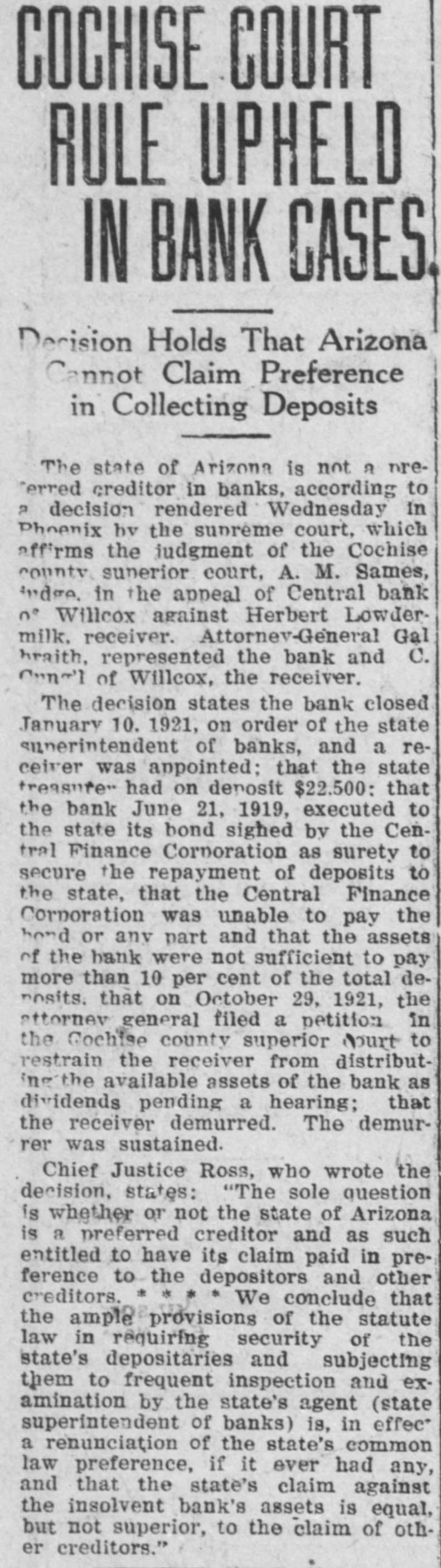 LocalBriefs RATES PROTESTED-Protests of rates charged by the Arizona Storage and company and the Chambers Transfer company Distributing have by the led to an investigation and hearing commission corporation for the just pur- and pose of ascertaining what are reasonable rates. While the hearing will not be held until Feb. 4. the companies have been ordered to file a schedule of rates made and complete and collected, rules and charges regulations and classifications adopted for handling and storage of property before Jan. 25. Complaints have been received by the commission that the rules and regulations are unjust and unreasonable and that the rates charged are excessive. ORGAN RECITAL-What is said to be the first series of organ recitals in the history of Phoenix will begin next Monday evening at the First Methodist church when Mrs. Port Runyon will Blanche Episcopal present fol- the initial program, which is to be lowed by others on dates to be announced later. Mrs. Bessie Fox Davis, contraito, will be assistant soloist, The and there will be a silver offering. concert will begin at 8:15 o'clock. INVITED TO TUCSON-The attention of Phoenicians and residents of is the Salt River valley in general called to the farm and home week demonstration to be held in Tucson from January 17 to 22 in a letter aiddressed to the chamber of commerce yesterday by W. M. Cook, director of the co-operative extension work in agriculture and home economics at the college of agriculture, University of Arizona, under the auspices of which the week's program will be carried out. APARTMENTS NEEDED-An urg. ent appeal was issued yesterday by the room bureau of the chamber of commerce to all who have apartments for rent that they should list them with the bureau immediately. There is an insistent demand for apartments because of the opening of the state legislature, which has been followed by an influx of visitors who are having difficulties in finding the right kind of accommodations. Those who have apartments for rent are asked to list them with the room buin reau, chamber of commerce, either person or by telephone GRANTED DIVORCE-On grounds of cruelty, Letah Watkins yesterday was granted a decree of divorce from S. L. Watkins by Judge Stanford. She was awarded the custody of their child. THESE WILL MARRY-Licenses to marry were issued yesterday to Charley Kearley, 19, and Faris Burnum, 18, both of Glendale; Jesus Morris. 24, and Anna Louise Anderson, 25, both of St. Joseph, Mo.; Magdalena Chavez, 26, and Pablo Lopez, 20, both of Mesa; Juan Baellvaria, 23, and Ysabela Mori, 18, both of Chandler; Aurello Viga, 27, and Josephina Martinez del Campo, 19. both of Phoenix; Francisco Hernandez, 22. and Maria Hernandez, 17. both of Phoenix, and Charles A. DePew, 39, and Cleo Spillman, 35. both of Phoenix. ON BUSINESS-D.1 D. Horning, formerly of Phoenix, but now residing at Glendale, Cal., is in Phoenix for a few days on business. Mr. Horning was resident of the valley for 24 years and went to Glendale to make his home last summer. CAPTURE STILL-In a raid made on the E. A. Howard ranch, near Cave creek yesterday afternoon by by Deputy Sheriffs A1 DeWitt and Gilbert Blanco. a copper still, a gallon of peach brandy and a barrel of peach mash was found. The operator of the still escaped before the officers arrived. The still was found set up on a stove already to operate. MANY SUBPOENAS-J P. Dillon United States marshal, has received more than 100 subpoenas for Phoenicians who are wanted as witnesses by the grand jury now sitting in Tucson. WANT A PUPPY?--There is a sixmonths old collie pup at 1600 North Central avenue for which a home is wanted. FUNDS PROTECTED - State and county funds that were in the Central Bank at Wilcox, which closed its doors on Saturday, were fully protected, according to Charles Fairfield, state auditor and superintnedent of banks, who returned yesterday from Wilcox. E. C. Bradford, state bank examiner, who ordered the bank closed, returned with Mr. Fairfield, while his assistin H. M. Moritz, will remain ant, of charge until after the appointment a receiver COMES FOR PRISONER - George