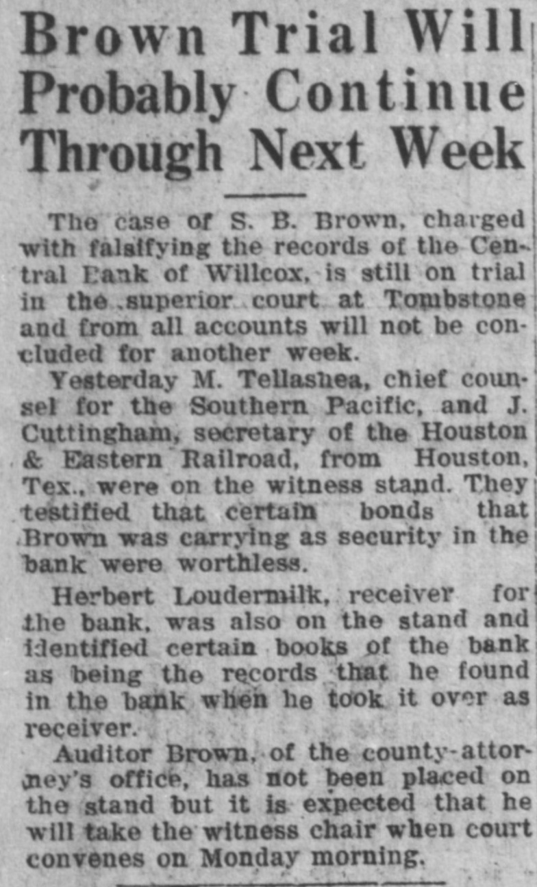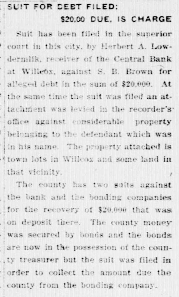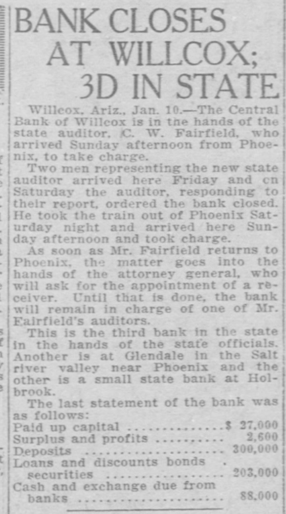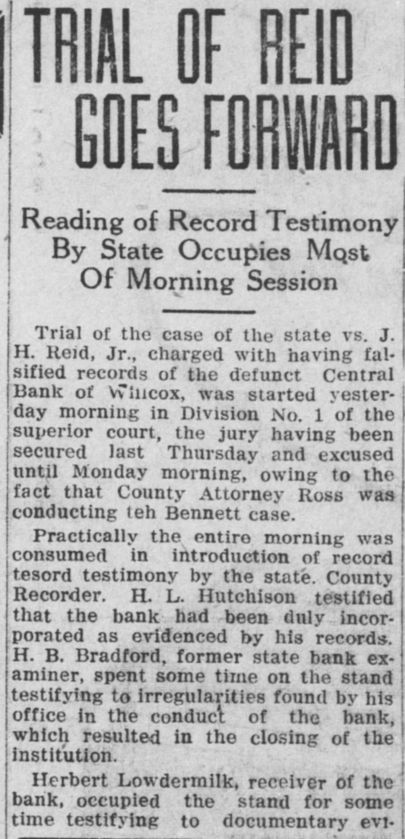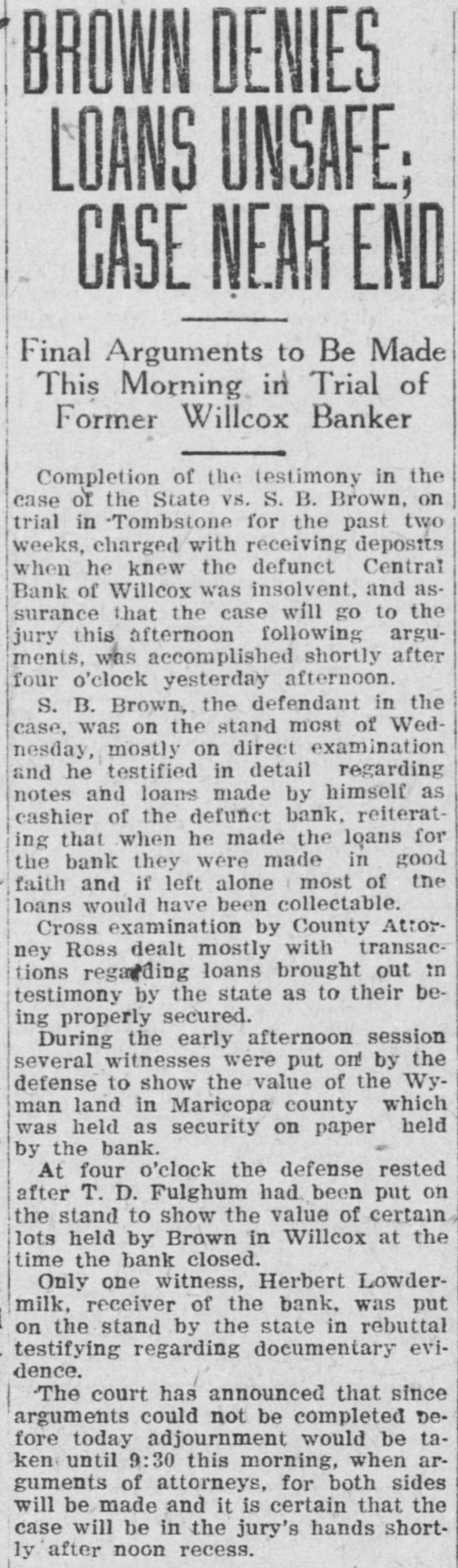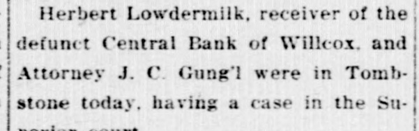 LocalBriefs RATES PROTESTED-Protests of rates charged by the Arizona Storage and company and the Chambers Transfer company Distributing have by the led to an investigation and hearing commission corporation for the just pur- and pose of ascertaining what are reasonable rates. While the hearing will not be held until Feb. 4. the companies have been ordered to file a schedule of rates made and complete and collected, rules and charges regulations and classifications adopted for handling and storage of property before Jan. 25. Complaints have been received by the commission that the rules and regulations are unjust and unreasonable and that the rates charged are excessive. ORGAN RECITAL-What is said to be the first series of organ recitals in the history of Phoenix will begin next Monday evening at the First Methodist church when Mrs. Port Runyon will Blanche Episcopal present fol- the initial program, which is to be lowed by others on dates to be announced later. Mrs. Bessie Fox Davis, contraito, will be assistant soloist, The and there will be a silver offering. concert will begin at 8:15 o'clock. INVITED TO TUCSON-The attention of Phoenicians and residents of is the Salt River valley in general called to the farm and home week demonstration to be held in Tucson from January 17 to 22 in a letter aiddressed to the chamber of commerce yesterday by W. M. Cook, director of the co-operative extension work in agriculture and home economics at the college of agriculture, University of Arizona, under the auspices of which the week's program will be carried out. APARTMENTS NEEDED-An urg. ent appeal was issued yesterday by the room bureau of the chamber of commerce to all who have apartments for rent that they should list them with the bureau immediately. There is an insistent demand for apartments because of the opening of the state legislature, which has been followed by an influx of visitors who are having difficulties in finding the right kind of accommodations. Those who have apartments for rent are asked to list them with the room buin reau, chamber of commerce, either person or by telephone GRANTED DIVORCE-On grounds of cruelty, Letah Watkins yesterday was granted a decree of divorce from S. L. Watkins by Judge Stanford. She was awarded the custody of their child. THESE WILL MARRY-Licenses to marry were issued yesterday to Charley Kearley, 19, and Faris Burnum, 18, both of Glendale; Jesus Morris. 24, and Anna Louise Anderson, 25, both of St. Joseph, Mo.; Magdalena Chavez, 26, and Pablo Lopez, 20, both of Mesa; Juan Baellvaria, 23, and Ysabela Mori, 18, both of Chandler; Aurello Viga, 27, and Josephina Martinez del Campo, 19. both of Phoenix; Francisco Hernandez, 22. and Maria Hernandez, 17. both of Phoenix, and Charles A. DePew, 39, and Cleo Spillman, 35. both of Phoenix. ON BUSINESS-D.1 D. Horning, formerly of Phoenix, but now residing at Glendale, Cal., is in Phoenix for a few days on business. Mr. Horning was resident of the valley for 24 years and went to Glendale to make his home last summer. CAPTURE STILL-In a raid made on the E. A. Howard ranch, near Cave creek yesterday afternoon by by Deputy Sheriffs A1 DeWitt and Gilbert Blanco. a copper still, a gallon of peach brandy and a barrel of peach mash was found. The operator of the still escaped before the officers arrived. The still was found set up on a stove already to operate. MANY SUBPOENAS-J P. Dillon United States marshal, has received more than 100 subpoenas for Phoenicians who are wanted as witnesses by the grand jury now sitting in Tucson. WANT A PUPPY?--There is a sixmonths old collie pup at 1600 North Central avenue for which a home is wanted. FUNDS PROTECTED - State and county funds that were in the Central Bank at Wilcox, which closed its doors on Saturday, were fully protected, according to Charles Fairfield, state auditor and superintnedent of banks, who returned yesterday from Wilcox. E. C. Bradford, state bank examiner, who ordered the bank closed, returned with Mr. Fairfield, while his assistin H. M. Moritz, will remain ant, of charge until after the appointment a receiver COMES FOR PRISONER - George
