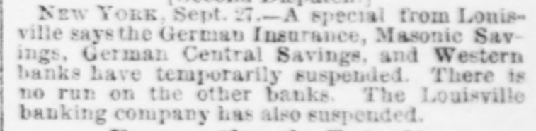 NEW YORK Sept. 27.-A special from Louisville says the German Insurance, Masonic Savings, German Central Savings, and Western banks have temporarily suspended. There is no run on the other banks. The Louisville banking company has also suspended.
