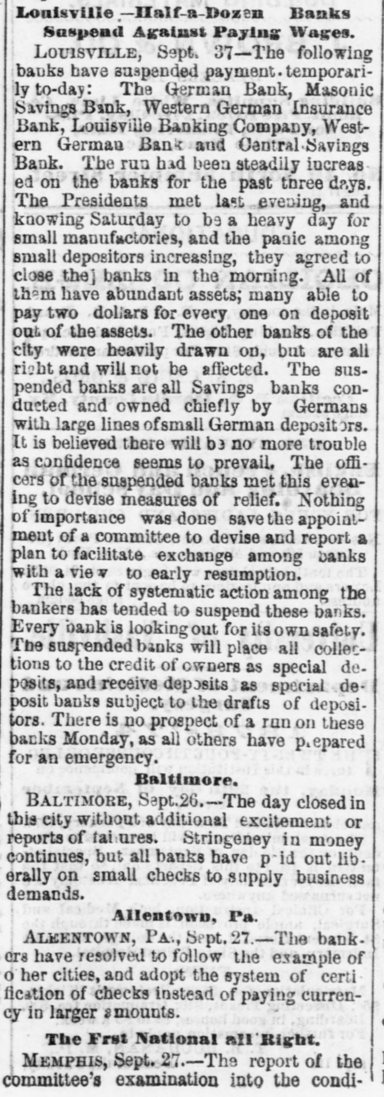 Banks Louisvilie-Half-a-Dozen Suspend Against Paying Wages. LOUISVILLE, Sept. 37-The following banks have suspended payment. temporarily to-day: The German Bank, Masonic Savings Bank, Western German Insurance Bank, Louisville Banking Company, Western German Bank and Central Savings Bank. The run had been steadily increas ed on the banks for the past three days. The Presidents met last evening, and knowing Saturday to be a heavy day for small manufactories, and the panic among small depositors increasing, they agreed to close the banks in the morning. All of them have abundant assets; many able to pay two dollars for every one on deposit out of the assets. The other banks of the city were heavily drawn on, but are all right and will not be affected. The suspended banks are all Savings banks condueted and owned chiefly by Germans with large lines ofsmall German deposit ors. It is believed there will be no more trouble as confidence seems to prevail. The officers of the suspended banks met this evening to devise measures of relief. Nothing of importance was done save the appointment of a committee to devise and report a plan to facilitate exchange among banks with a vie to early resumption. The lack of systematic action among the bankers has tended to suspend these banks. Every bank is looking out for its own safety. The suspended banks will place all collections to the credit of owners as special deposits, and receive deposits as special deposit banks subject to the drafts of depositors. There is no prospect of a run on these banks Monday, as all others have prepared for an emergency. Baltimore. BALTIMORE, Sept.26.-The - day closed in this city without additional excitement or reports of tailures. Stringency in money continues, but all banks have p-id out lib. erally on small checks to supply business demands. Allentown, Pa. ALEENTOWN, PA., Sept. 27.-The bank. crs have resolved to follow the example of o her cities, and adopt the system of certi fication of checks instead of paying currency in larger amounts. The Frst National all Right. MEMPHIS, Sept. 27.-The report of the committee's examination into the condi-