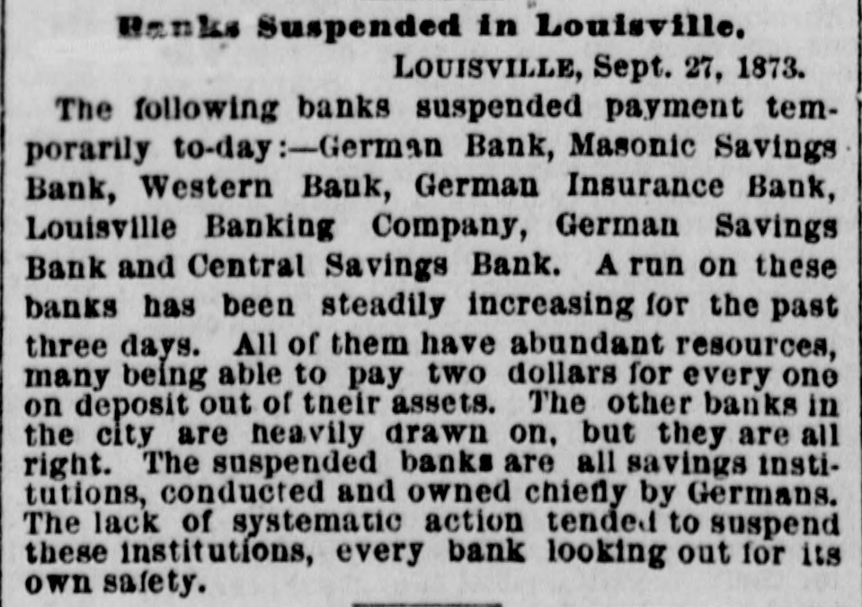 Part of the nationwide panic of September 1873; depositors increased withdrawals for several days leading to a run on Louisville savings banks including Masonic Savings Bank.