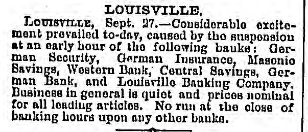 LOUISVILLE, LOUISVILLE, Sept. 27.-Considerable exoitement prevailed to-day, caused by the suspension at an early hour of the following bauks: German Security, German Insurance, Masonio Savings, Western Bank, Central Savings, German Bank, and Louisvillo Banking Company. Business in general is quiet and prices nominal for all leading articles. No run at the close of banking hours upon any other banks.