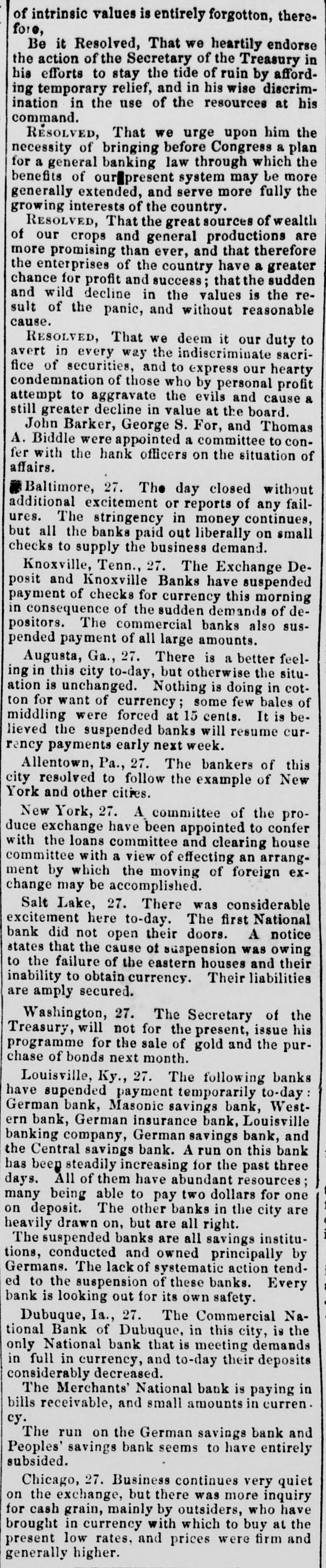 of intrinsic values is entirely forgotton, there. fore, Be it Resolved, That we heartily endorse the action of the Secretary of the Treasury in his efforts to stay the tide of ruin by affording temporary relief, and in his wise discrimination in the use of the resources at his command. RESOLVED, That we urge upon him the necessity of bringing before Congress a plan for a general banking law through which the benefits of our present system may be more generally extended, and serve more fully the growing interests of the country. RESOLVED, That the great sources of wealth of our crops and general productions are more promising than ever, and that therefore the enterprises of the country have a greater chance for profit and success; that the sudden and wild decline in the values is the result of the panic, and without reasonable cause. RESOLVED, That we deem it our duty to avert in every way the indiscriminate sacrifice of securities, and to express our hearty condemnation of those who by personal profit attempt to aggravate the evils and cause a still greater decline in value at the board. John Barker, George S. For, and Thomas A. Biddle were appointed a committee to confer with the hank officers on the situation of affairs. Baltimore, 27. The day closed without additional excitement or reports of any failures. The stringency in money continues, but all the banks paid out liberally on small checks to supply the business demand. Knoxville, Tenn., 27. The Exchange Deposit and Knoxville Banks have suspended payment of checks for currency this morning in consequence of the sudden demands of depositors. The commercial banks also suspended payment of all large amounts. Augusta, Ga., 27. There is a better feeling in this city to-day, but otherwise the situation is unchanged. Nothing is doing in cotton for want of currency; some few bales of middling were forced at 15 cents. It is believed the suspended banks will resume currency payments early next week. Allentown, Pa., 27. The bankers of this city resolved to follow the example of New York and other cities. New York, 27. A committee of the produce exchange have been appointed to confer with the loans committee and clearing house committee with a view of effecting an arrangment by which the moving of foreign exchange may be accomplished. Salt Lake, 27. There was considerable excitement here to-day. The first National bank did not open their doors. A notice states that the cause of suspension was owing to the failure of the eastern houses and their inability to obtain currency. Their liabilities are amply secured. Washington, 27. The Secretary of the Treasury, will not for the present, issue his programme for the sale of gold and the purchase of bonds next month. Louisville, Ky., 27. The following banks have supended payment temporarily to-day: German bank, Masonic savings bank, Western bank, German insurance bank, Louisville banking company, German savings bank, and the Central savings bank. A run on this bank has been steadily increasing for the past three days. All of them have abundant resources; many being able to pay two dollars for one on deposit. The other banks in the city are heavily drawn on, but are all right. The suspended banks are all savings institutions, conducted and owned principally by Germans. The lack of systematic action tended to the suspension of these banks. Every bank is looking out for its own safety. Dubuque, Ia., 27. The Commercial National Bank of Dubuque, in this city, is the only National bank that is meeting demands in full in currency, and to-day their deposits considerably decreased. The Merchants' National bank is paying in bills receivable, and small amounts in curren. cy. The run on the German savings bank and Peoples' savings bank seems to have entirely subsided. Chicago, 27. Business continues very quiet on the exchange, but there was more inquiry for cash grain, mainly by outsiders, who have brought in currency with which to buy at the present low rates, and prices were firm and generally higher.